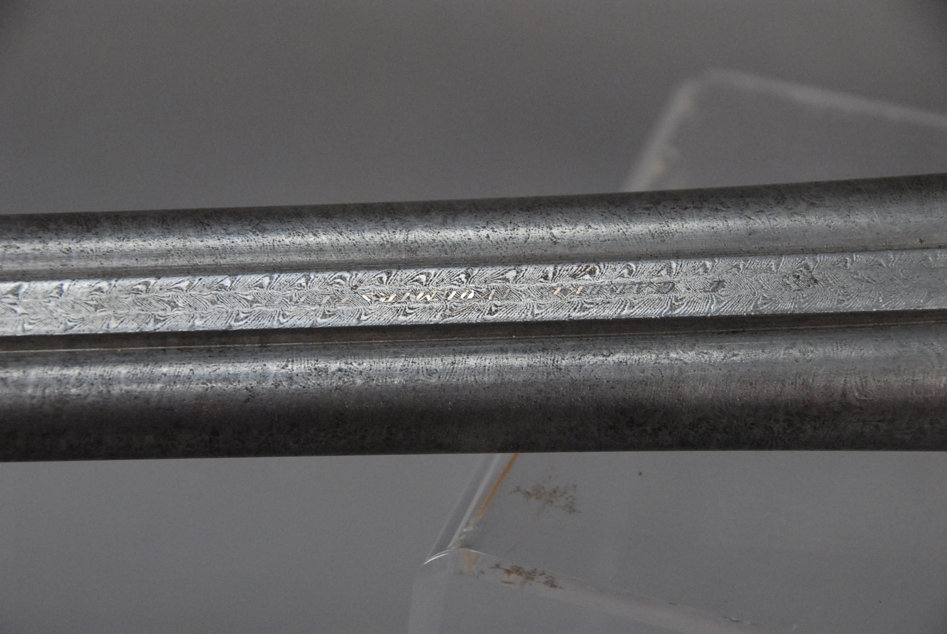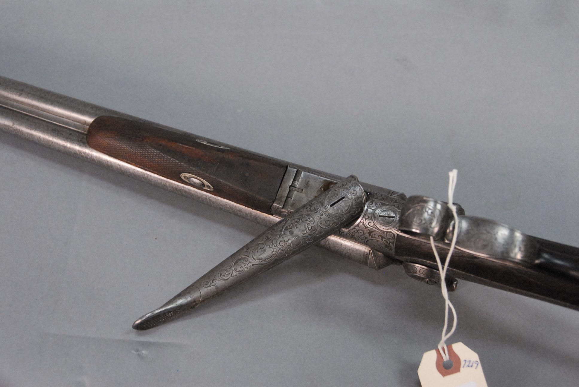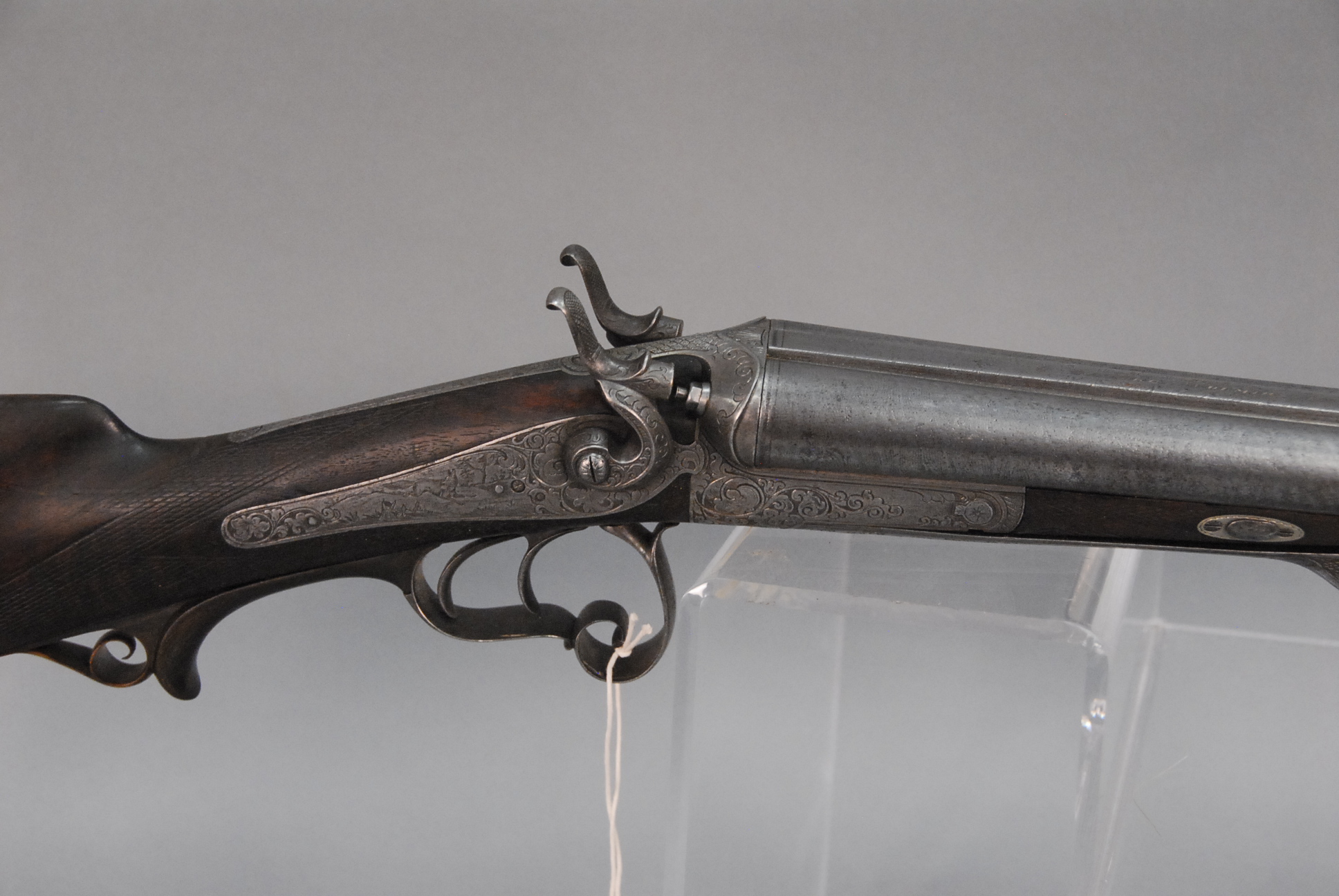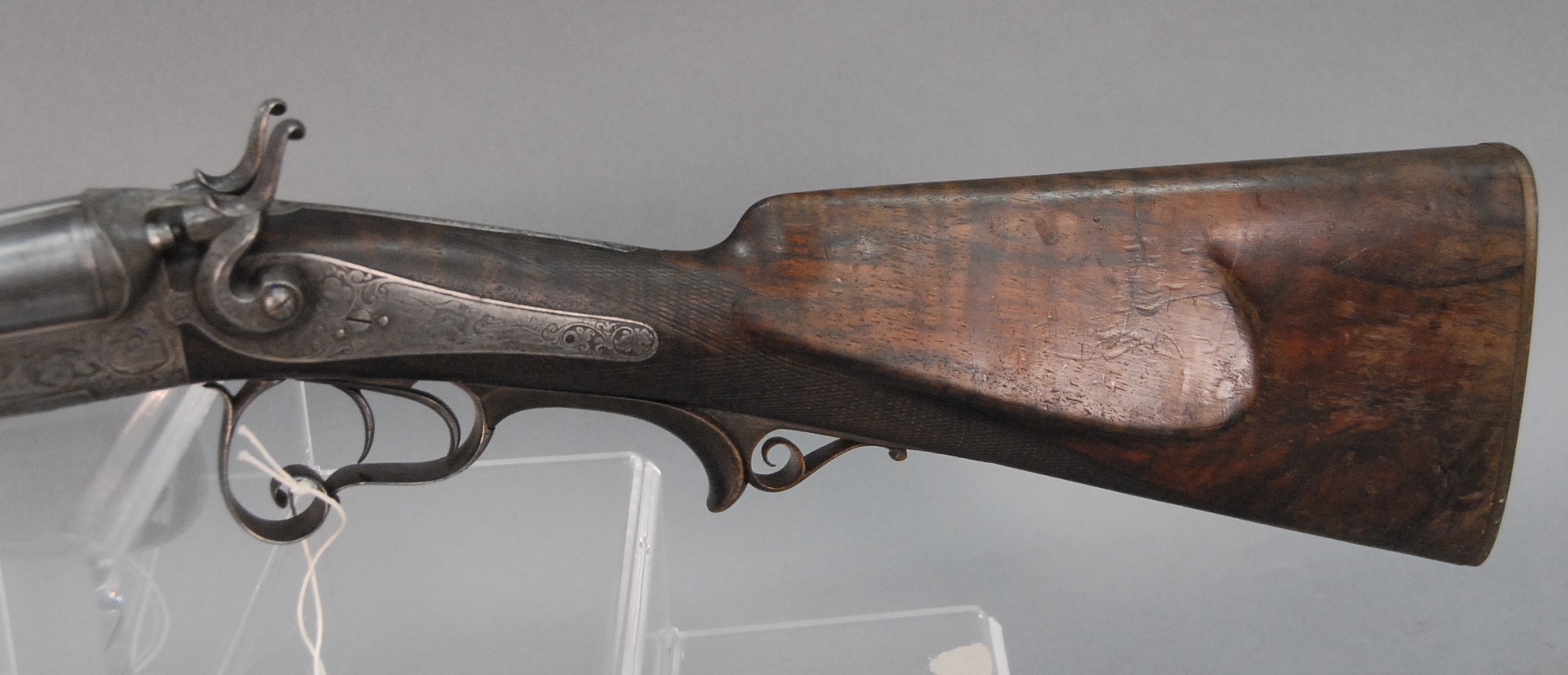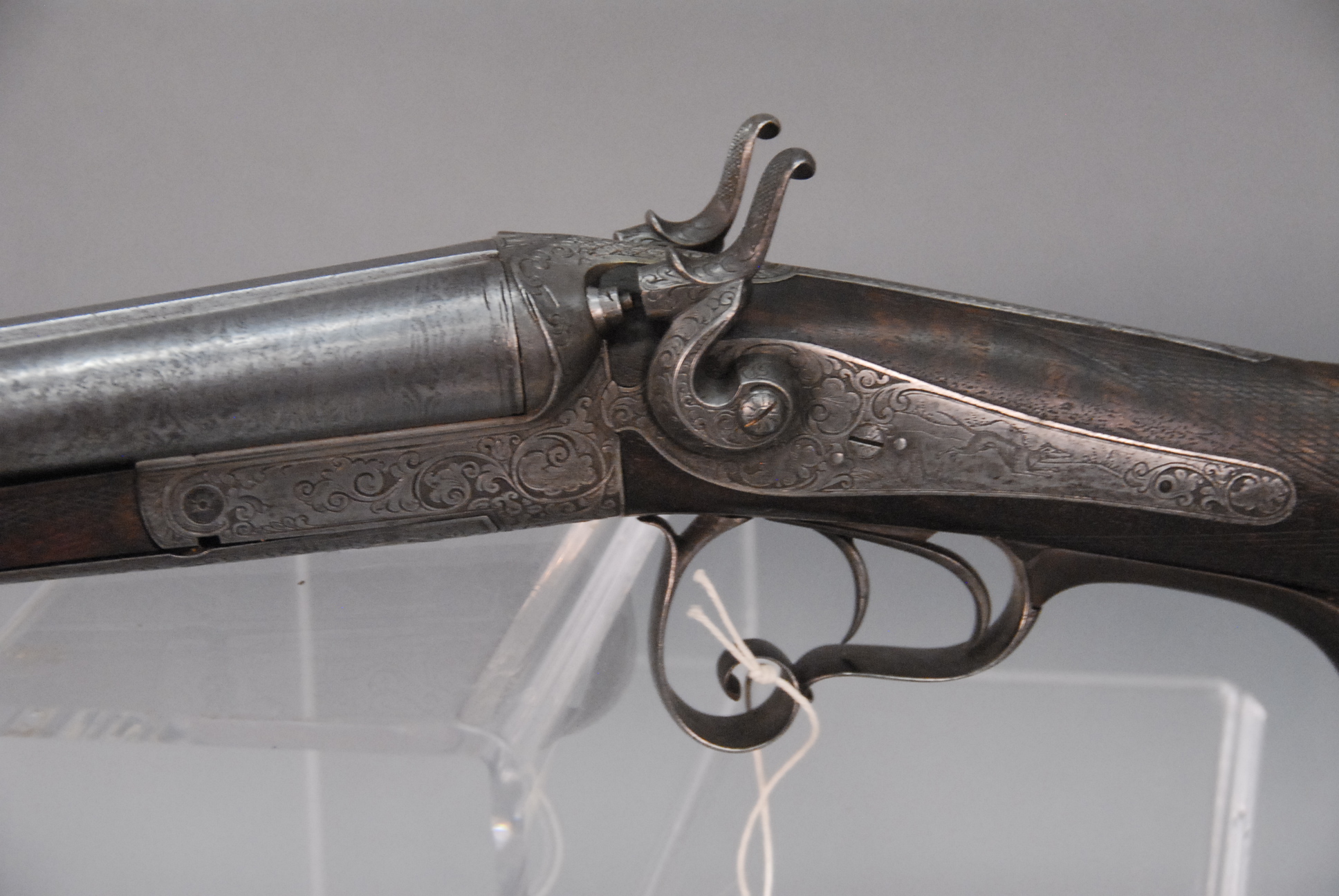 Lot 25: Gaedke double barrel shot gun, percussion, 16 gauge with Damaskus barrel marked F. Gaedke Wolmirstedt, double trigger and plated, en…