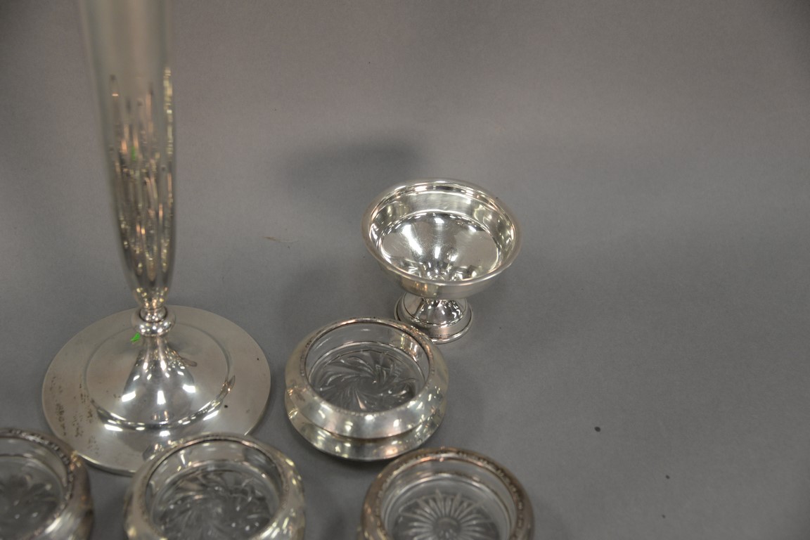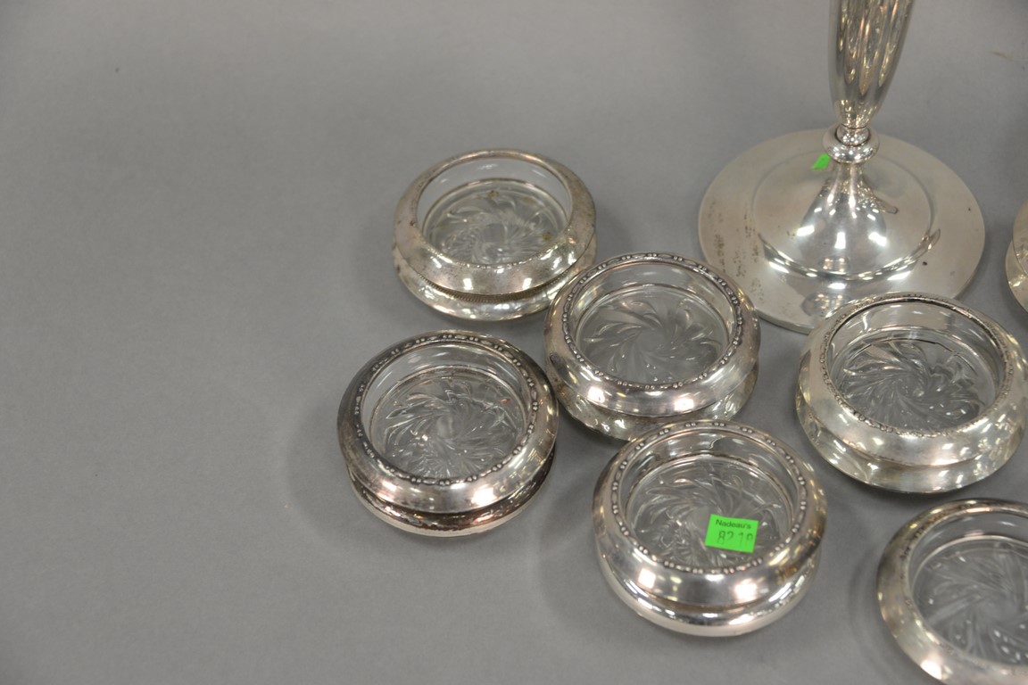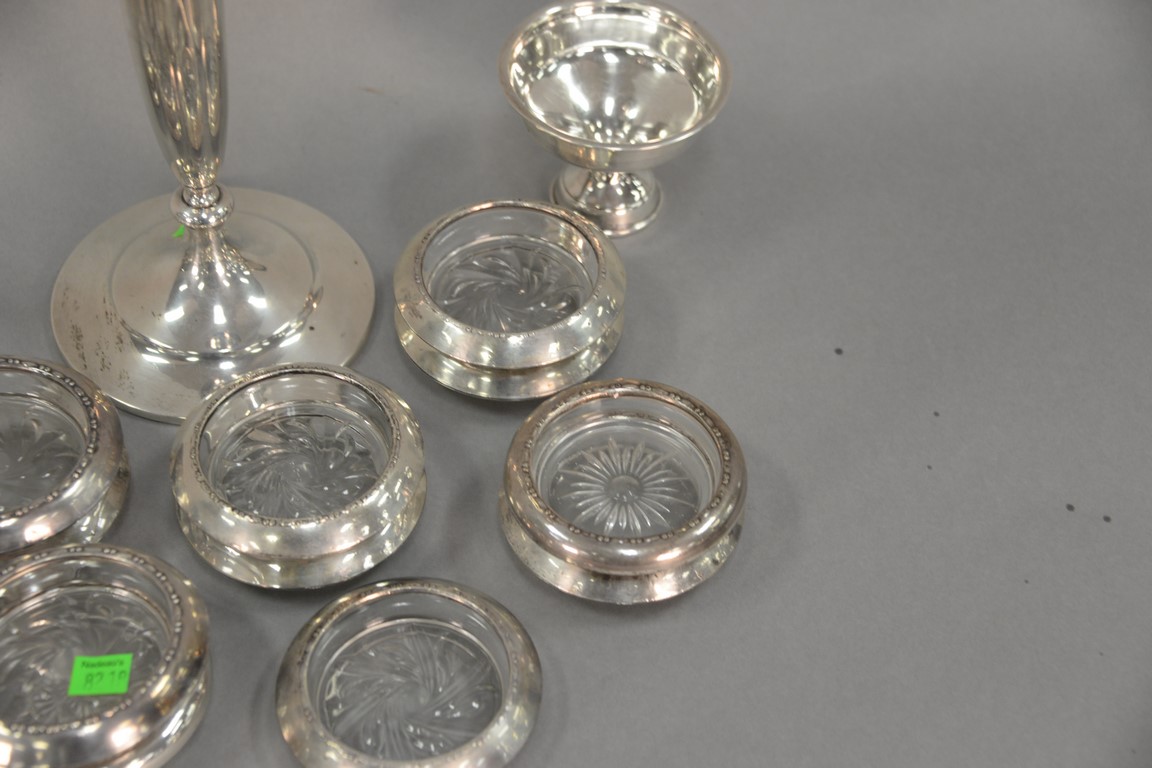 Lot 25: Group of weighted sterling silver to include a Kirk & Sons trumpet vase, small footed bowl, and fifteen coasters. ht. 16 1/2in.