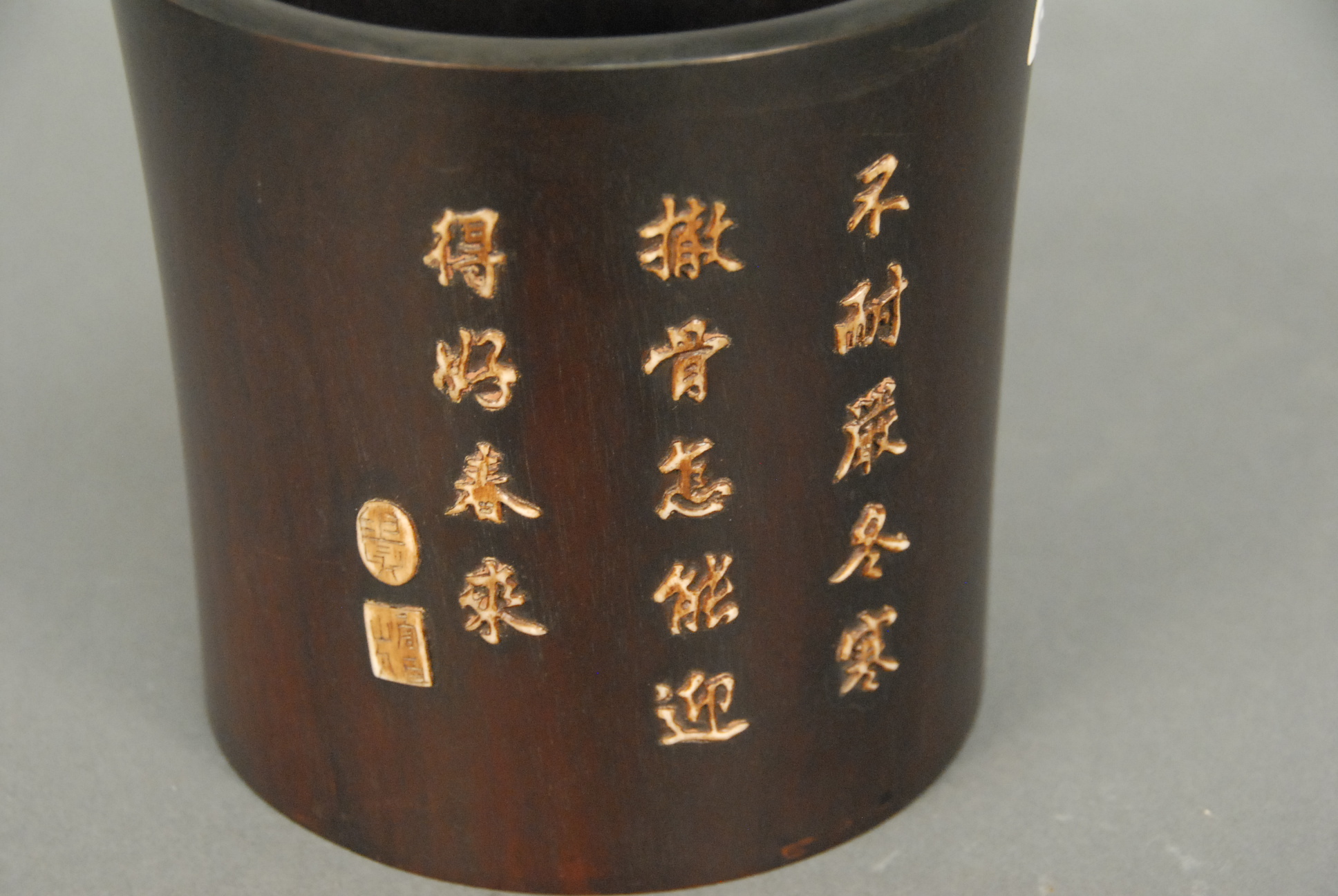 Lot 25: Hardwood brush pot mounted with coral, hard stone, and mother of pearl made into flowers and birds having character marks made of bo…