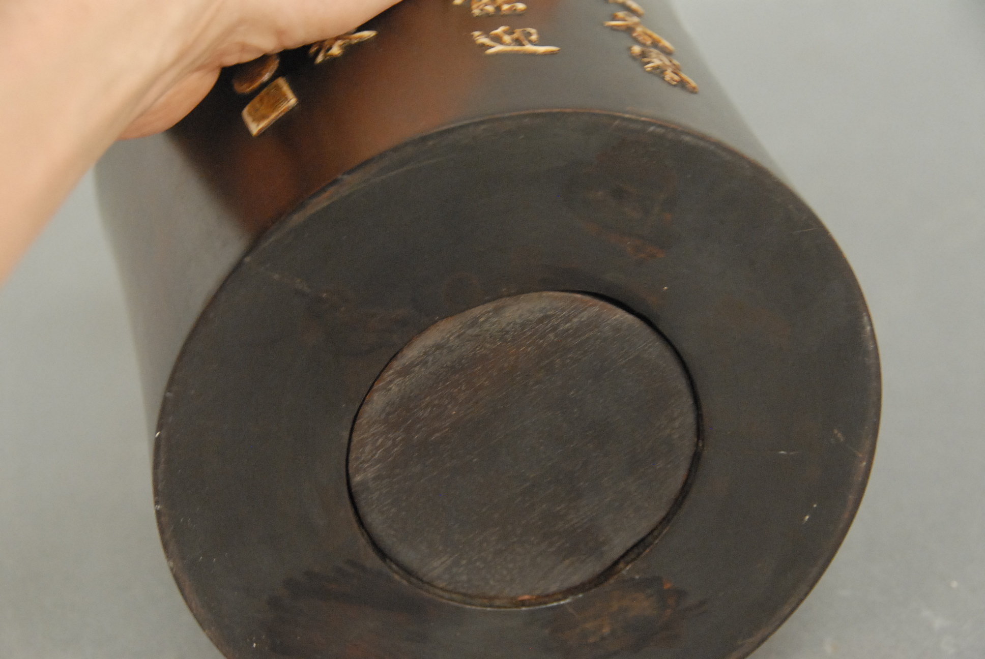 Hardwood brush pot mounted with coral, hard stone, and mother of pearl made into flowers and birds having character marks made of bone on back, ht. 6 1/2in. dia. 6 1/2in..