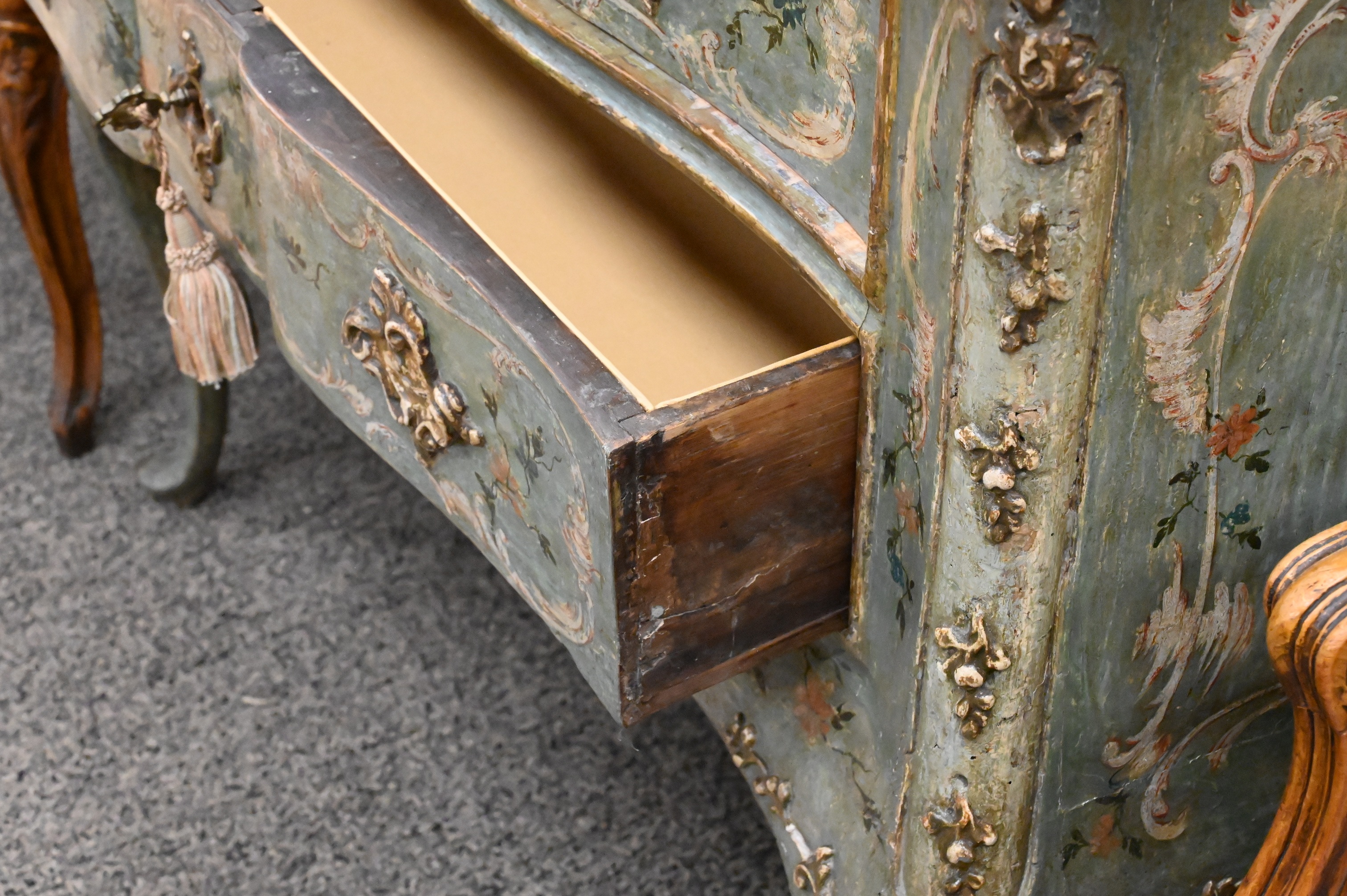 having serpentine rectangular top painted to simulate variegated marble above two long drawers decorated with floral sprays and scrollwork on a pale green ground, framed by molded borders and shaped apron; raised on cabriole legs, 18th century
