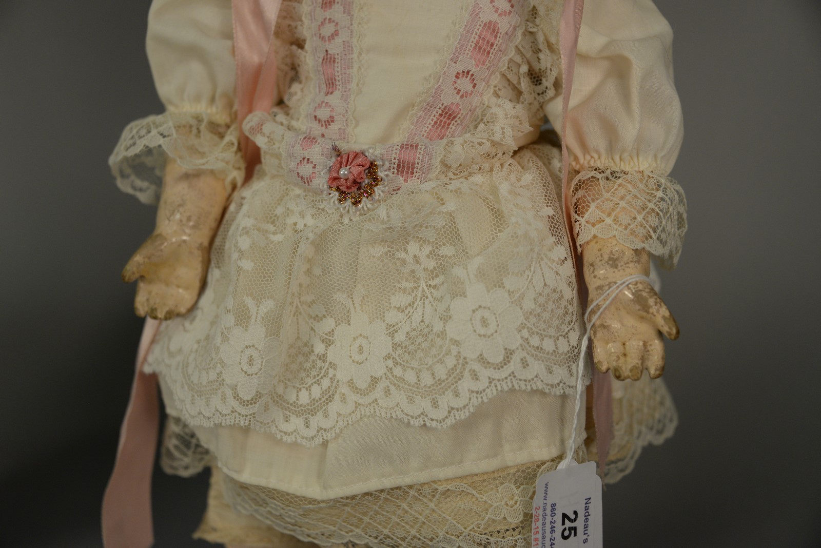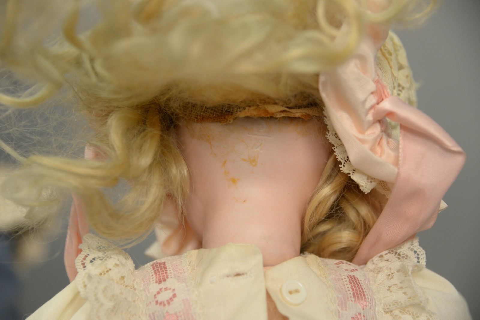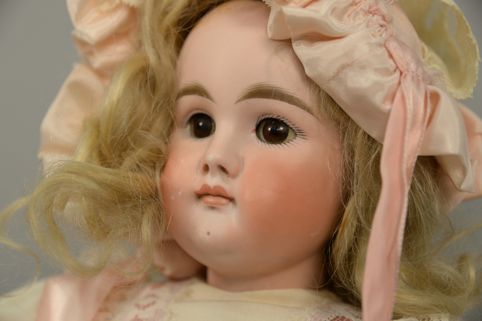 Kestner close mouth bisque head doll, cheek rubs. lg. 17 in.