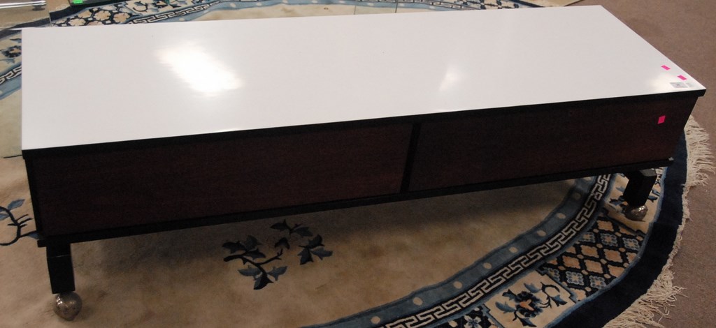 Mid-Century two drawer coffee table with white formica top, lg. 59in. ht. 18in. wd. 18in.