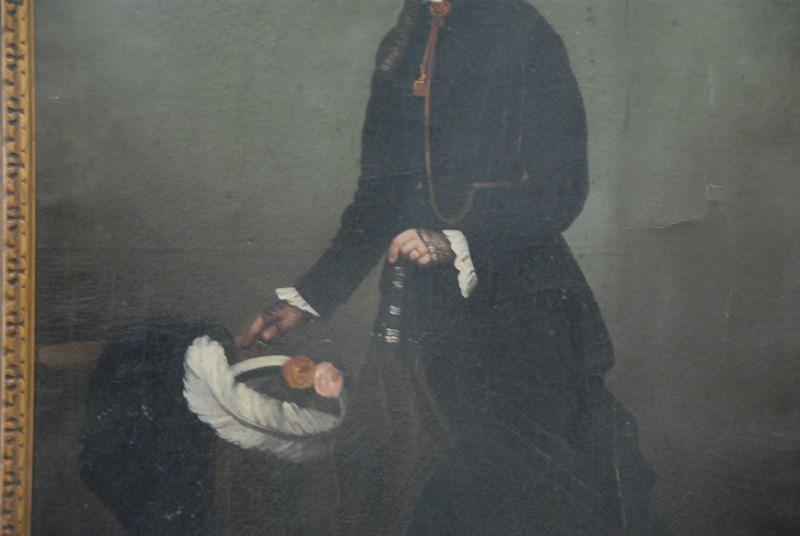 Lot 25: Oil on canvas portrait of standing woman in black, 18th-19th century, unsigned, restretched and relined, 24 x 18.