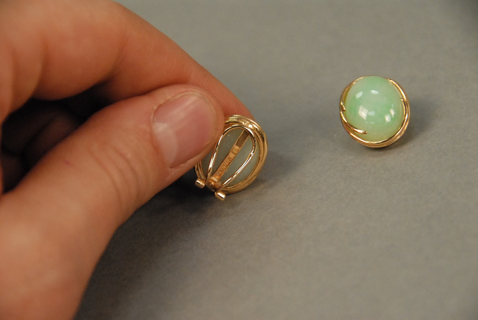 Lot 25: Pair of 14K gold earrings with clip fittings, each set with cabochon cut pale jade, marked Gump’s. lg. 3/4 in. Provenance: Property from a Private Collection Sold for the Benefit of the Virginia Historical Society.
