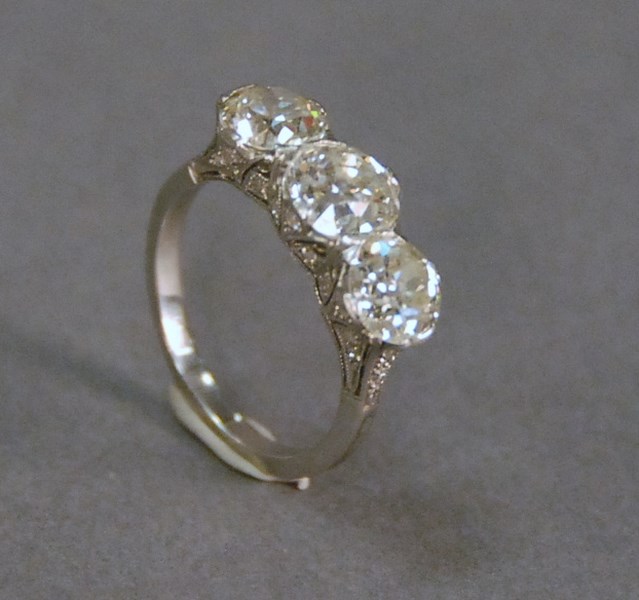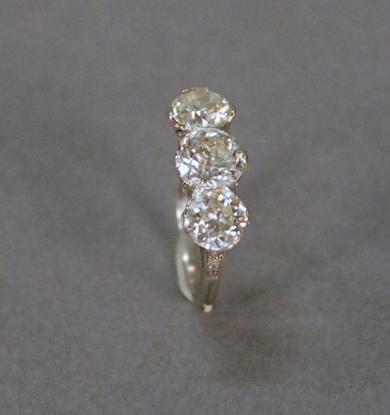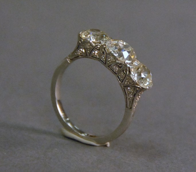 Lot 25: Platinum three stone diamond ring with filigree undercarriage, all of the diamonds are European cut, center diamond measures 7.60 x 7.50 x 4.90mm and weighs approximately 1.79ct total weight by formula, one side diamond measures 6.72 x 6.68 x 3.89 an