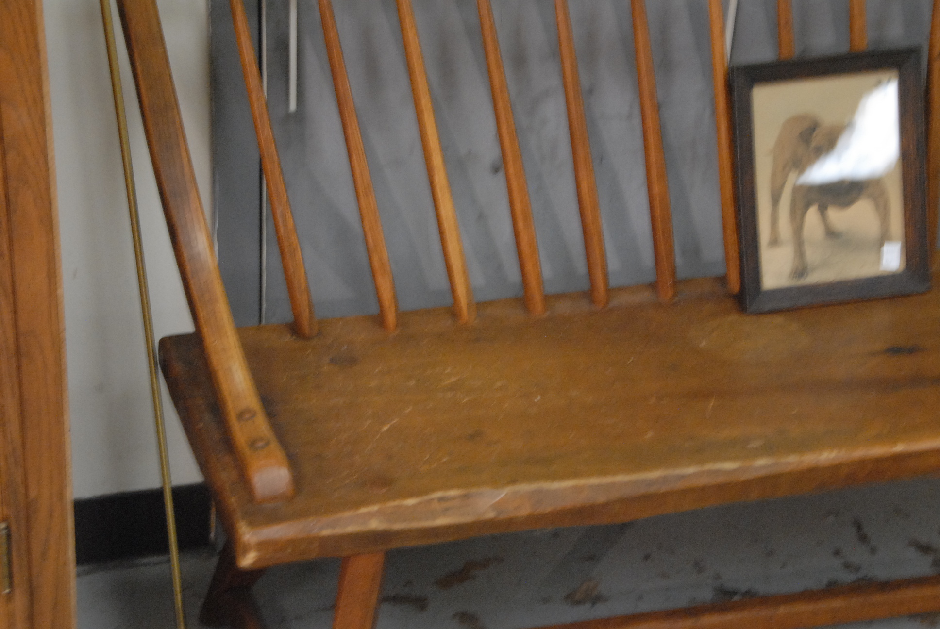 Lot 25: Rustic Windsor style bench with a plank seat and shaped spindles across the back made by Hunt Country Furniture of Wingdale, NY, cir…