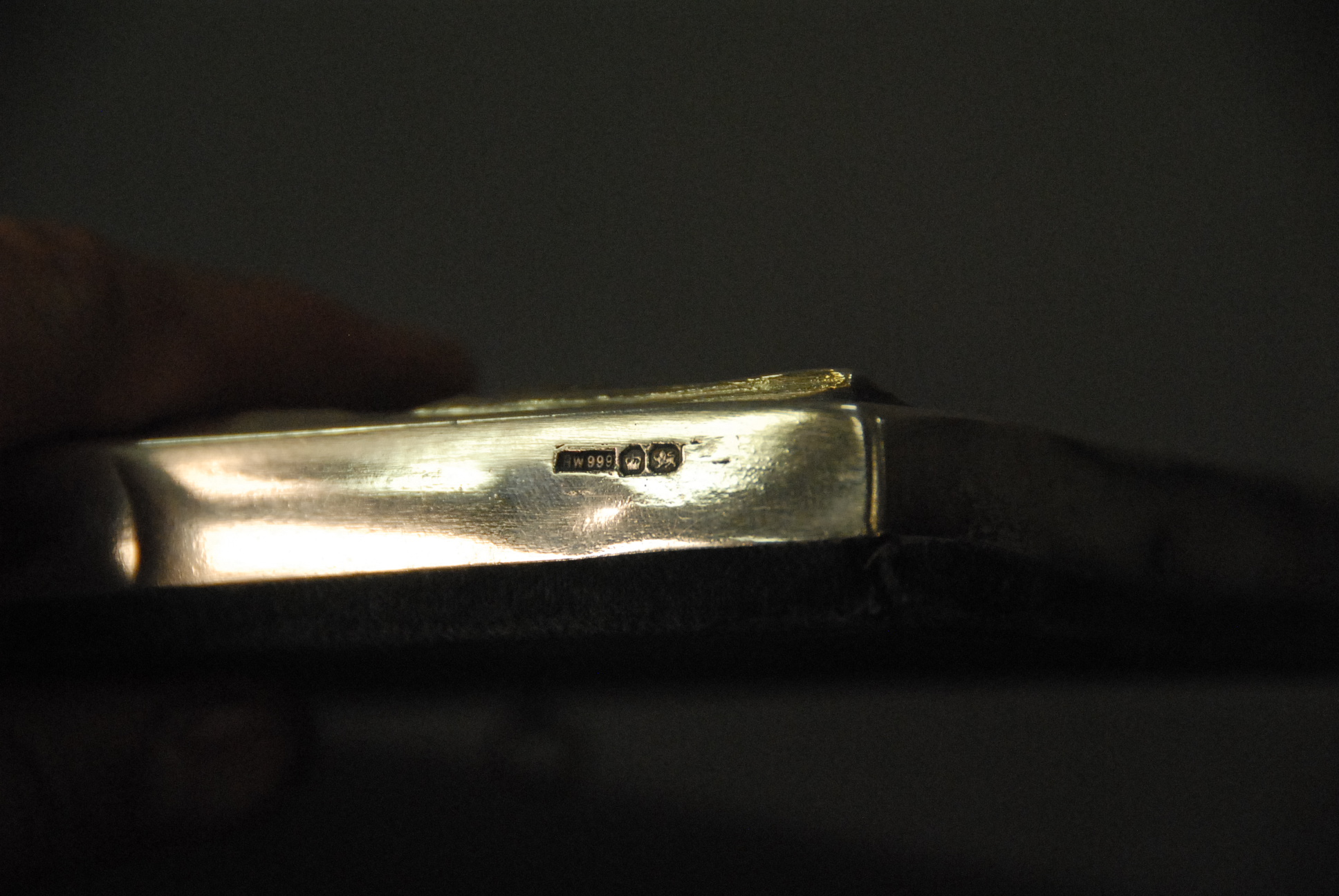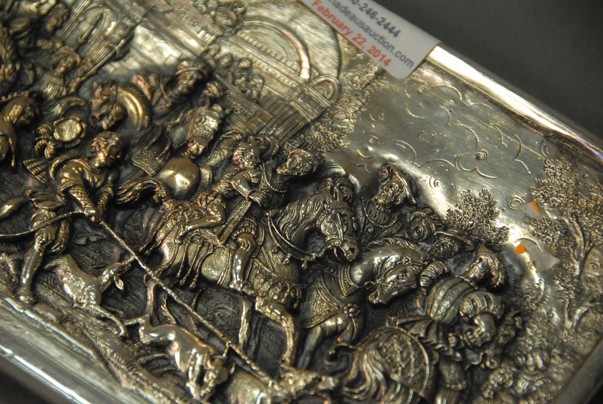 Lot 25: Silver embossed plaque of Continental scene with knights, horses, peasants, and dogs marked HW 999 with crown and lion.