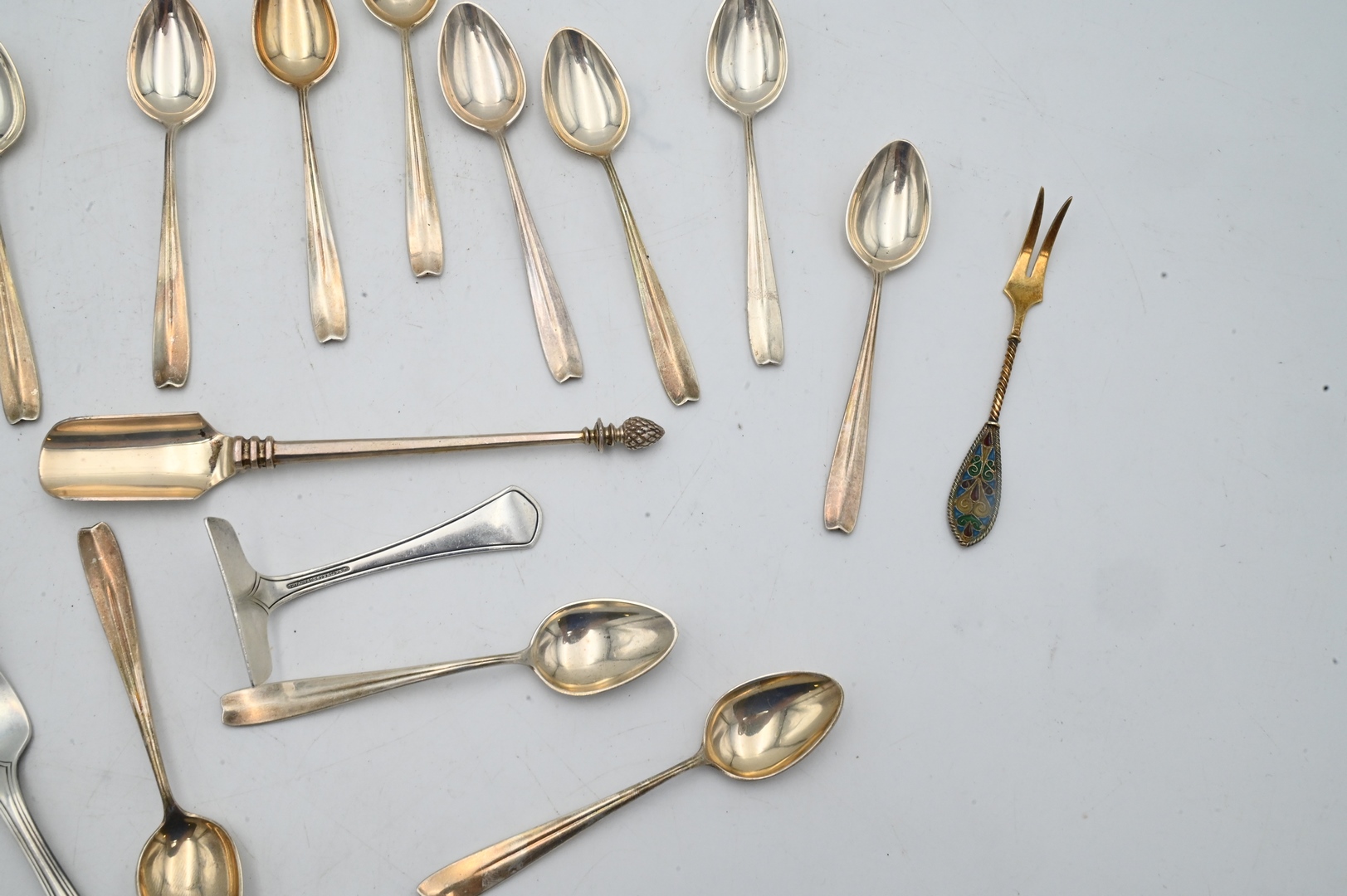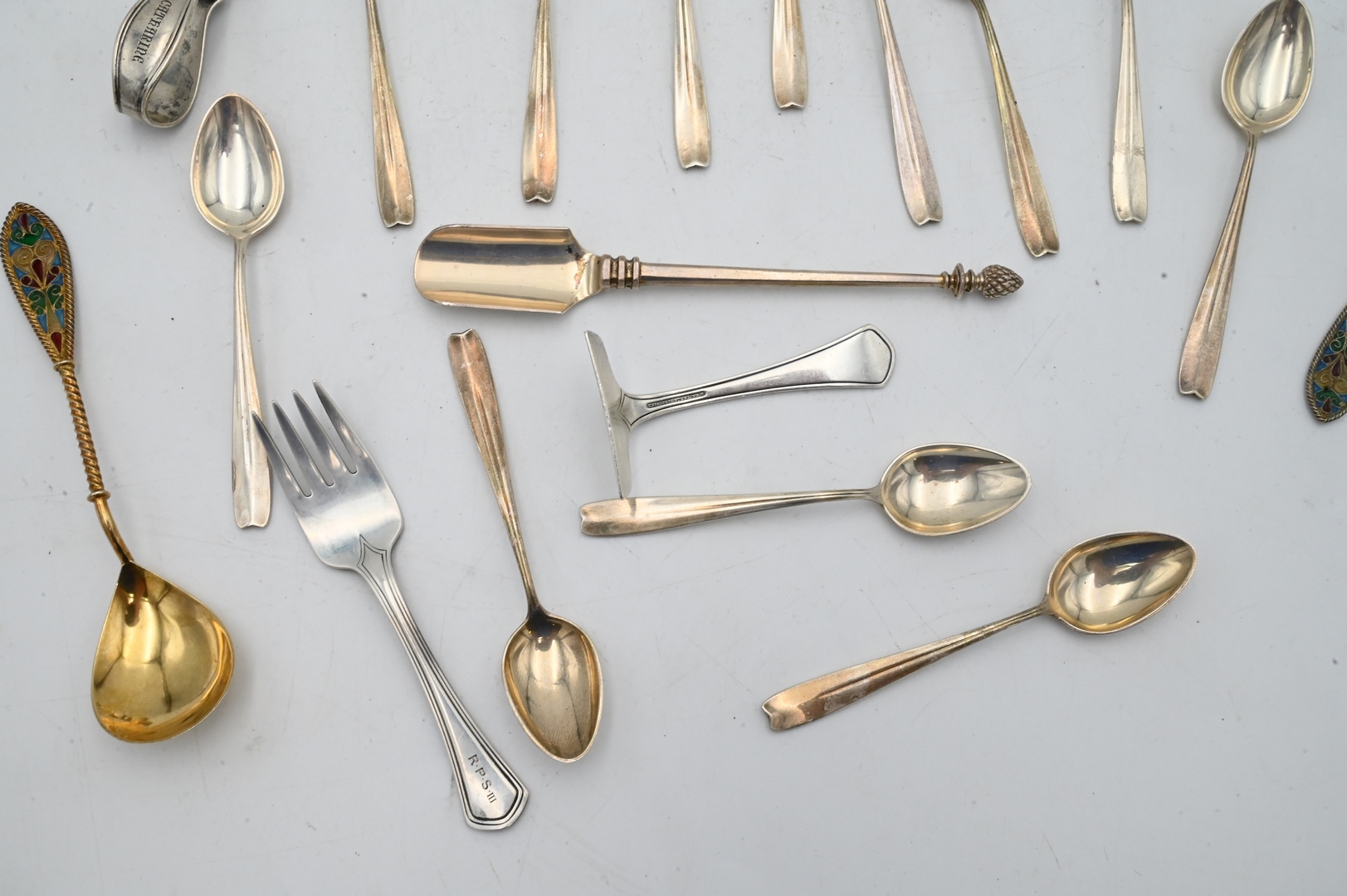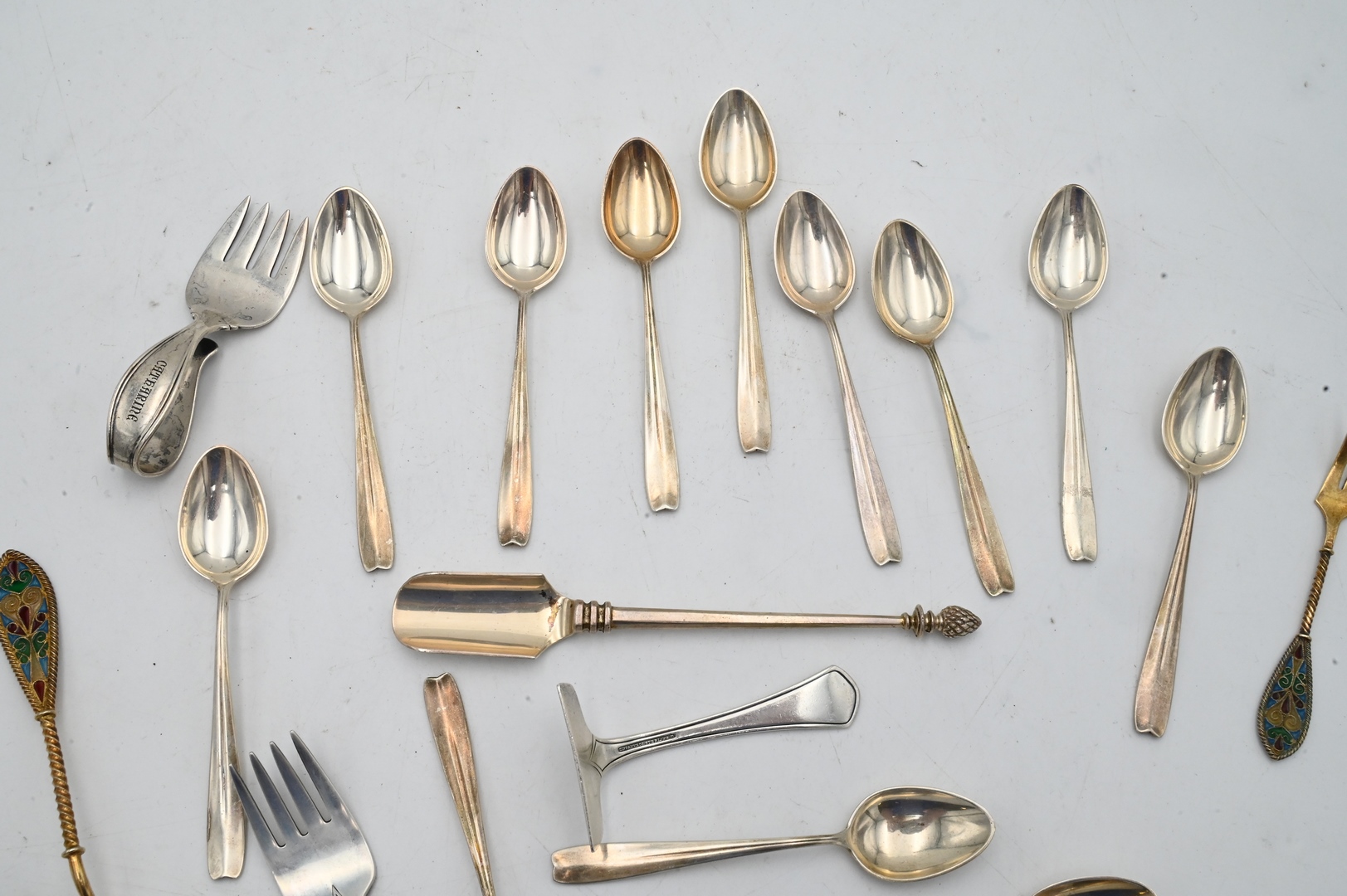 Silver Lot, to include Tiffany & Company Sterling Silver Flatware, to include a set of spoons, miscellaneous pieces, along with an enameled fork and spoon (not Tiffany & Company), 11 t.oz.