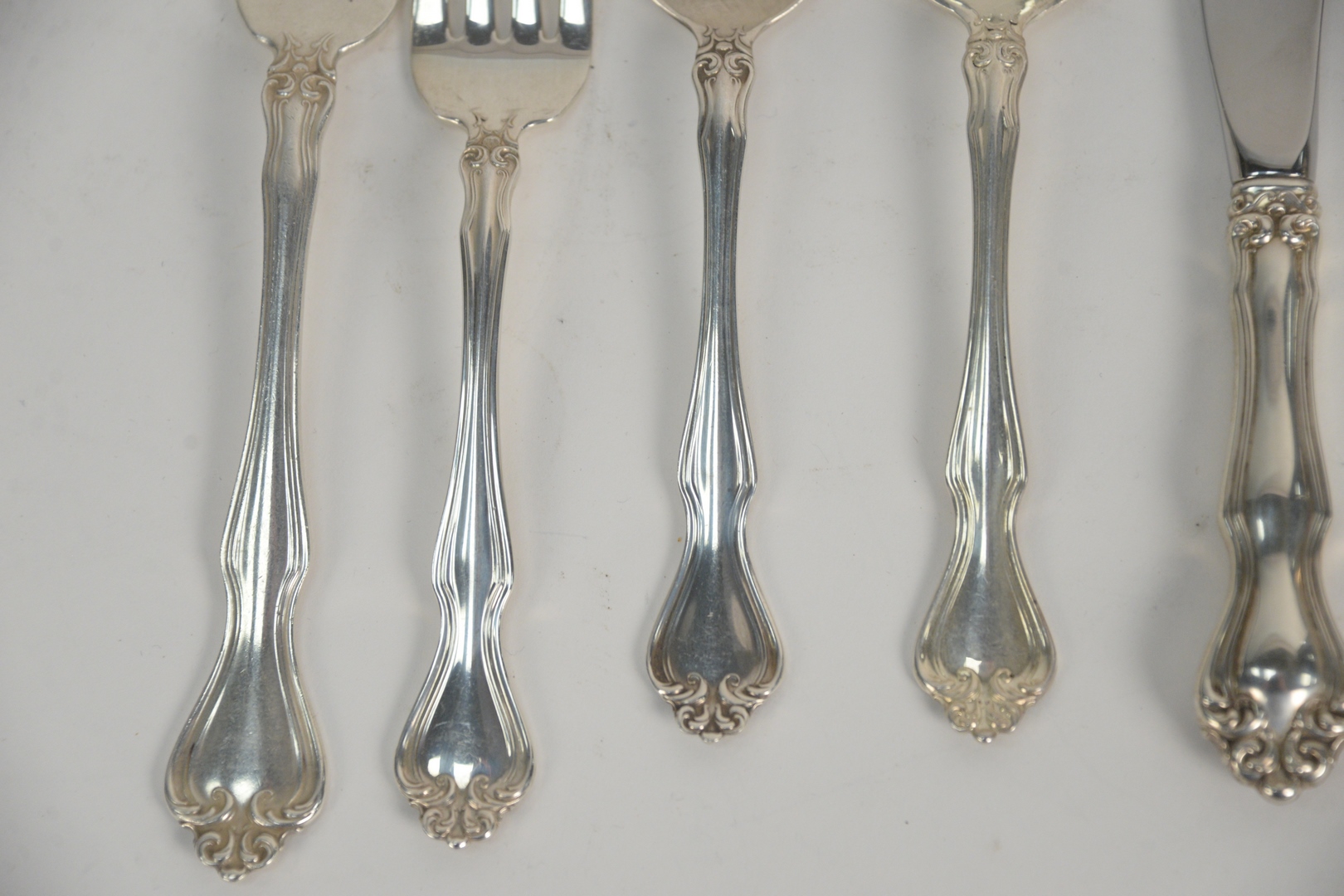 Sixty Piece Westmoreland Sterling Silver Flatware, to include ten luncheon forks, ten dinner forks, nine soup spoons, fifteen teaspoons, four serving pieces, ten dinner knives, two butter knives, 53 t.oz. plus 13 handles.
