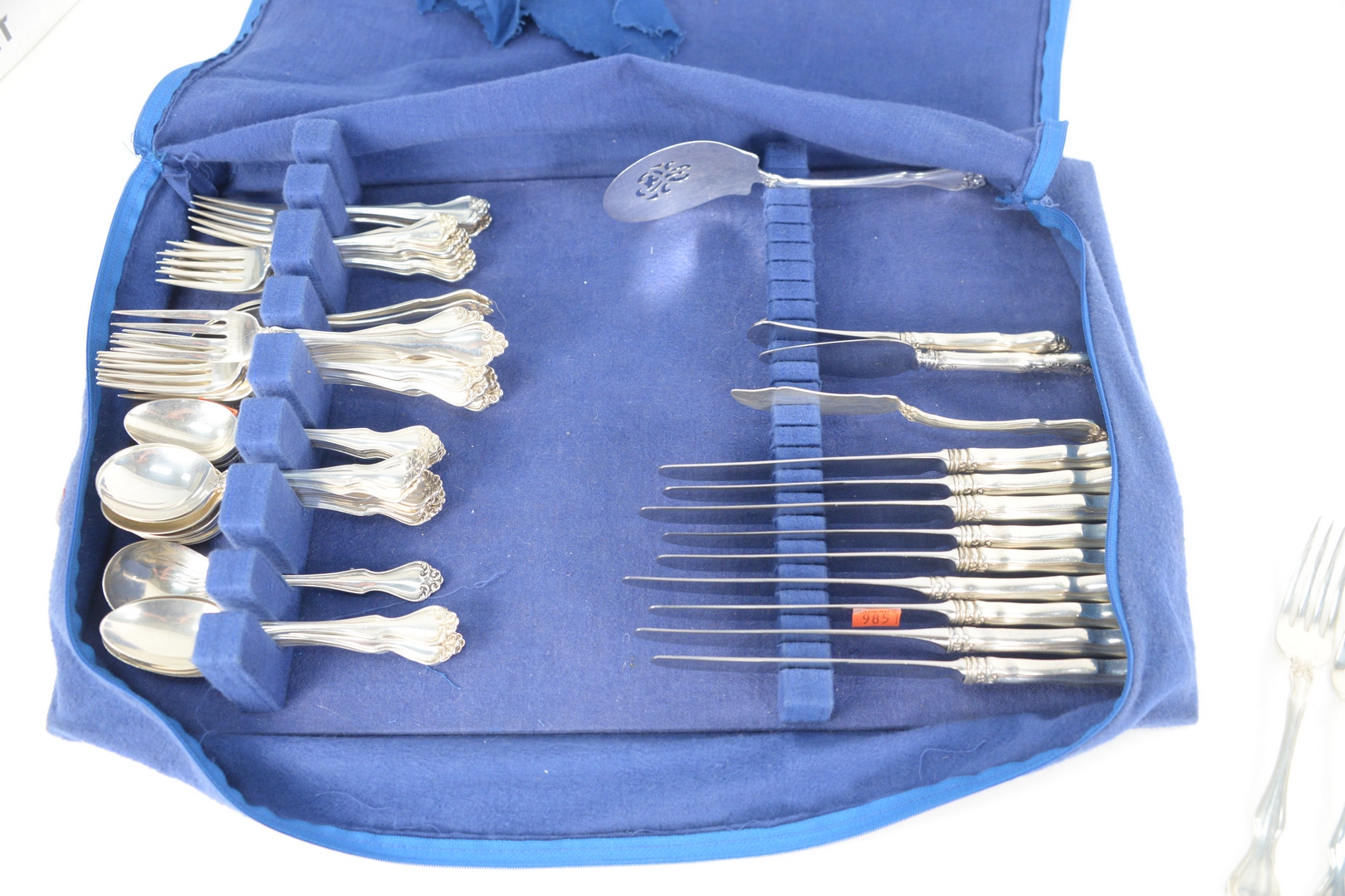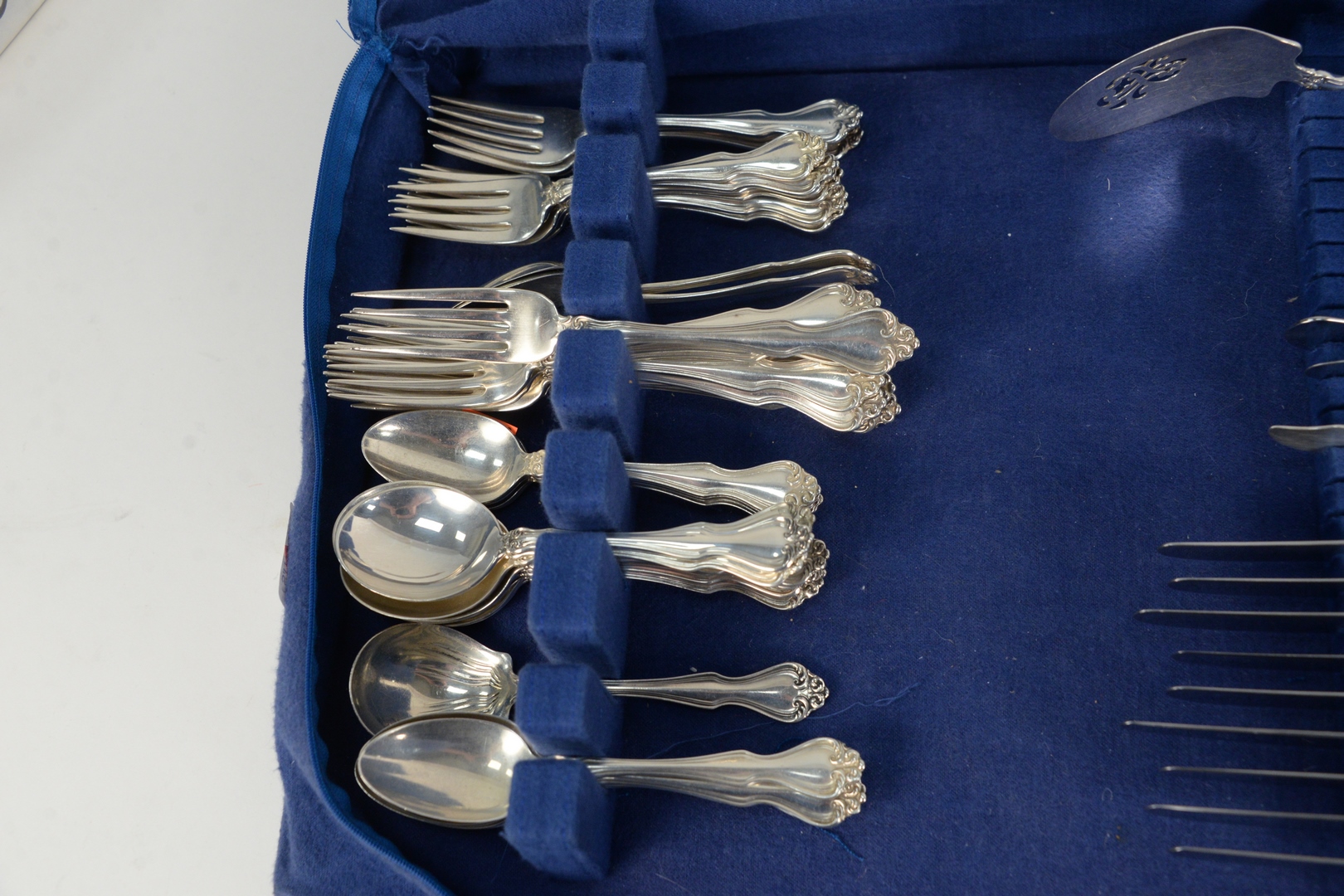 Lot 25: Sixty Piece Westmoreland Sterling Silver Flatware, to include ten luncheon forks, ten dinner forks, nine soup spoons, fifteen teaspoons, four serving pieces, ten dinner knives, two butter knives, 53 t.oz. plus 13 handles.