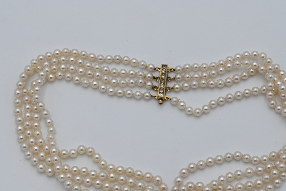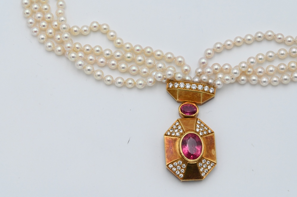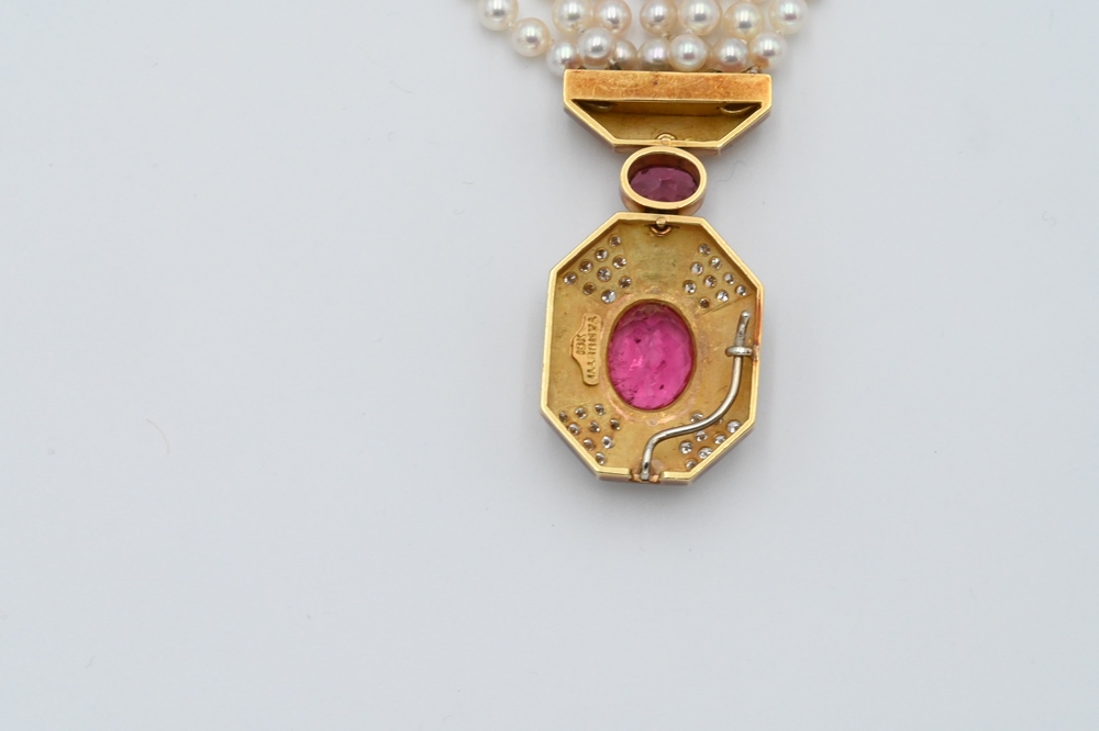 Lot 25: Tambetti 18 Karat Gold Pendant, on necklace of four strands of pearls, pendant set with two oval pink stones and small diamonds, pea…