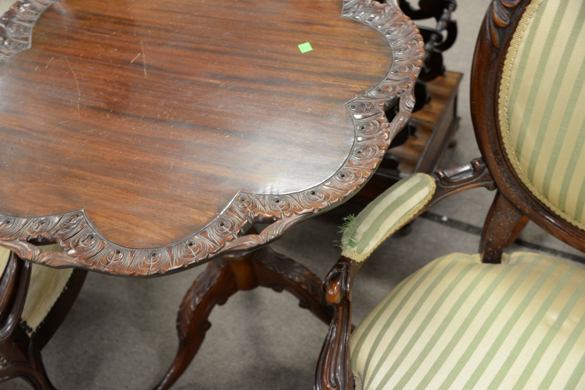 Lot 25: Three piece lot to include two Victorian gentleman’s chairs and mahogany tip table ht. 31in., dia. 29in.