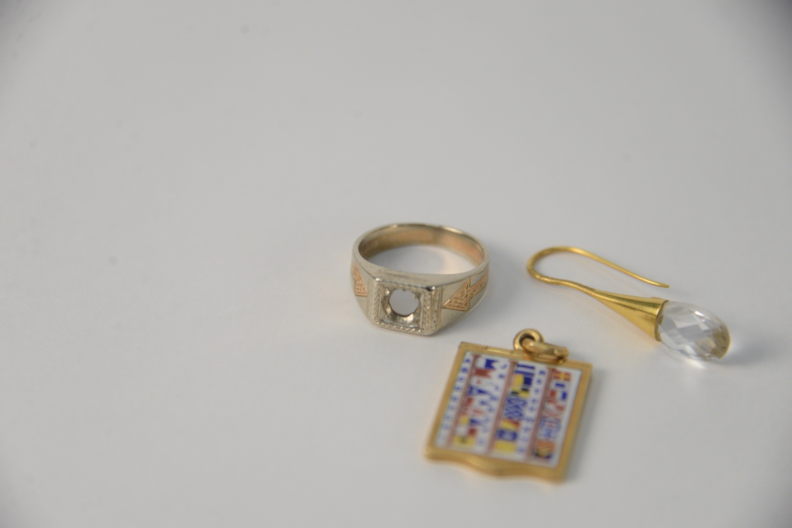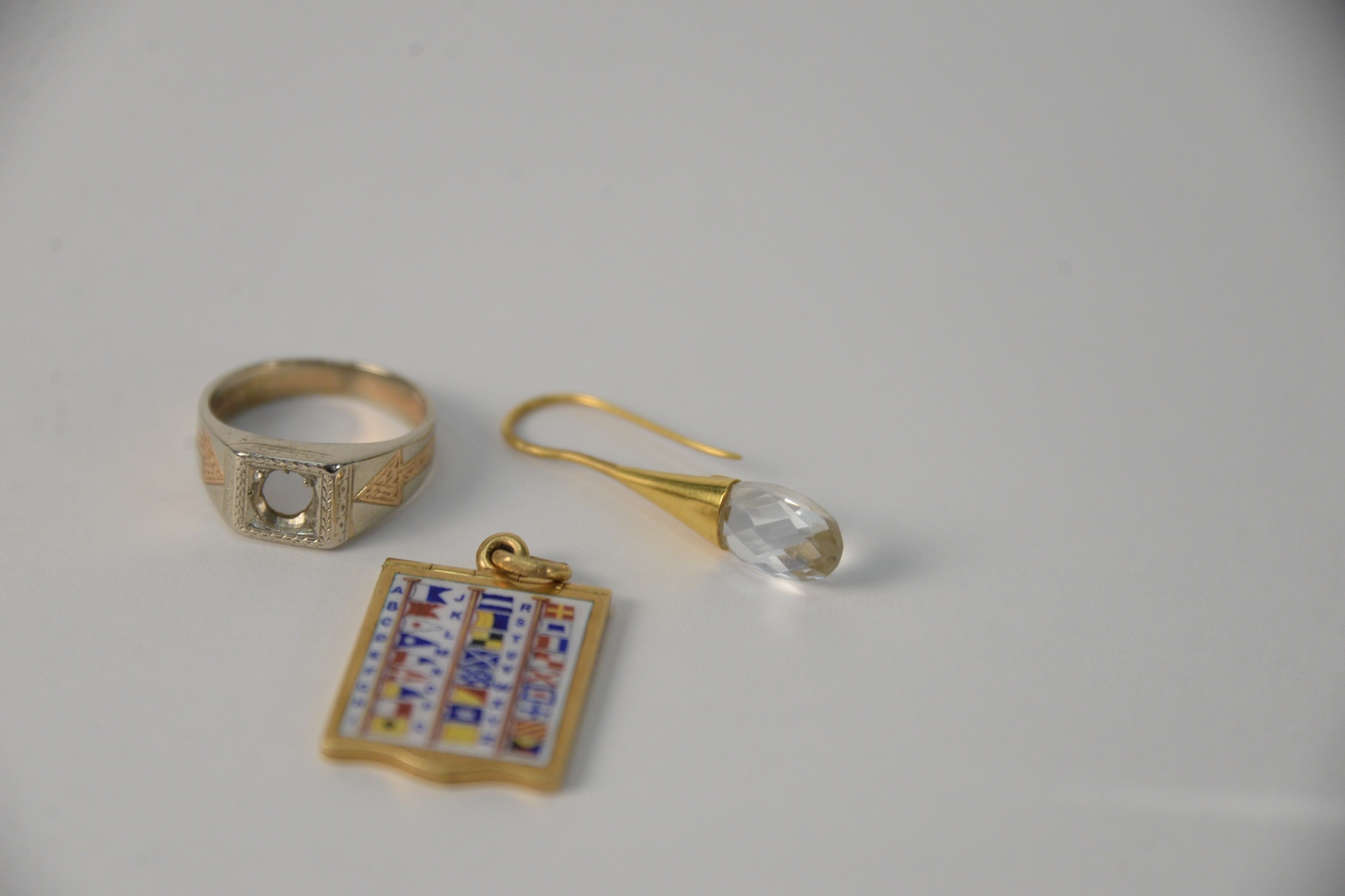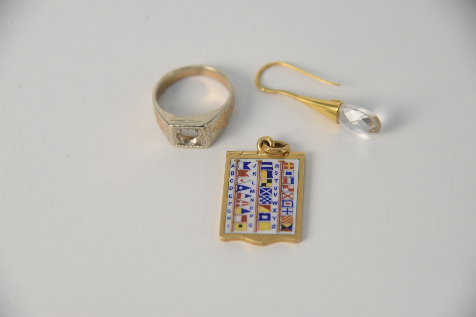 Lot 25: Three Piece Mixed Lot, to include 18 Karat and 14 Karat white and yellow gold ring, 18 karat emerald two-part medallion, boat flags, along with one earring, total weight 20.4 grams.