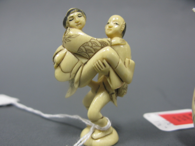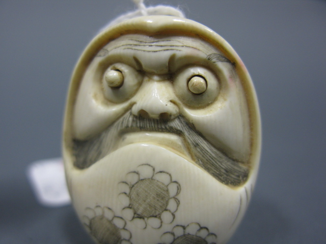 Two carved ivory netsukes one of standing and carrying position and one carved head of a man with moving eyes.