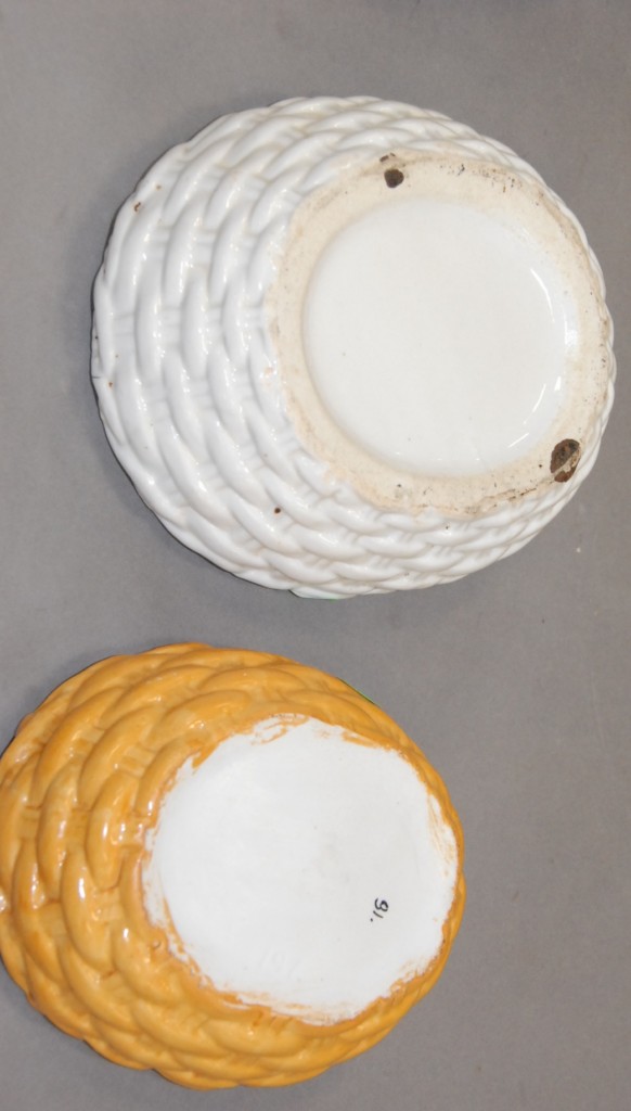 Two Staffordshire hens on baskets.