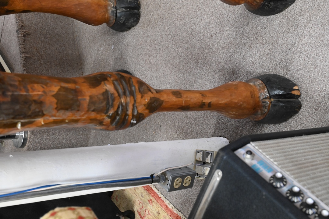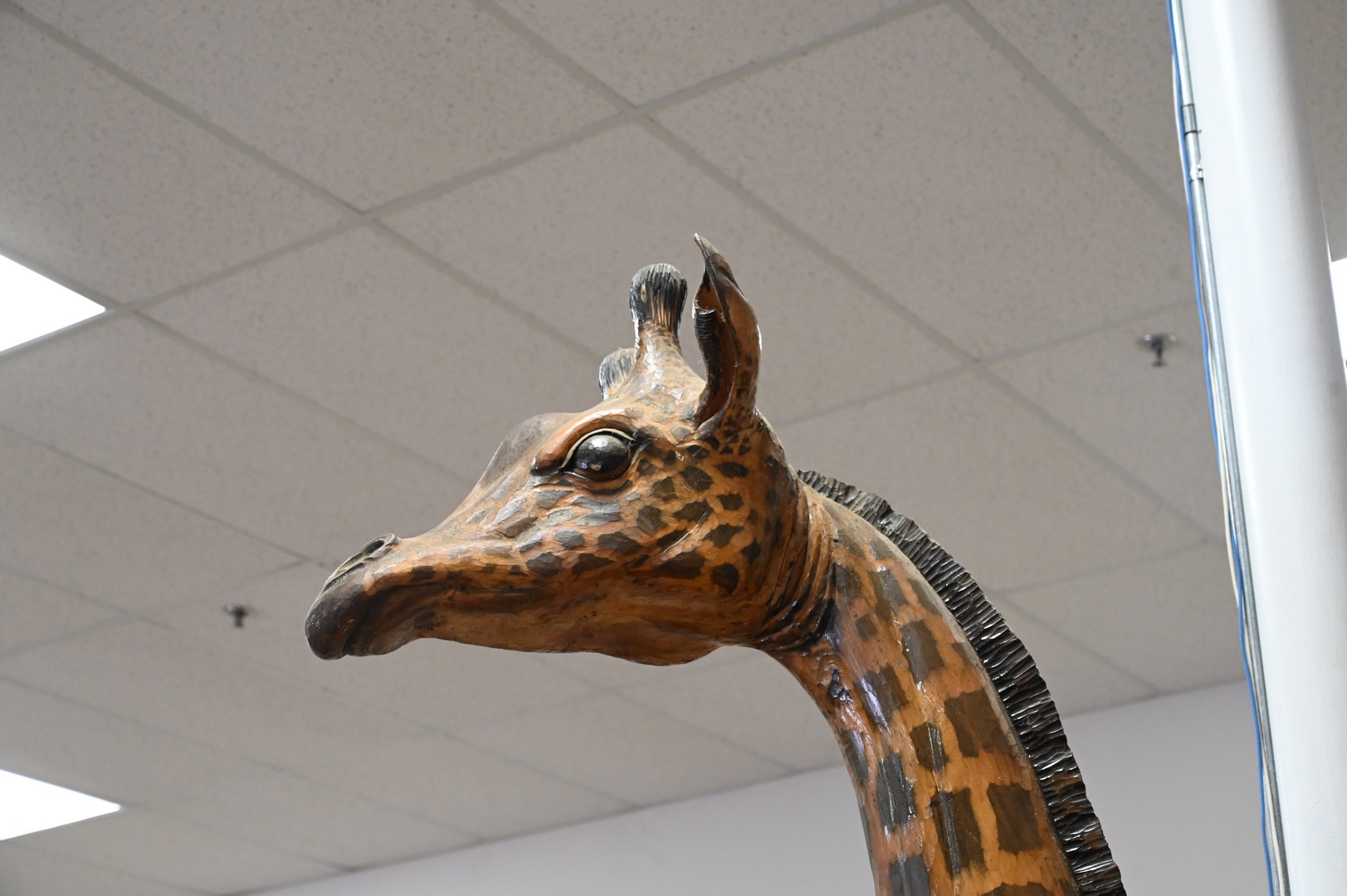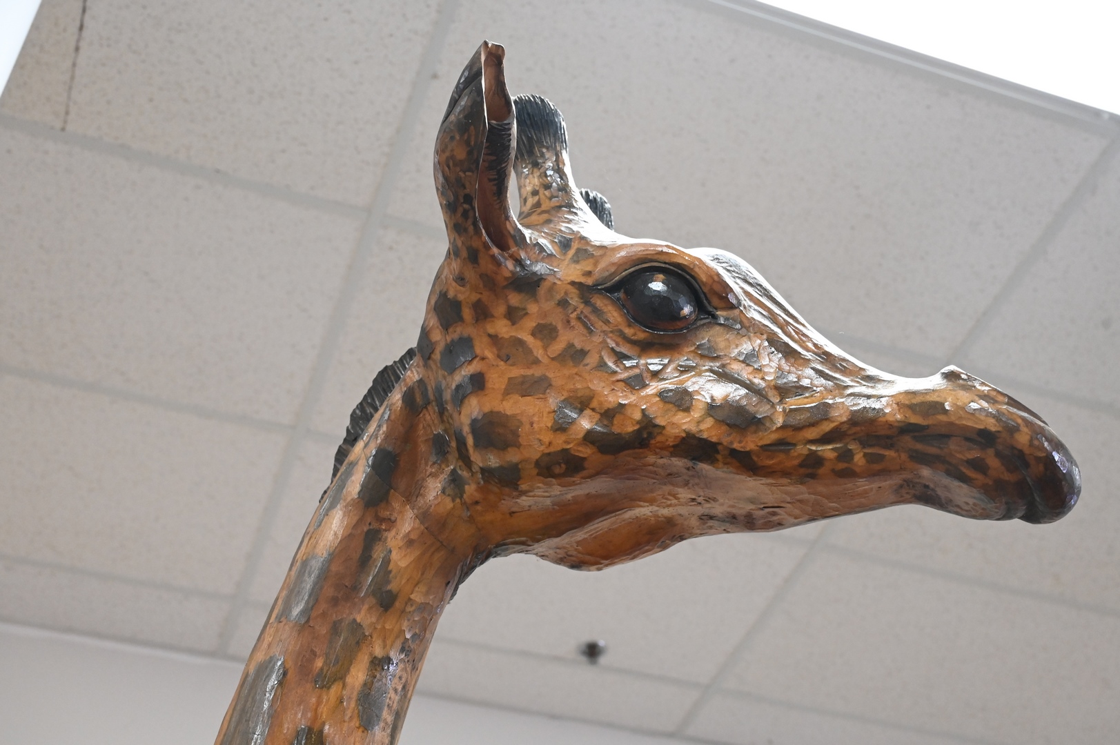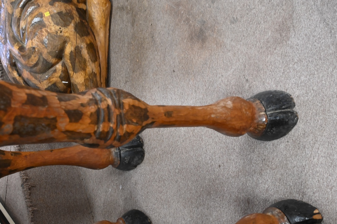 Art Ritchie Custom Hand Carved Life Size Giraffe, having polychrome finish, repair to legs, height 108 inches, length 50 inches, depth 26 inches.