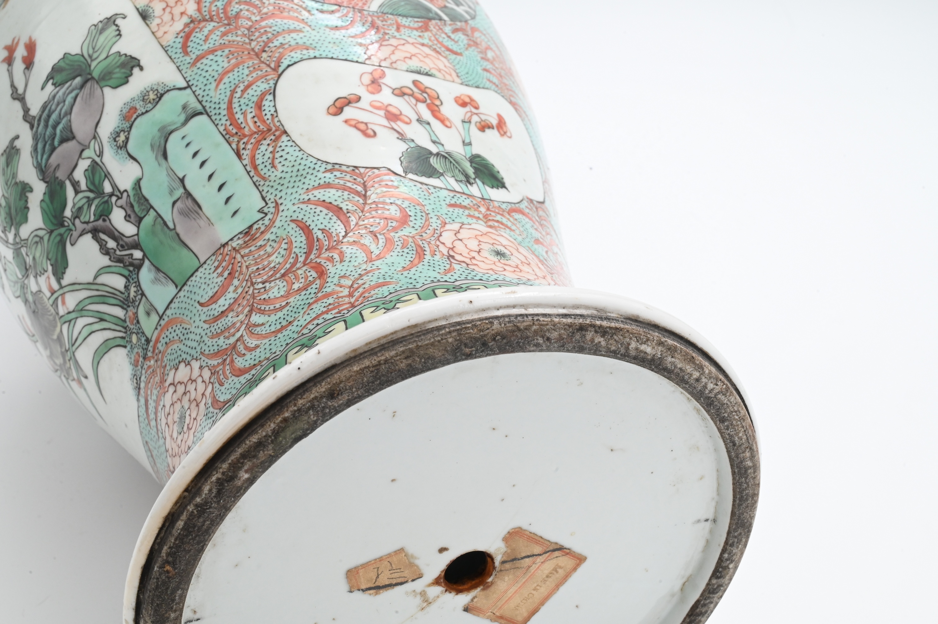 decorated in classic Kangxi style with cartouches of ascending carp, kirin, prunus and peoni on green stippled base overlayed with orange bamboo leaves, drilled and unmarked glazed base, height 18 inches