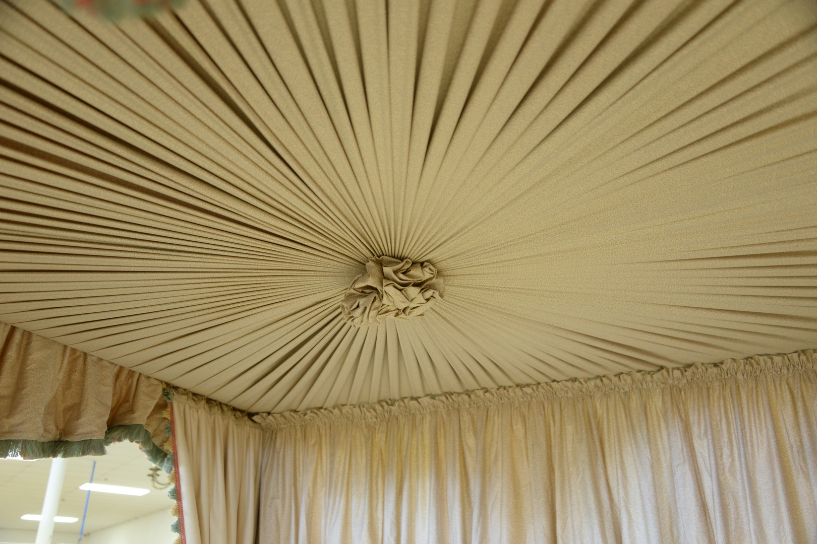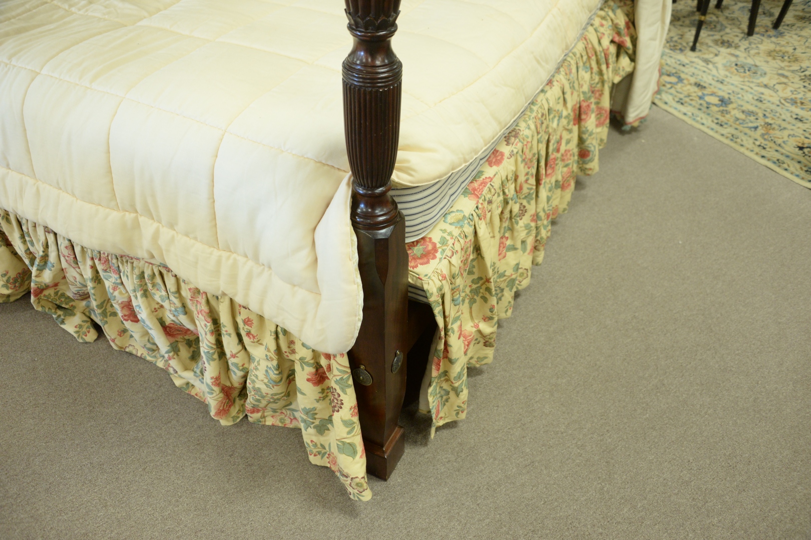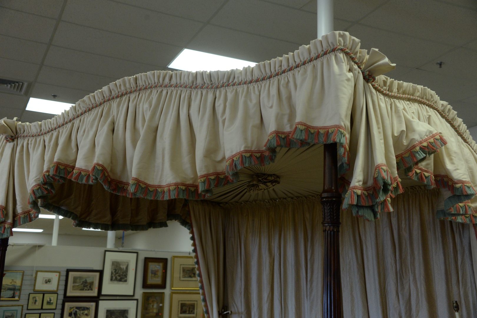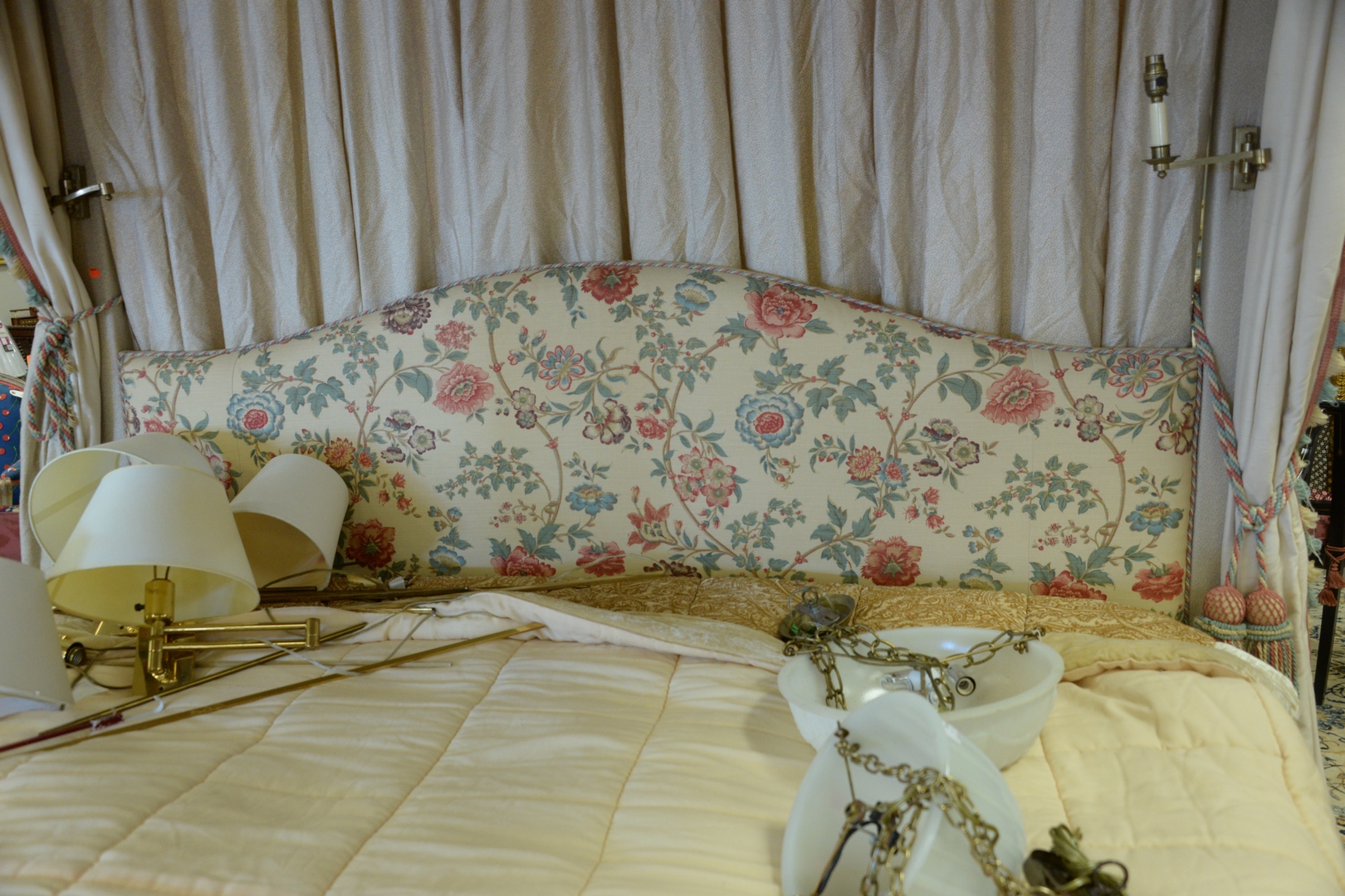 Lot 250: Custom Made King Size Canopy Bed, with Bennison upholstery and custom Epoc mattress and box spring, with brass retractable lamps mou…