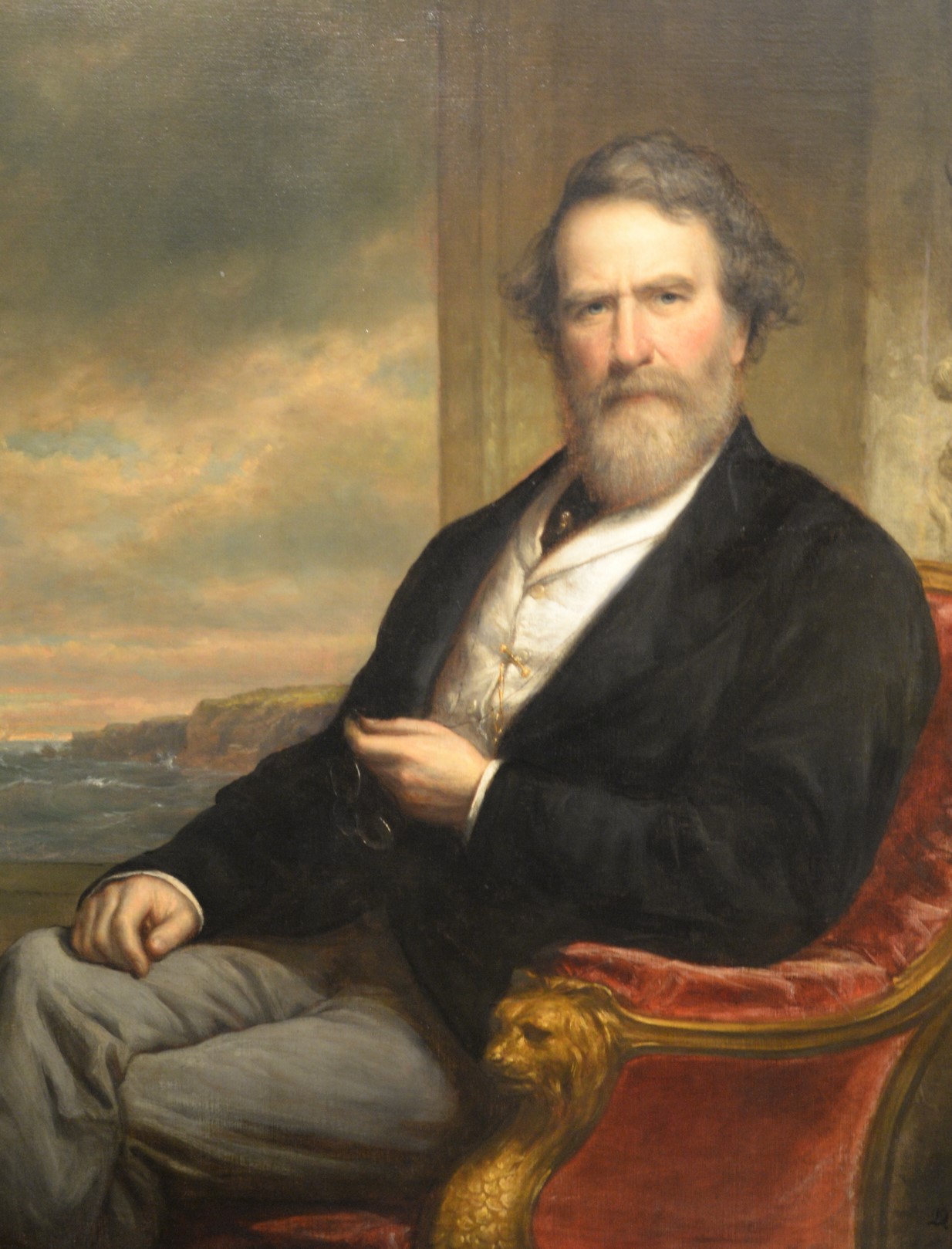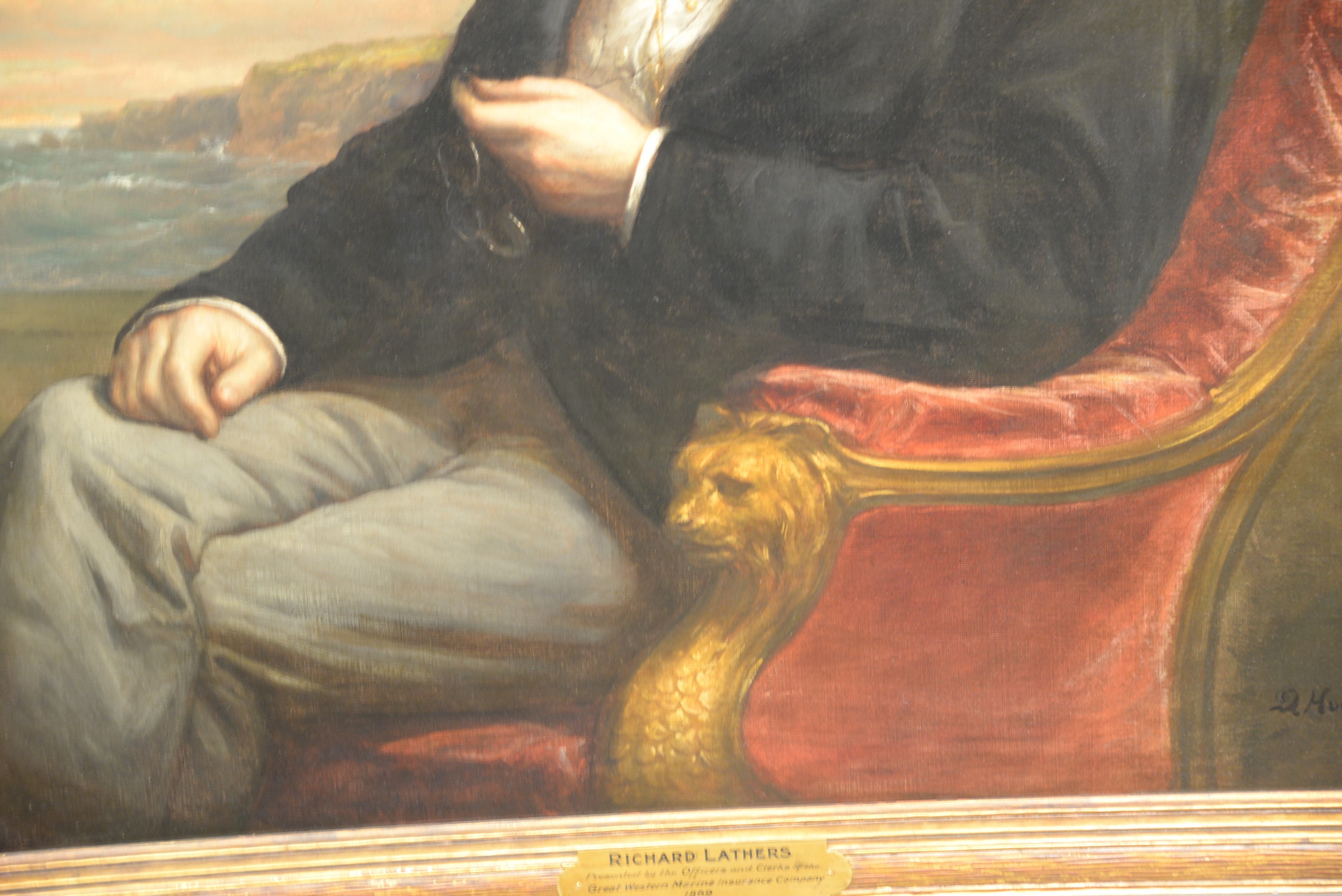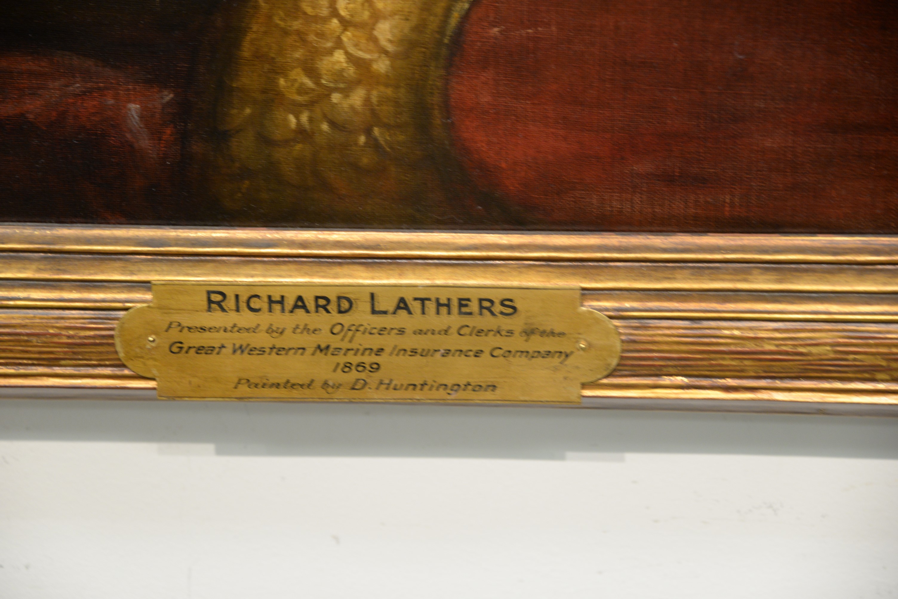 Daniel Huntington 1816-1906 Portrait of Richard Lathers 1820-1903 seated by a window overlooking rocky seashore with a ship off the coast oil on canvas, painted from life in 1869 signed lower left: D. Huntington plaque: Richard Lathers, presented by the officers and clerks of the Great Western Marine Insurance Company 1869, painted by D. Huntington 50 x 40 American frame, circa 1910, frame wd. 3 in. restretched and relined Provenance: The Chamber of Commerce of the State of New York Donaldson, Lufkin & Jenrette, New York Property from Credit Suisse’s Americana Collection Literature: Chamber of Commerce of the State of New York, Catalogue of Portraits in the Chamber of Commerce of the State of New York New York, 1924 p. 51, no. 161.