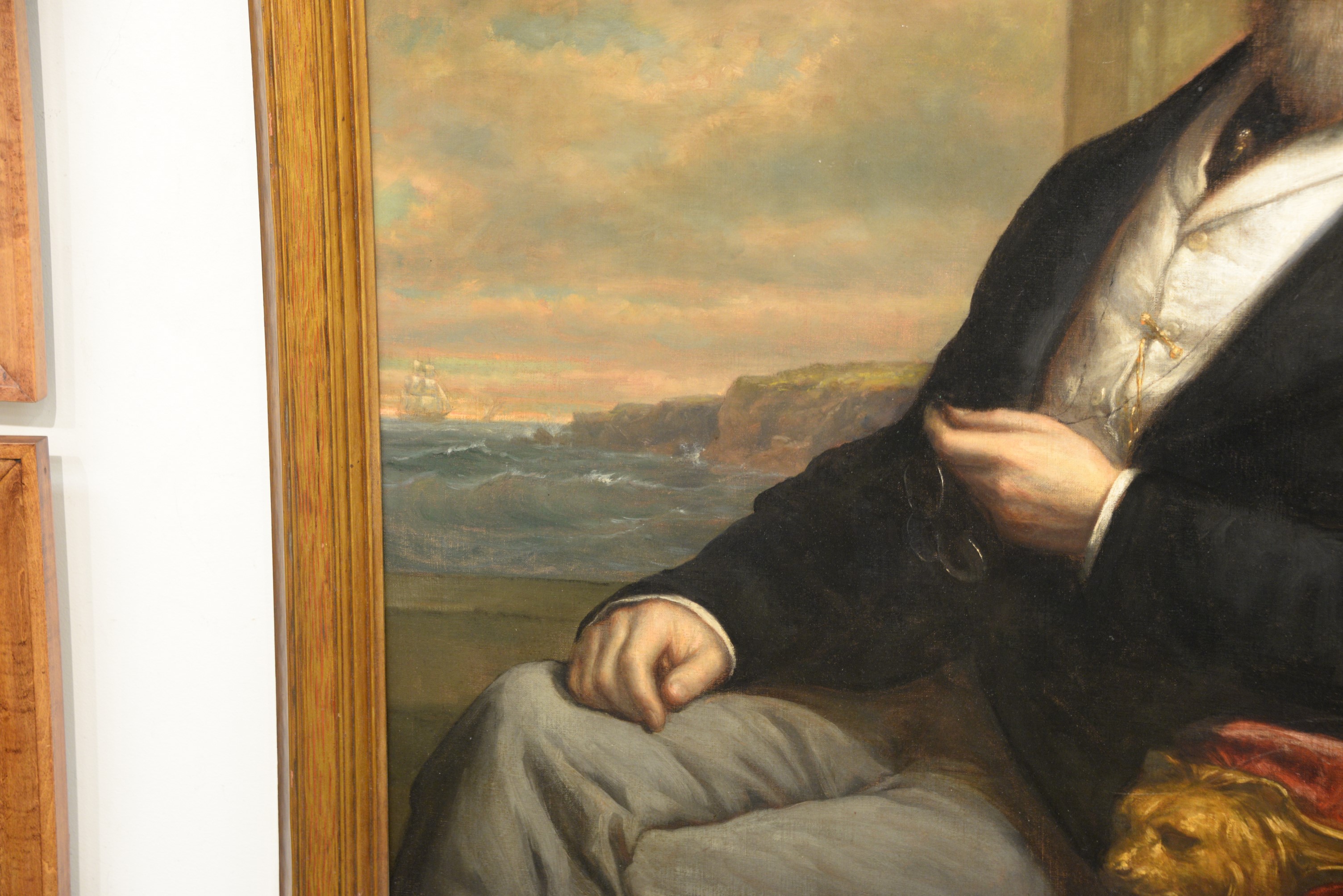 Lot 250: Daniel Huntington 1816-1906 Portrait of Richard Lathers 1820-1903 seated by a window overlooking rocky seashore with a ship o…