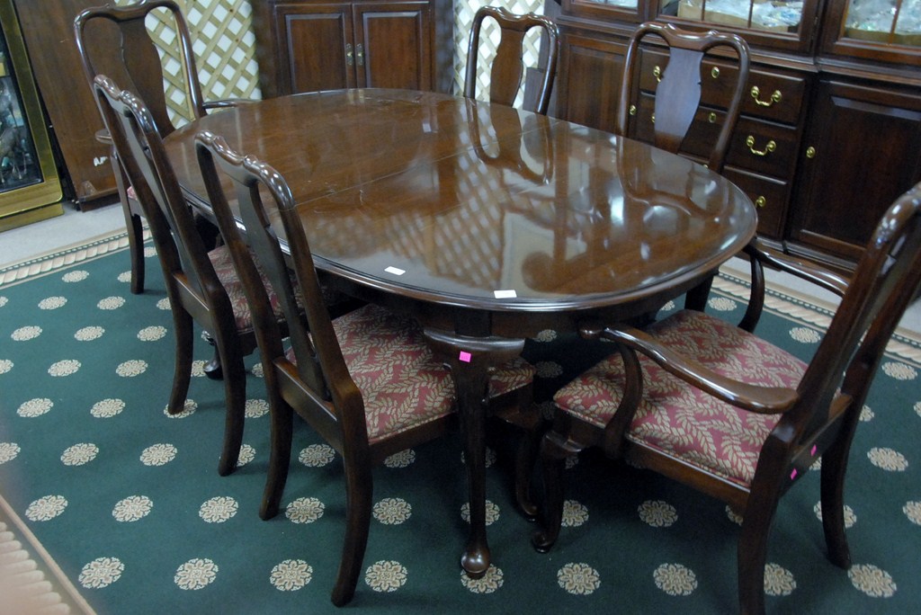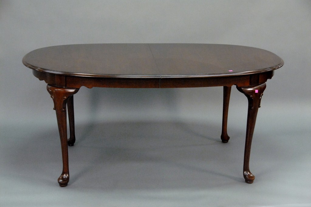 Lot 250: Ethan Allen dark cherry Queen Anne style dining table and eight chairs with tapestry style upholstered seats, table: 29 x 66 plus …