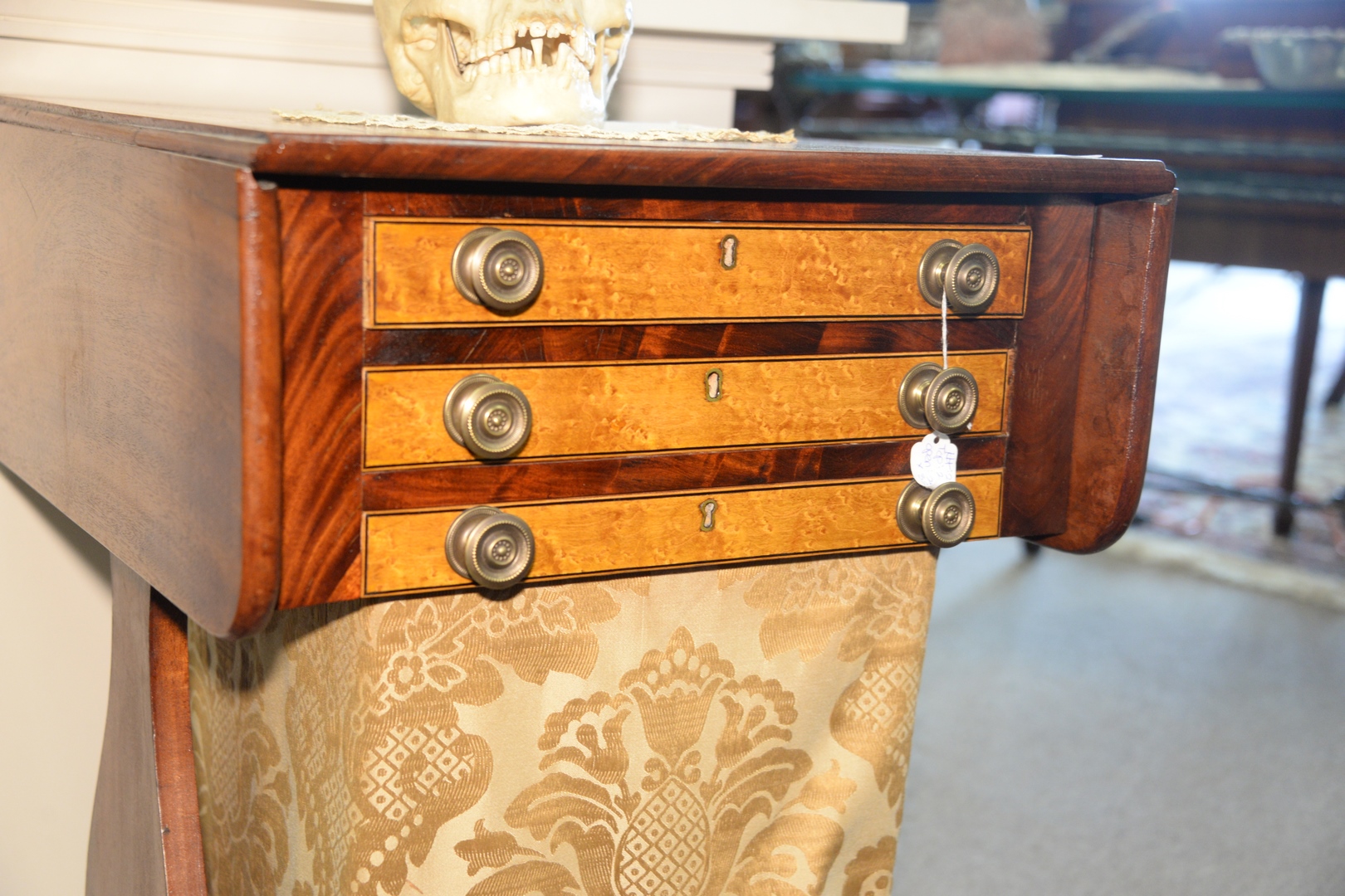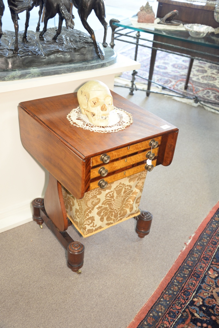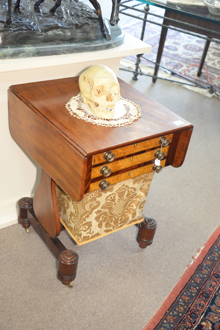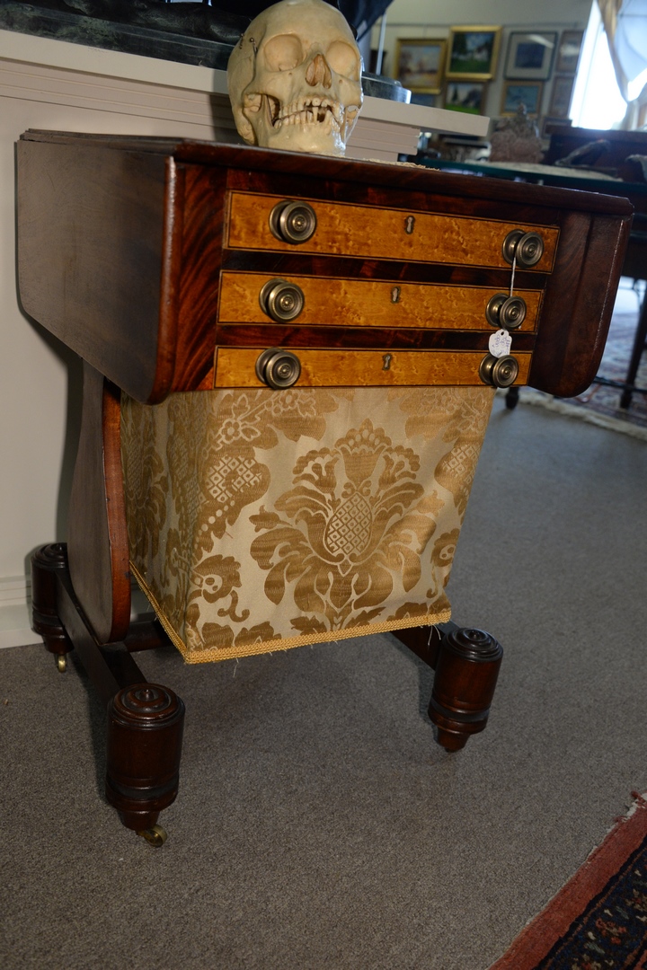 Lot 250: Federal Mahogany Work Table having three drawers with birdseye maple drawer fronts set on side supports on base with round feet. he…