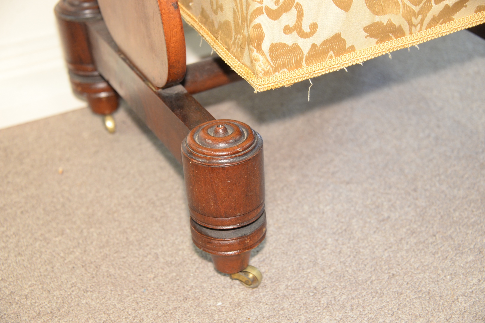 Federal Mahogany Work Table having three drawers with birdseye maple drawer fronts set on side supports on base with round feet.