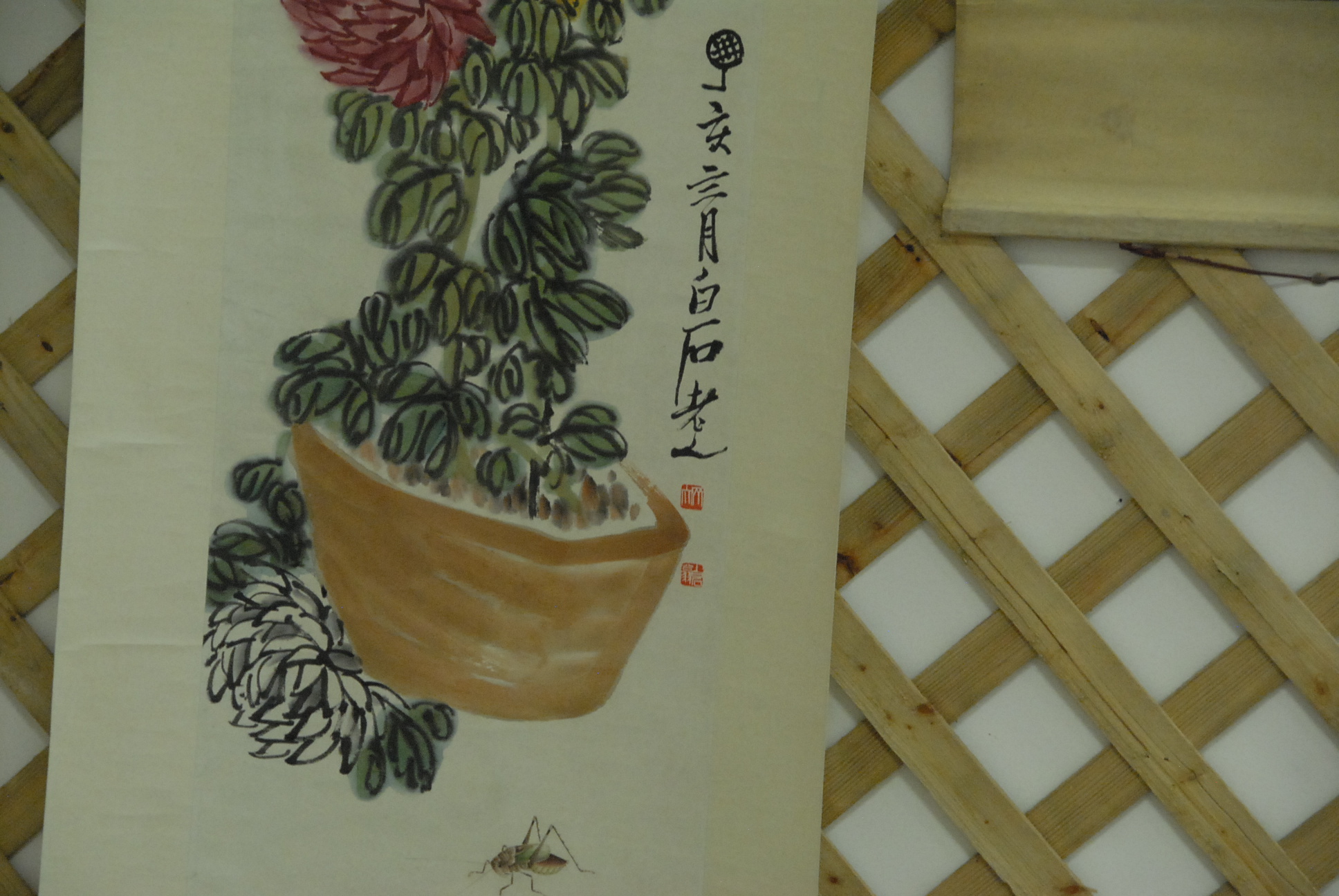 Lot 250: Four Oriental scrolls watercolor still life plant 37 x 13, watercolor beach landscape 26 x 16, watercolor boy with father 15 x…