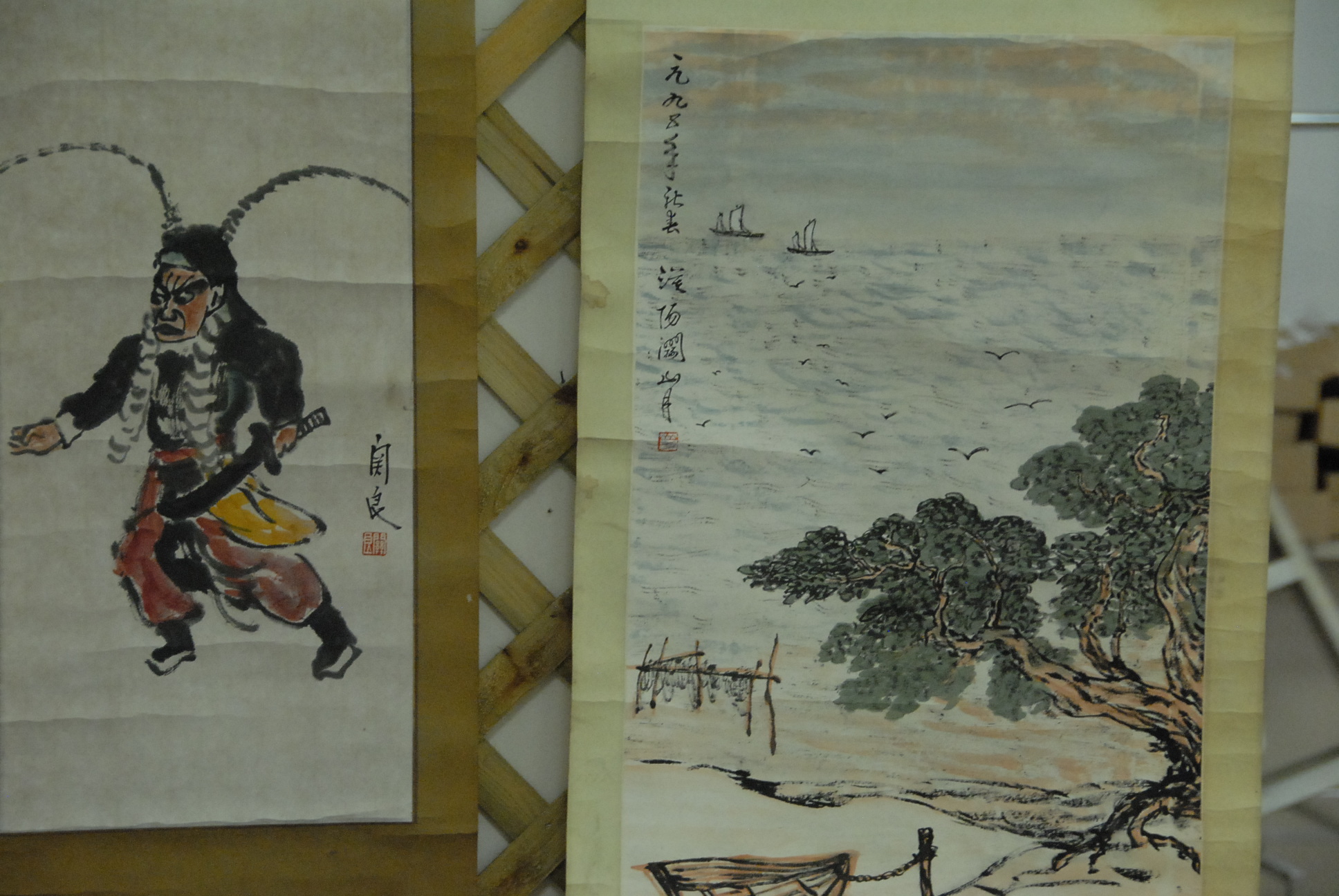 Four Oriental scrolls watercolor still life plant 37 x 13, watercolor beach landscape 26 x 16, watercolor boy with father 15 x 25, and watercolor of warrior 26 x 11.