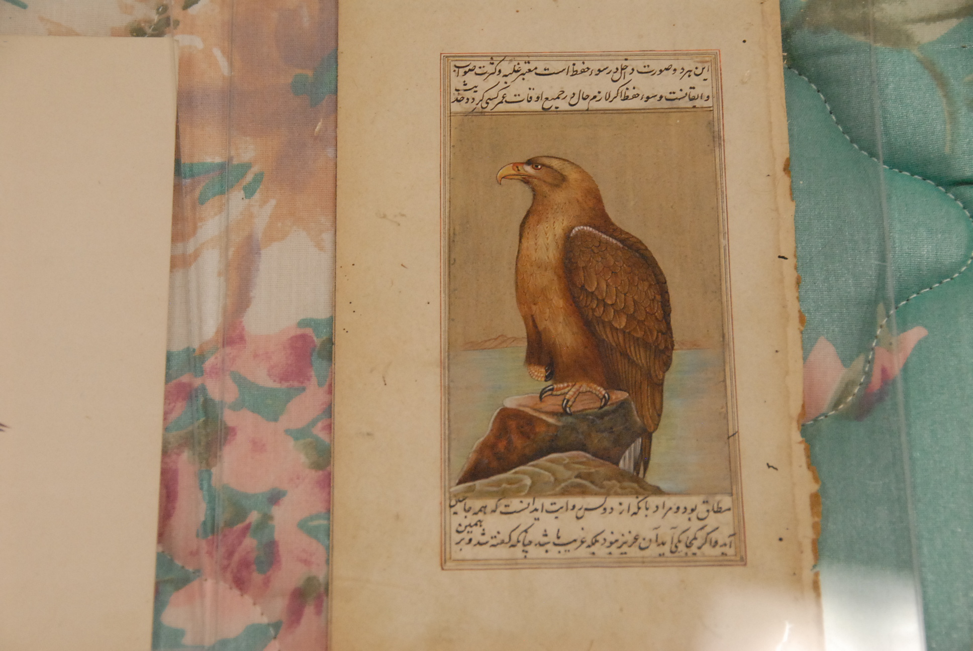 Four piece lot to include a set of two bird paintings on Persian manuscript leaves and two humming bird paintings.
