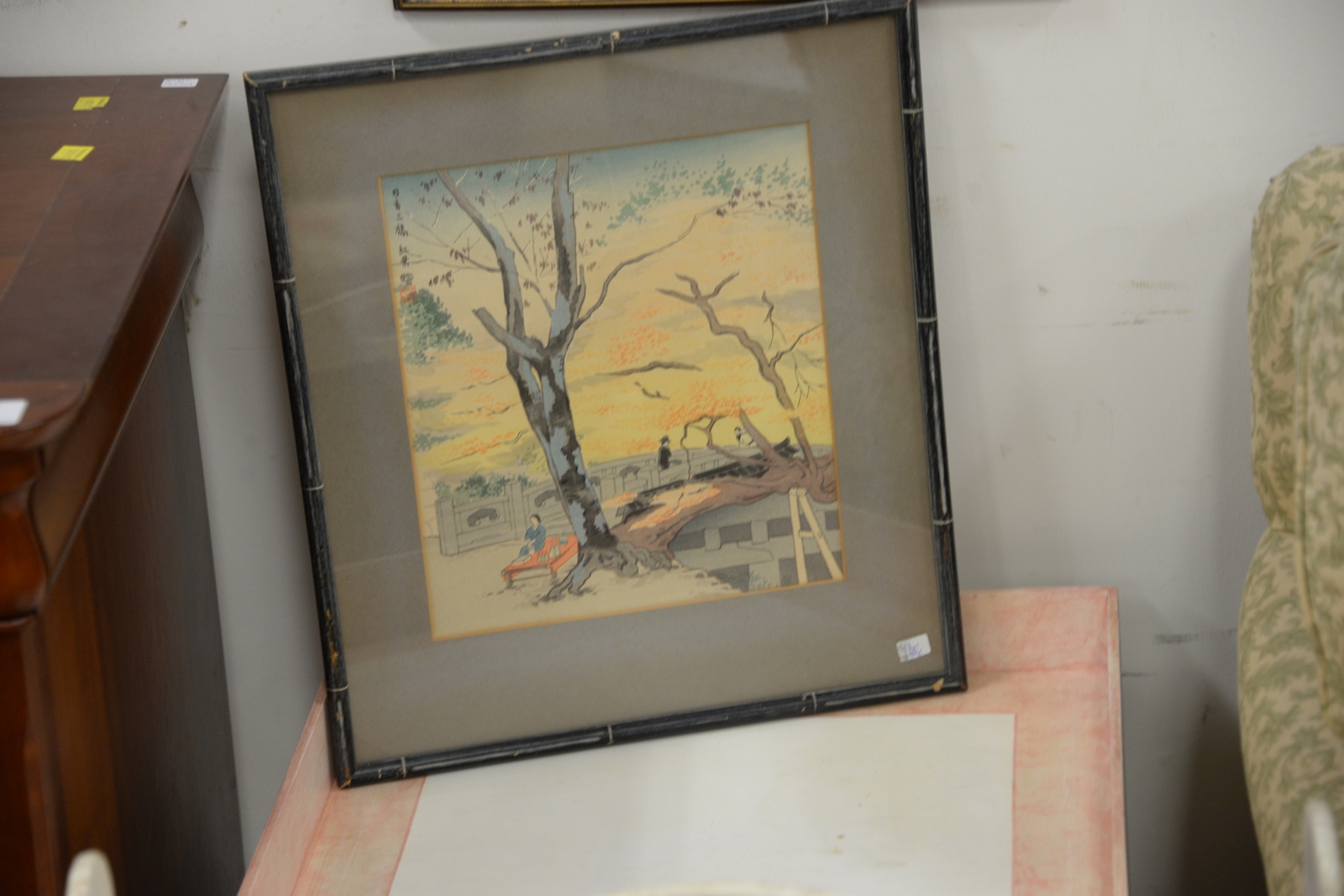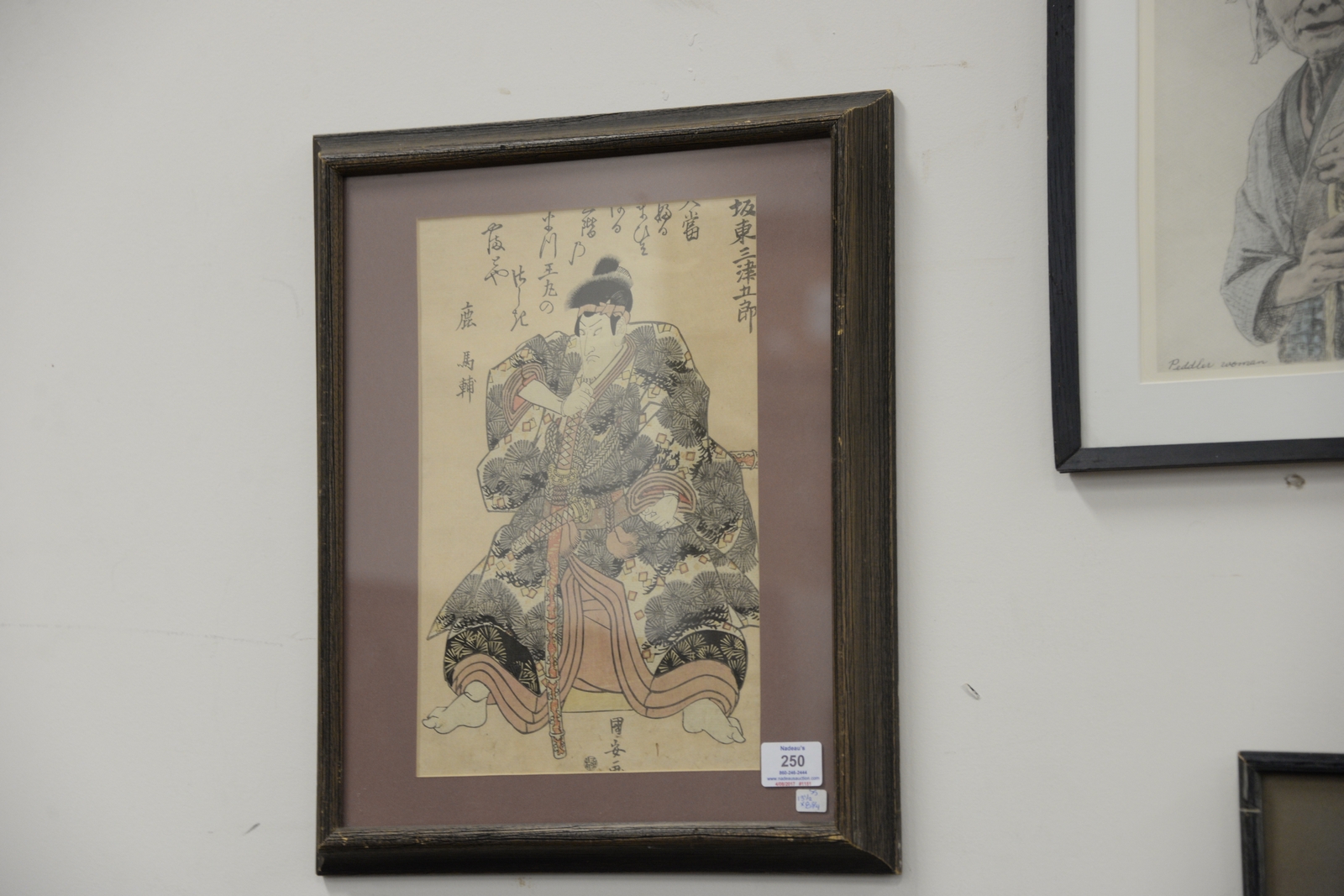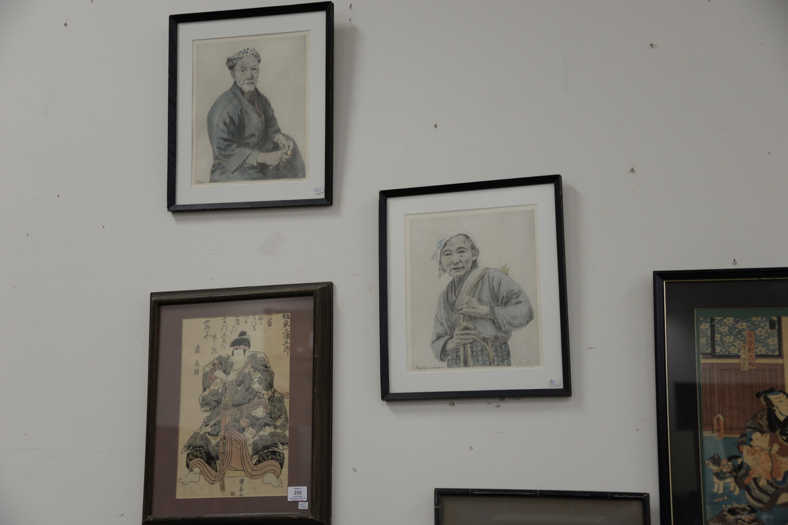 Lot 250: Group of seven Japanese woodblocks and etchings including two landscapes, three warrior figures, two pencil signed lower left illegi…