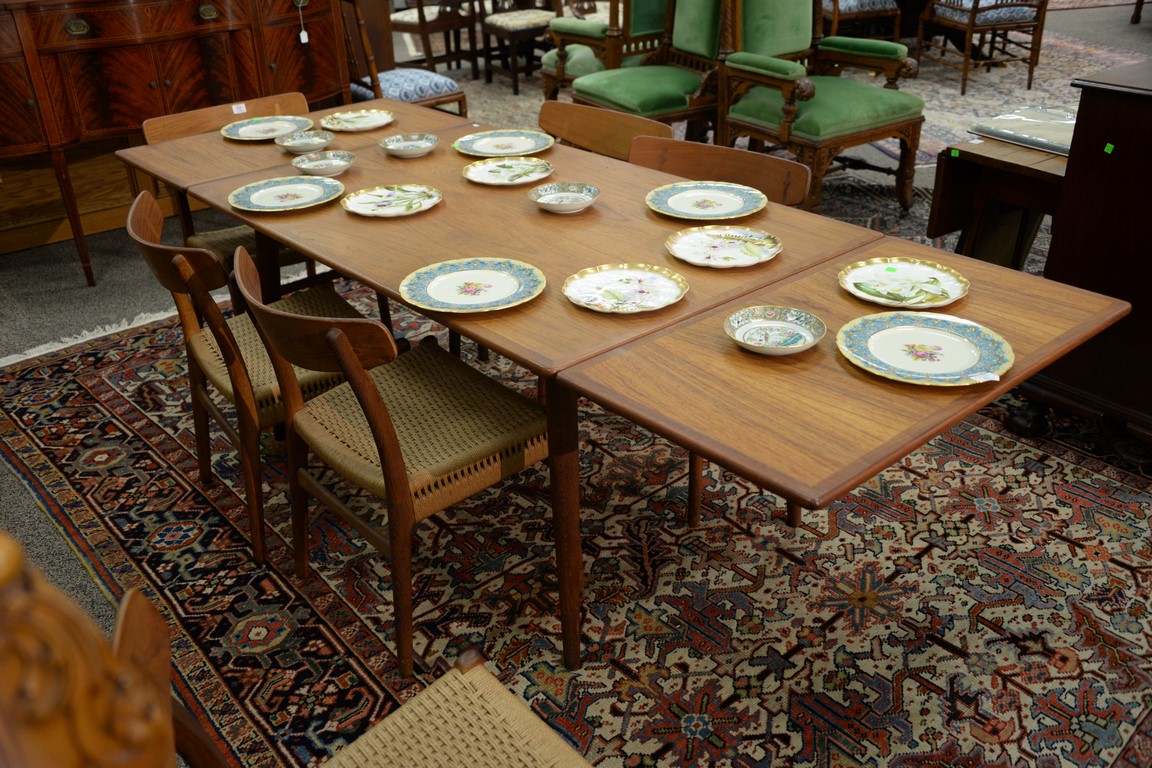 Lot 250: Hans Wegner dining table by Andreas Tuck. height 28 1/2 inches, top closed: 35 x 55, top open: 35 x 93
