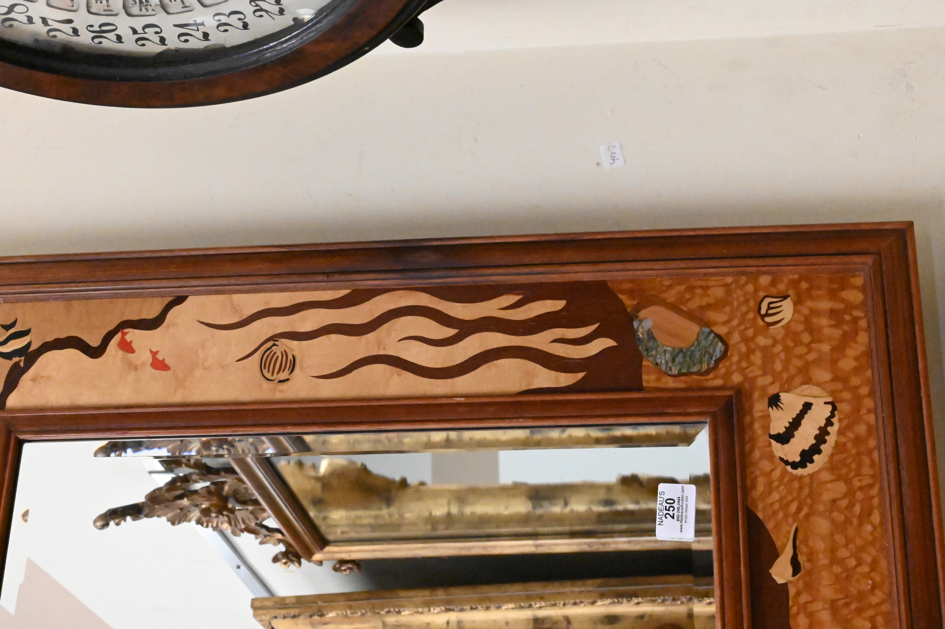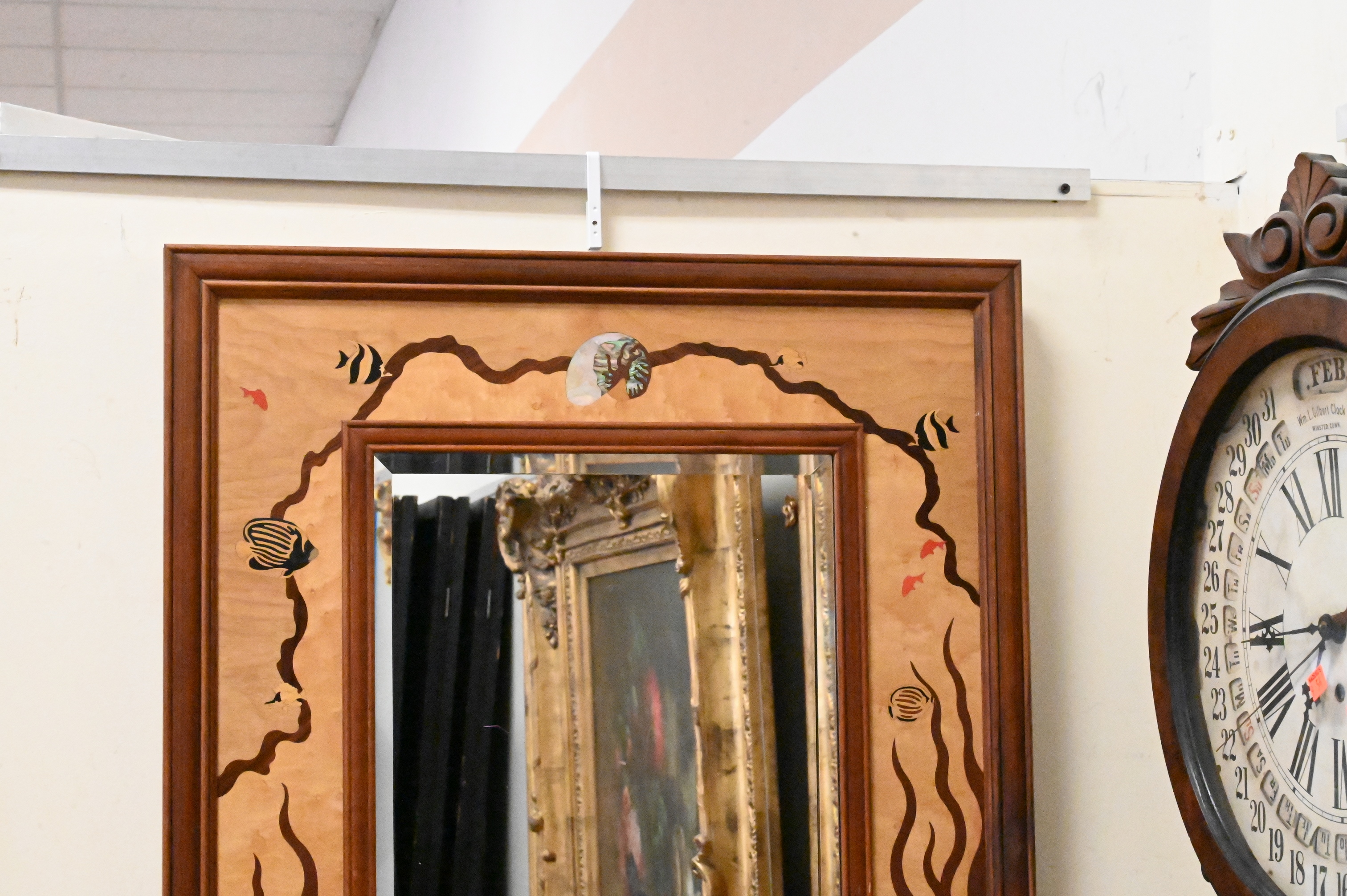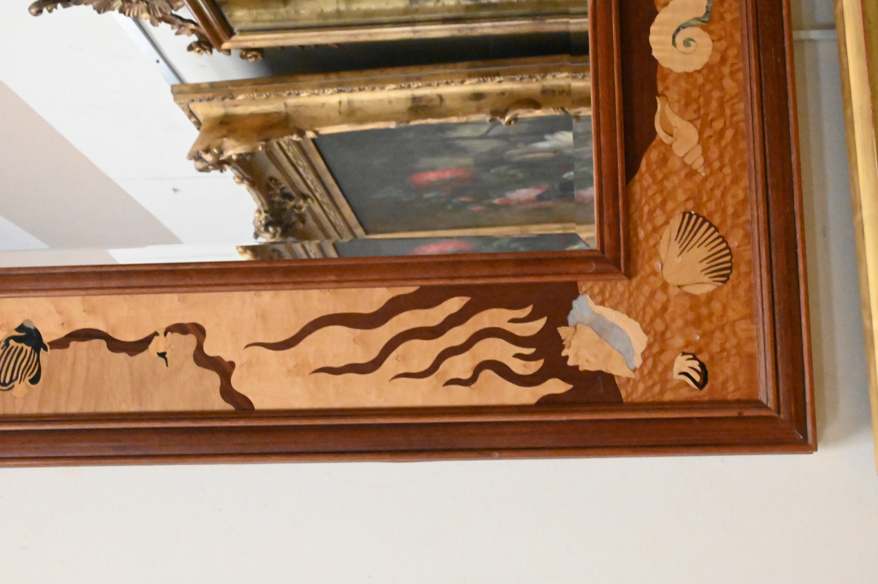 Having molded cherry wood frame, featuring marquetry inlaid shells, fish, and