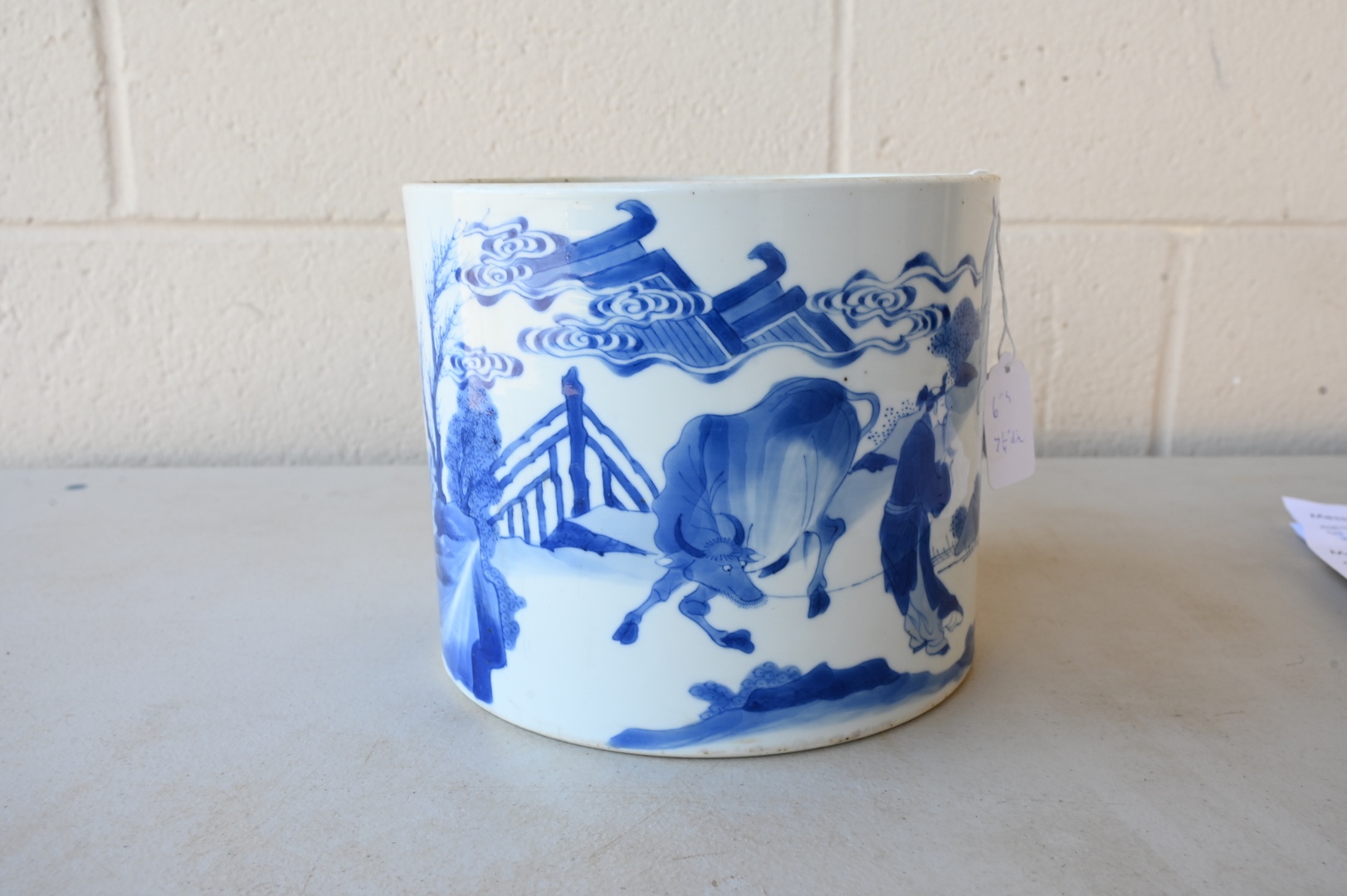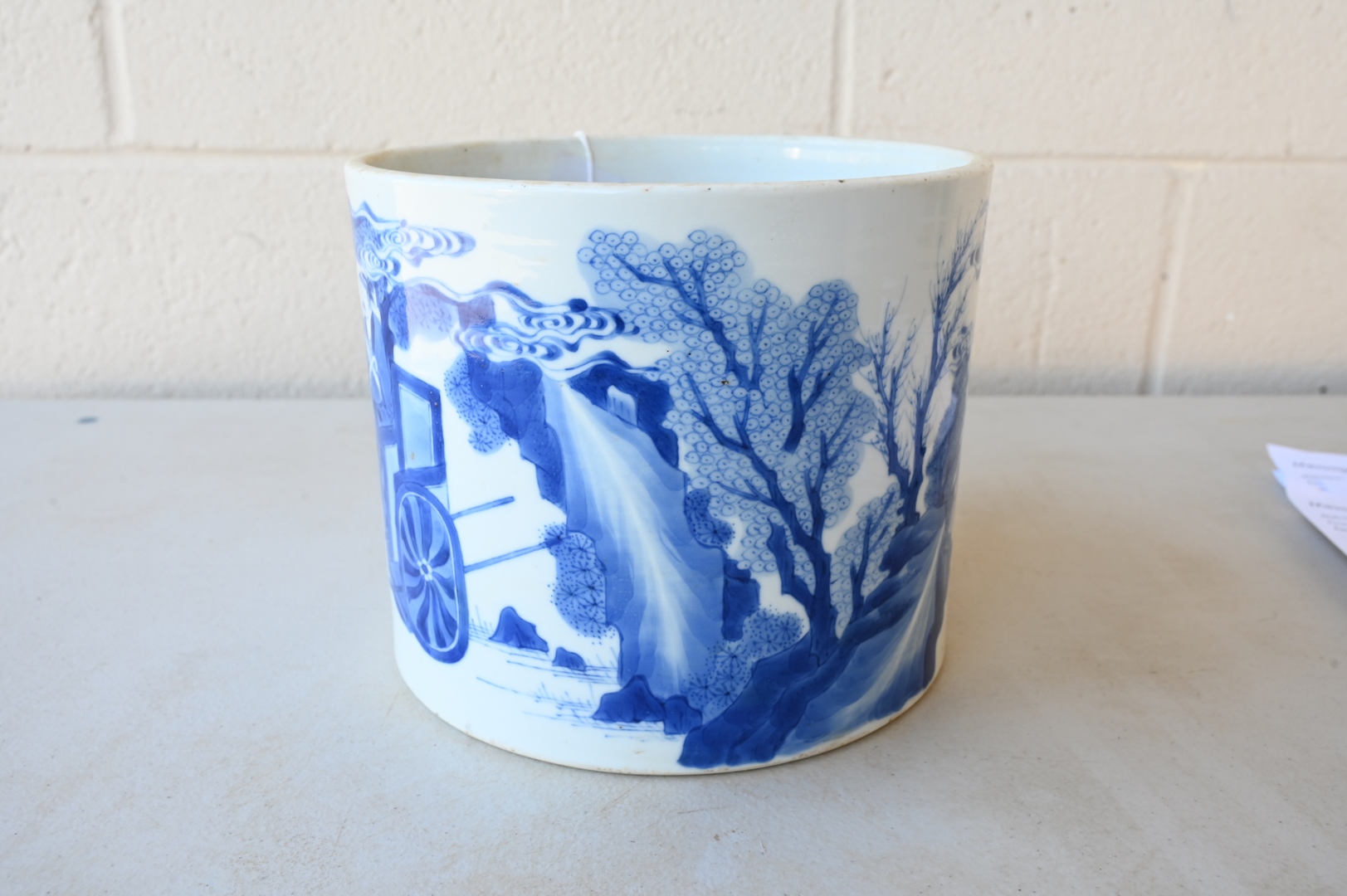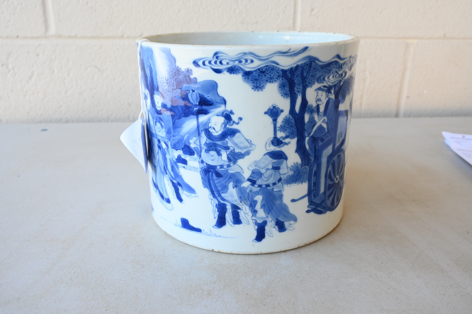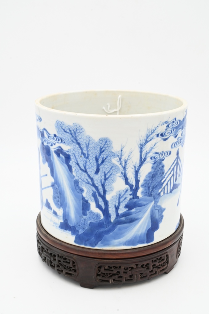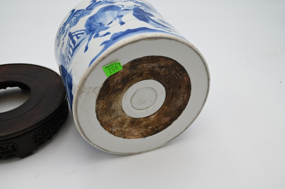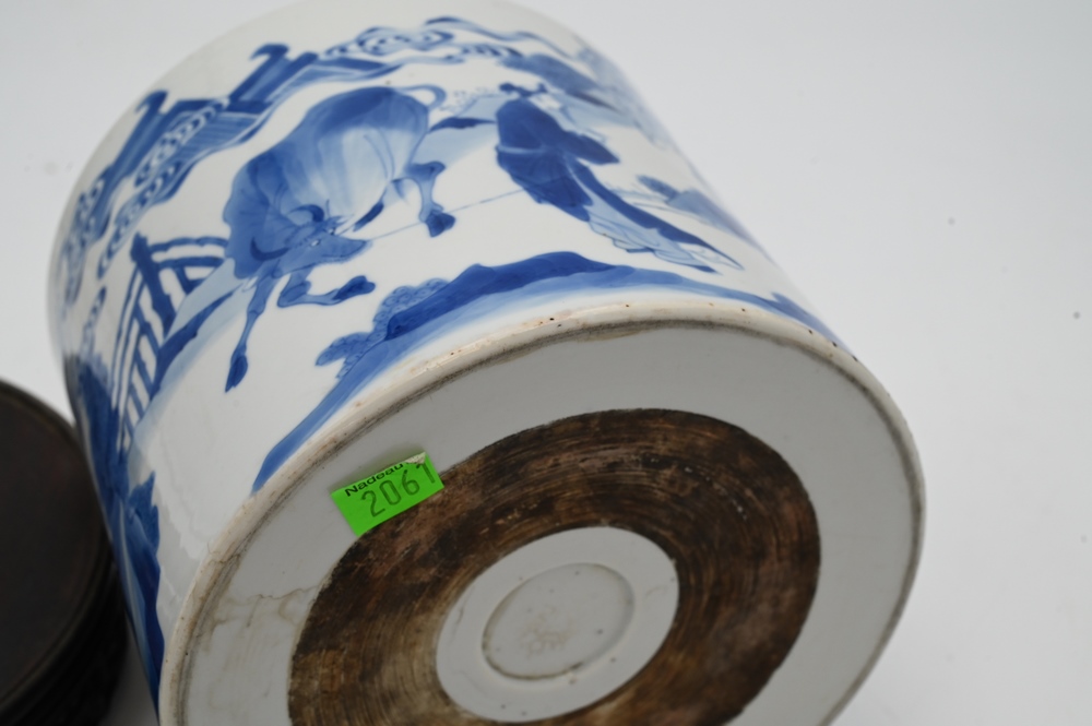 Lot 250: Large Blue and White Chinese Brush Pot, painted with official making a presentation to sage peasant accompanied by his bullock Daoist symbol, on carved wood stand, probably 18th century or earlier, total height 6 inches, diameter 7 1/8 inches.