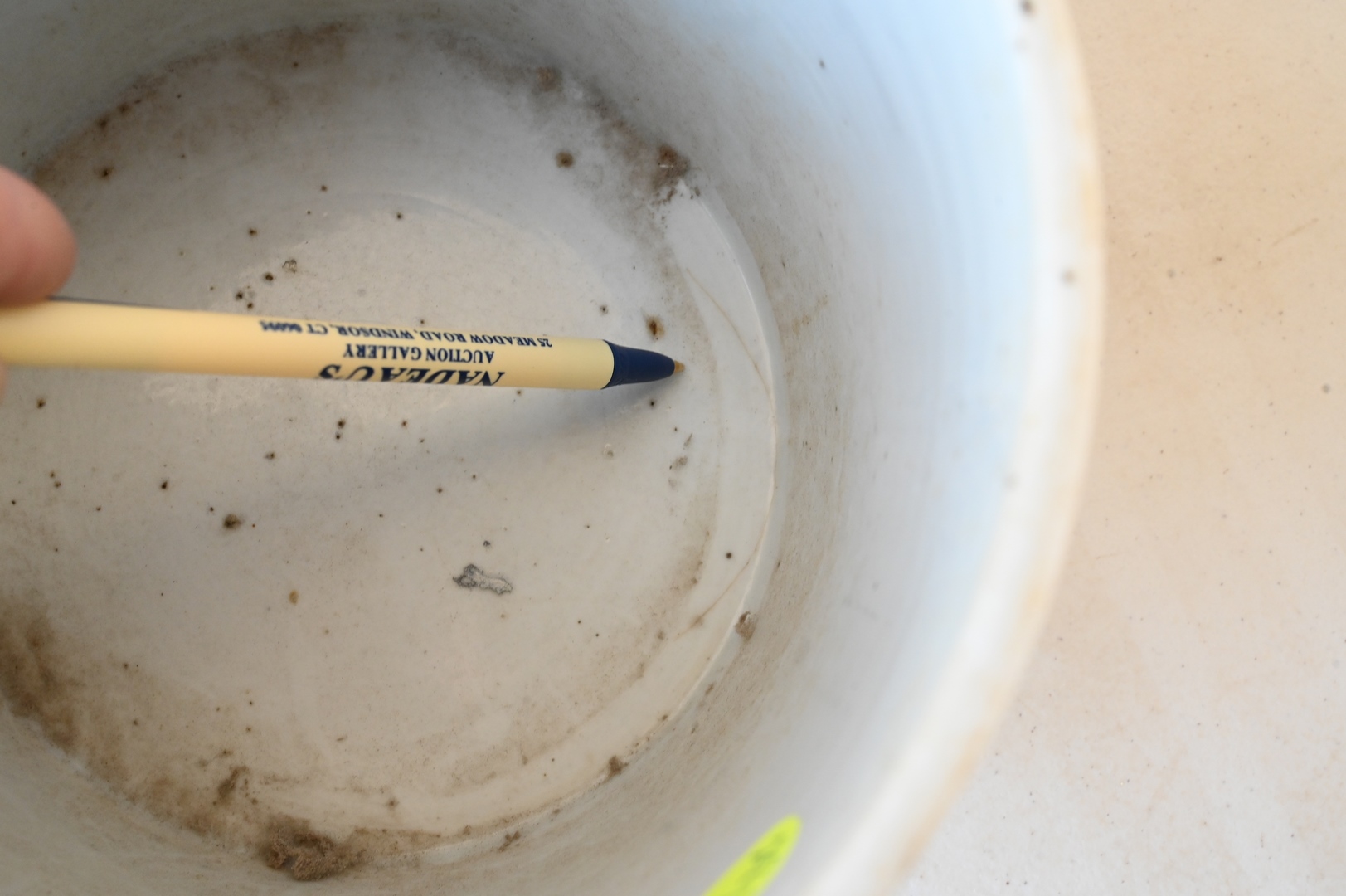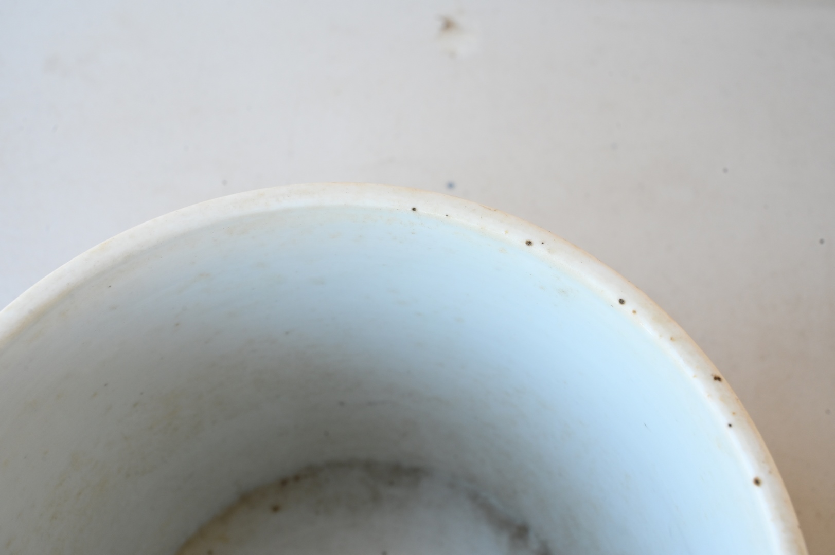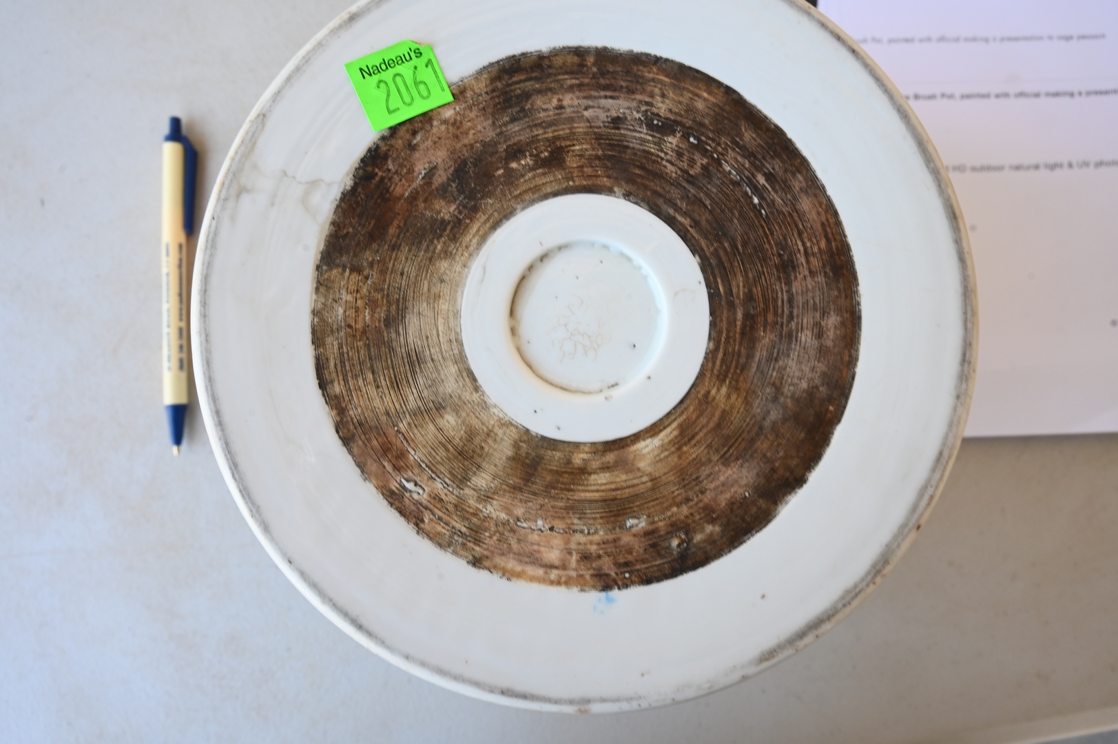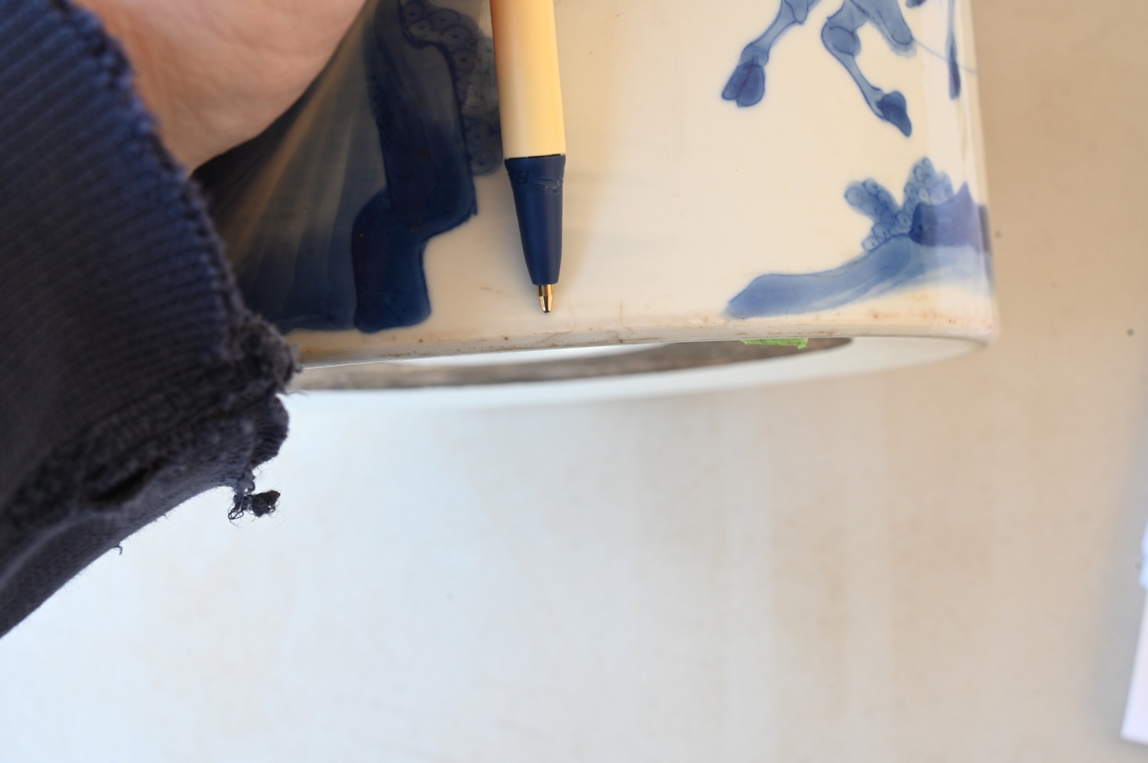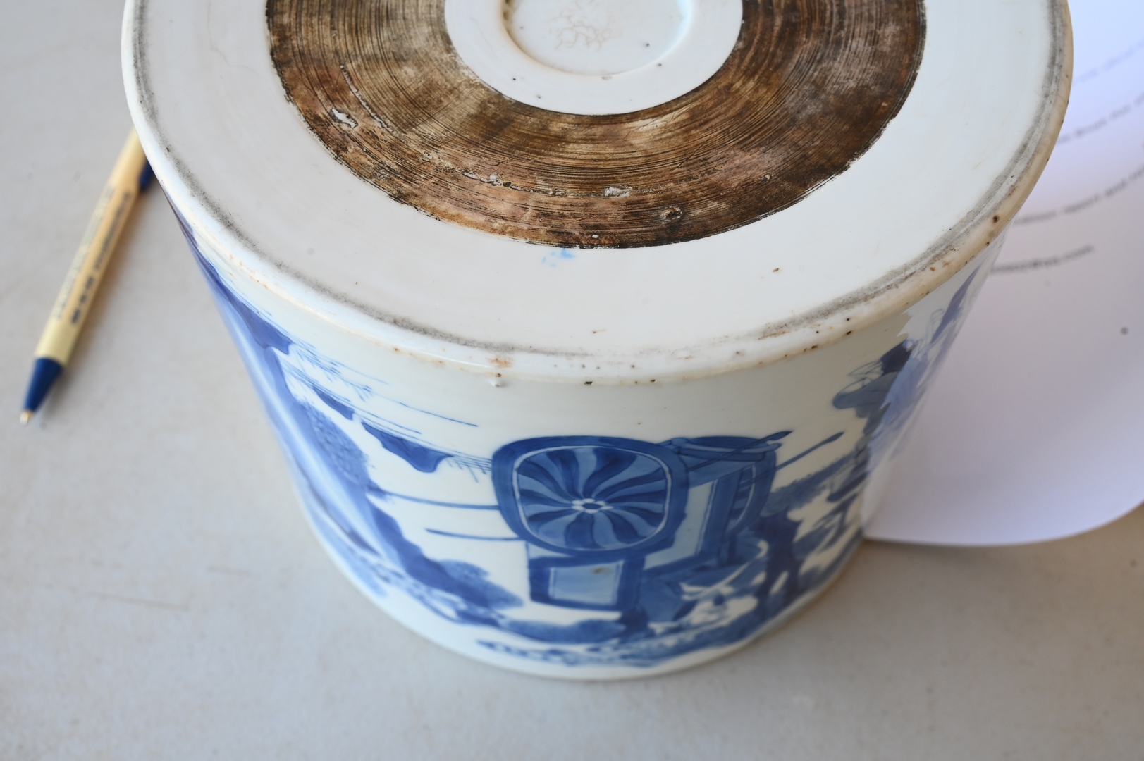 Lot 250: Large Blue and White Chinese Brush Pot, painted with official making a presentation to sage peasant accompanied by his bullock Daoist symbol, on carved wood stand, probably 18th century or earlier, total height 6 inches, diameter 7 1/8 inches.