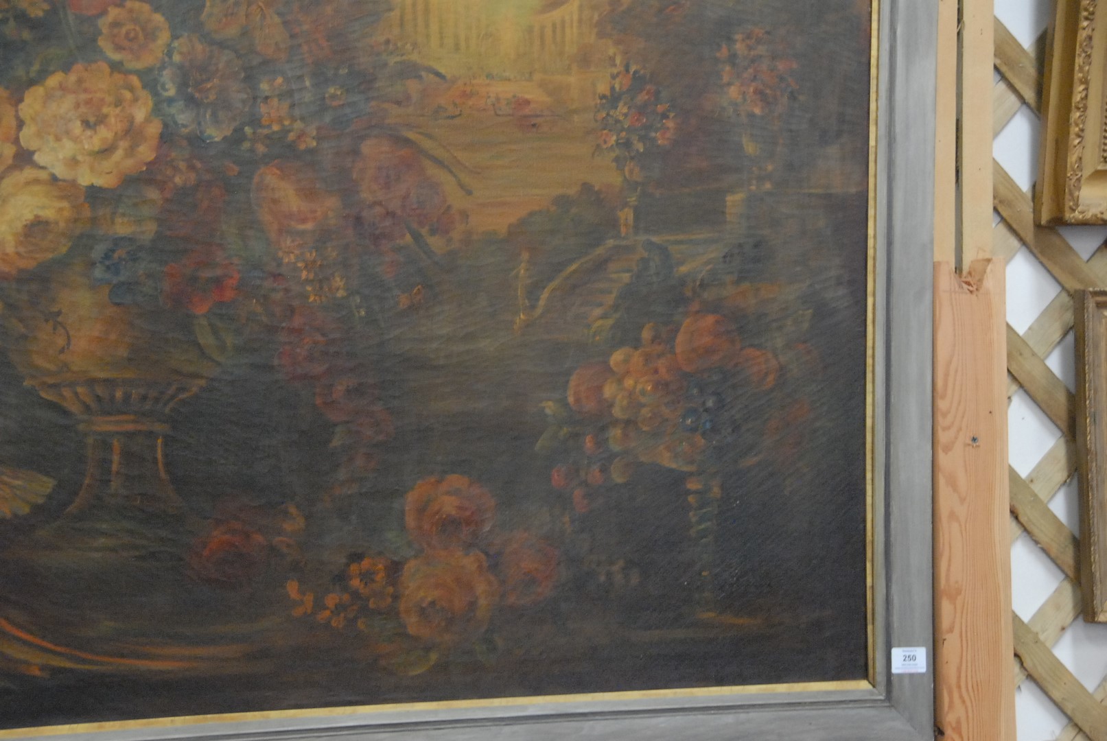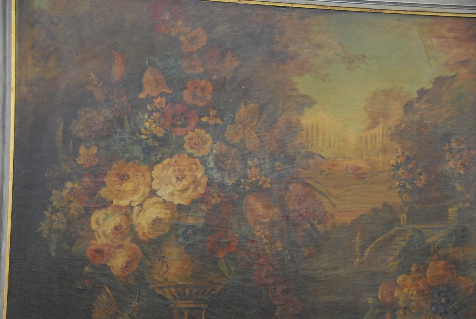 Lot 250: Large oil on canvas still life of birds, fruits, and flowers with courtyard in background, unsigned. 38 x 46