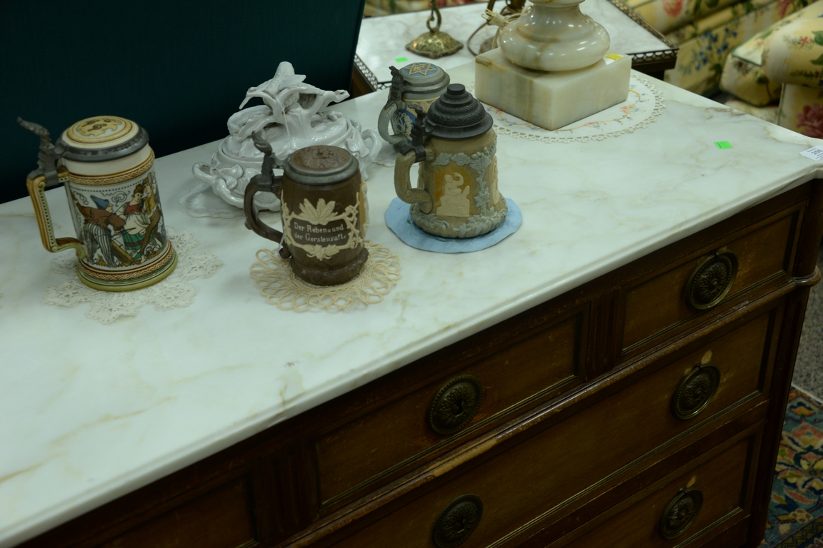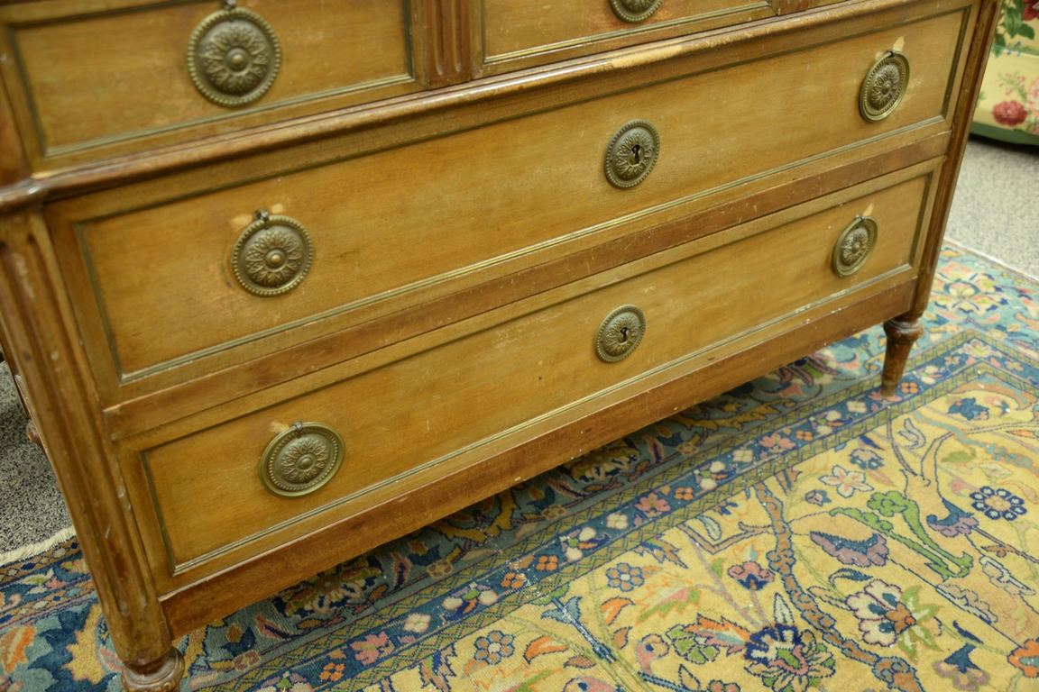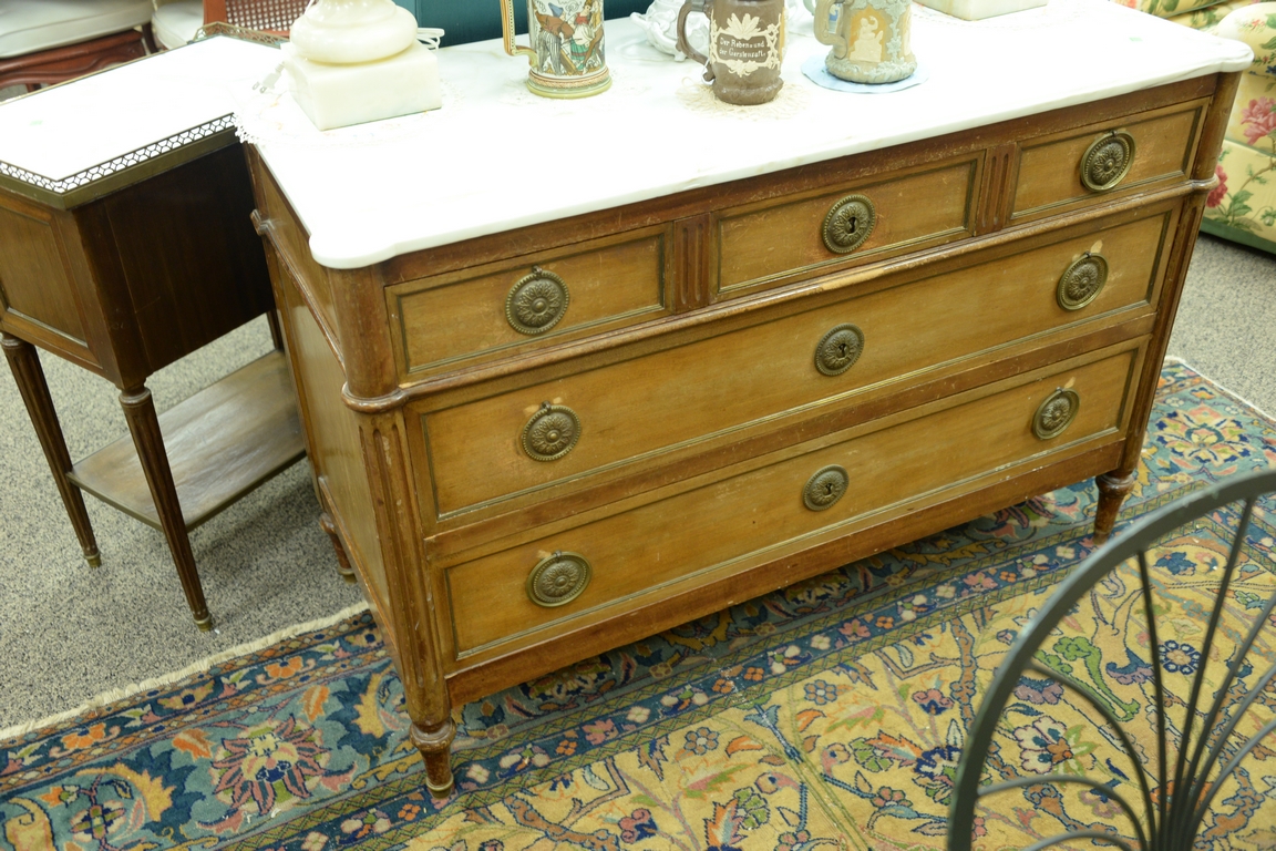 Louis XVI marble top commode with turret corners, 20th century. ht. 33in., wd. 48in.