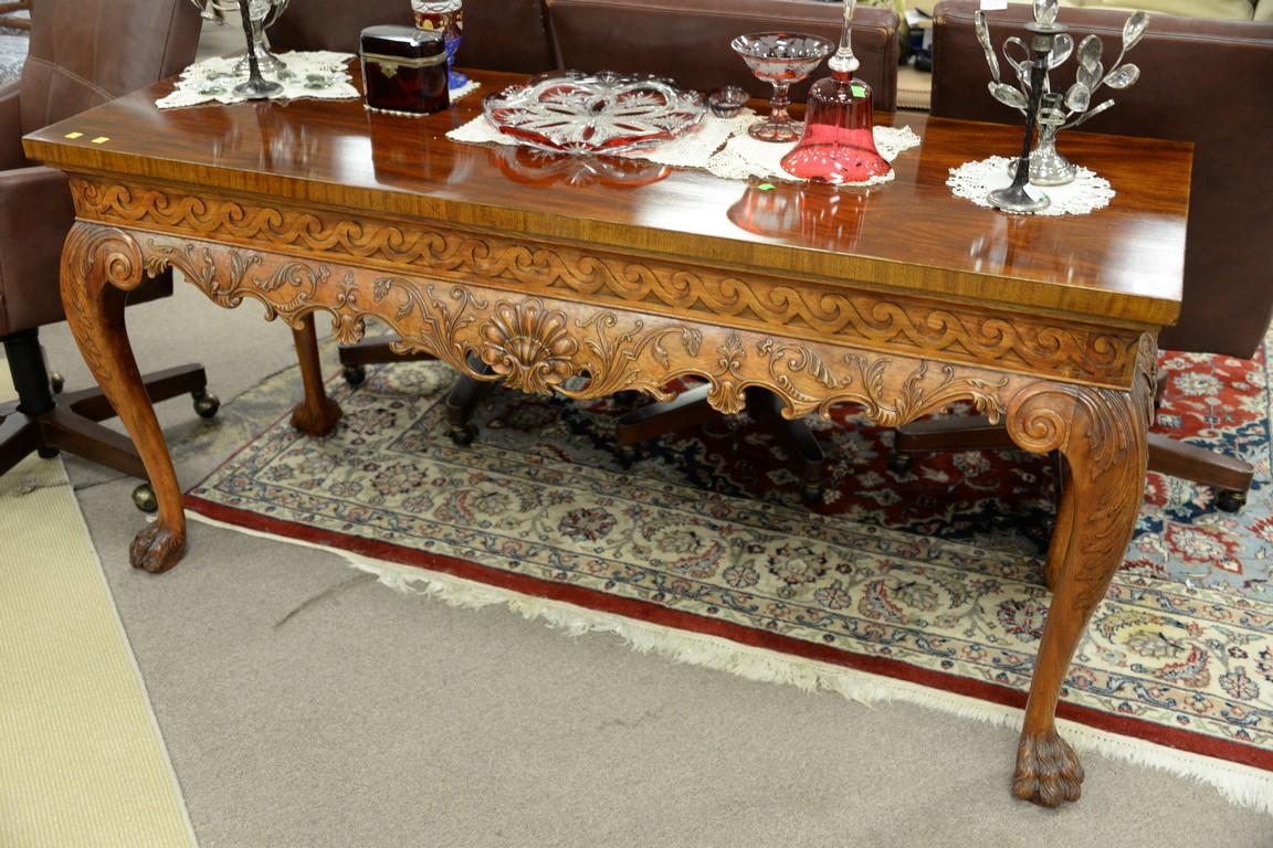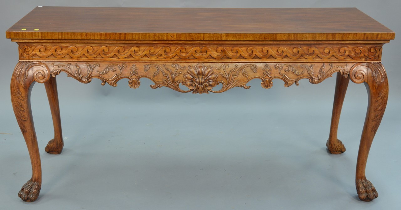 Lot 250: Mahogany Chippendale style hall table with hairy paw feet. ht. 32in., wd. 65in., dp. 23in.