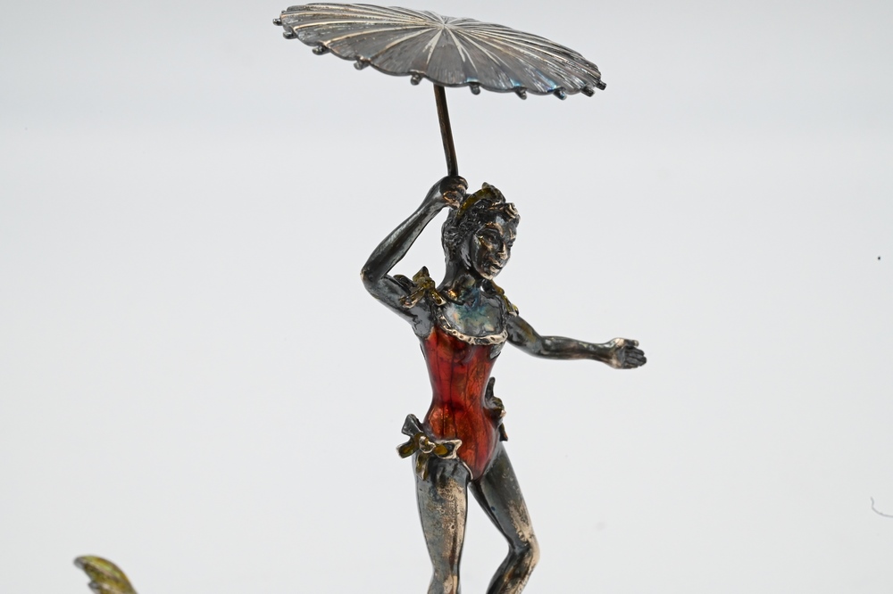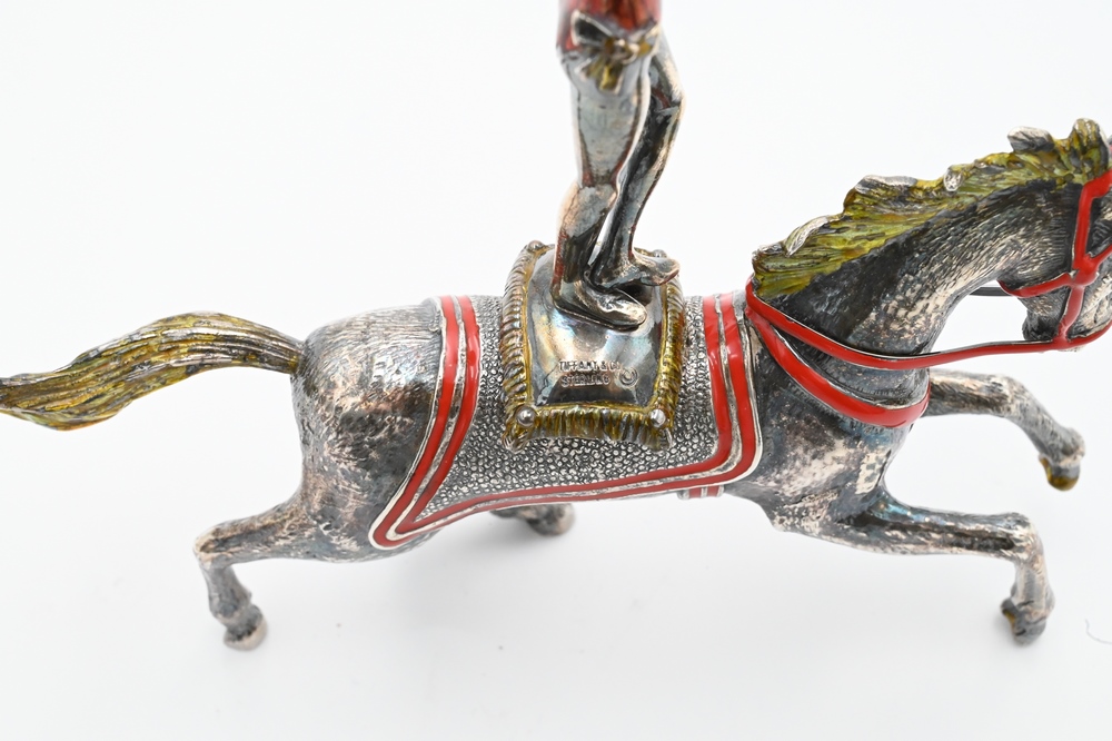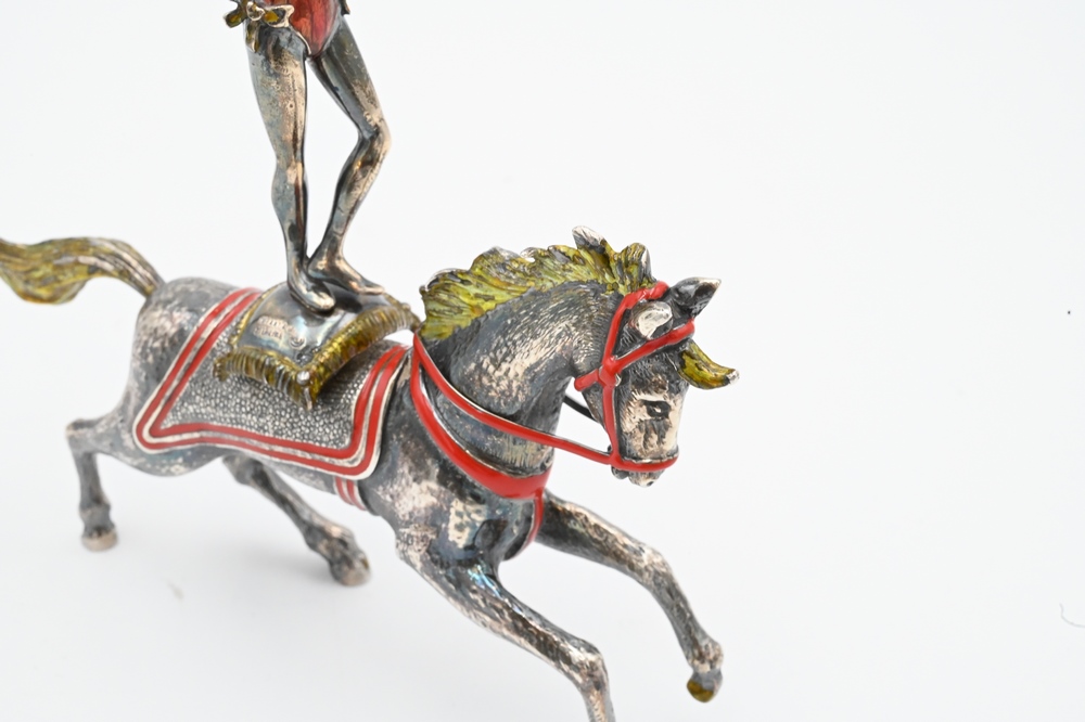 Tiffany & Company Sterling Silver Enameled Circus Performer and Horse, designed by Gene Moore (1910 – 1998), both having red enamel, performer is standing on a pillow holding a parasol on the horses back, both marked Tiffany & Company Sterling, total height 6 3/4 inches.