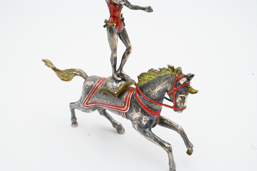 Lot 250: Tiffany & Company Sterling Silver Enameled Circus Performer and Horse, designed by Gene Moore (1910 – 1998), both having red enamel,…