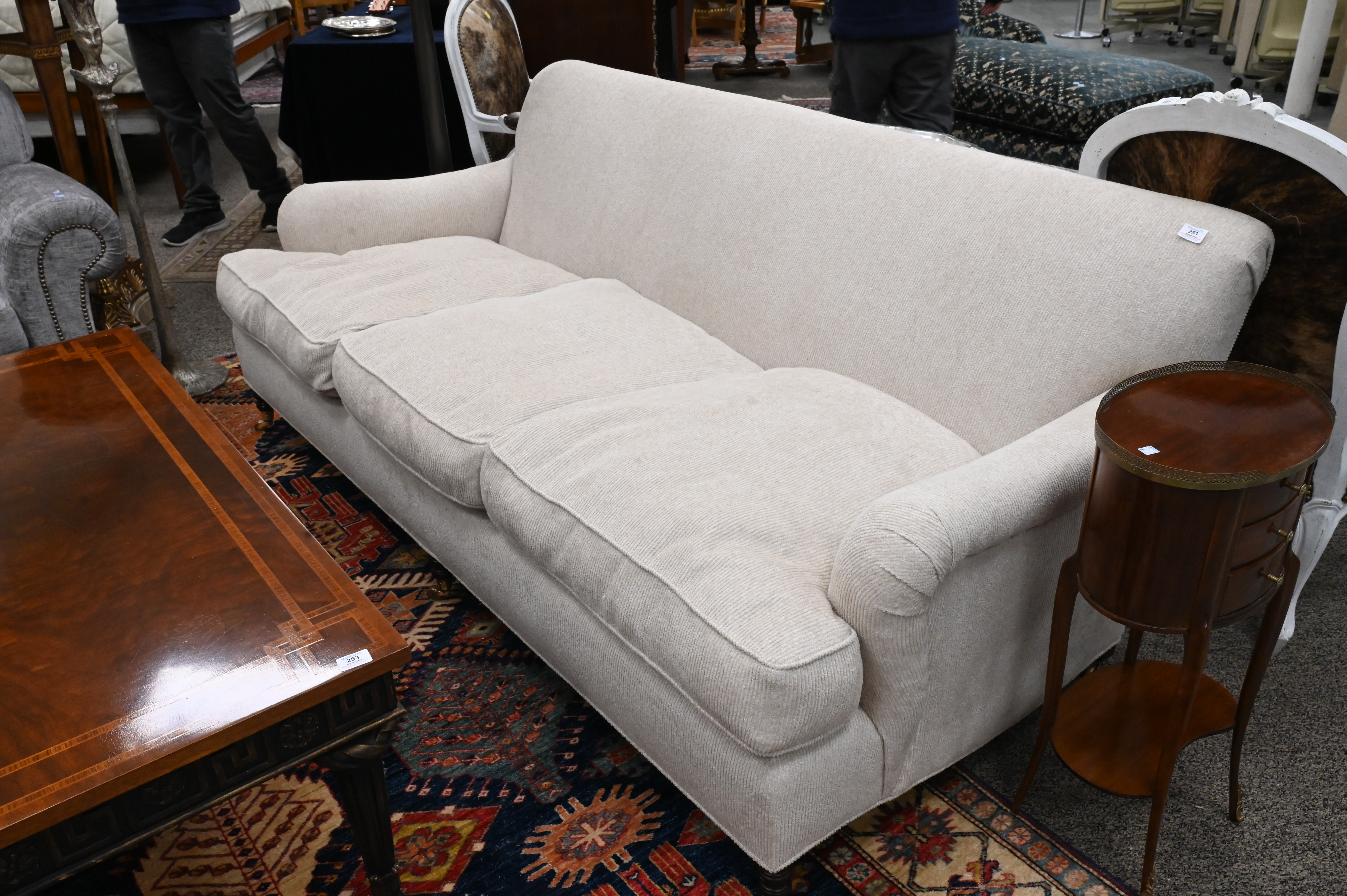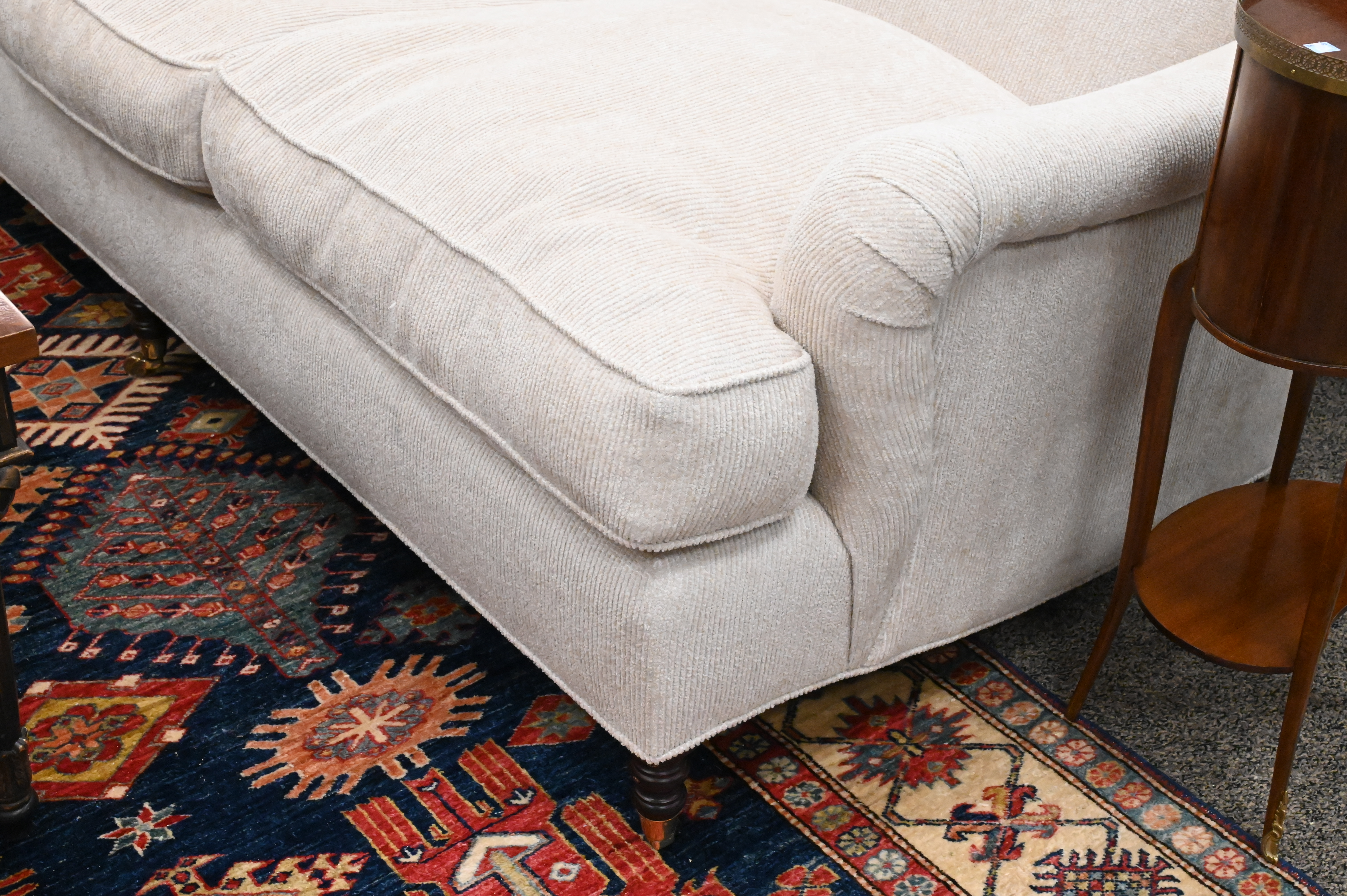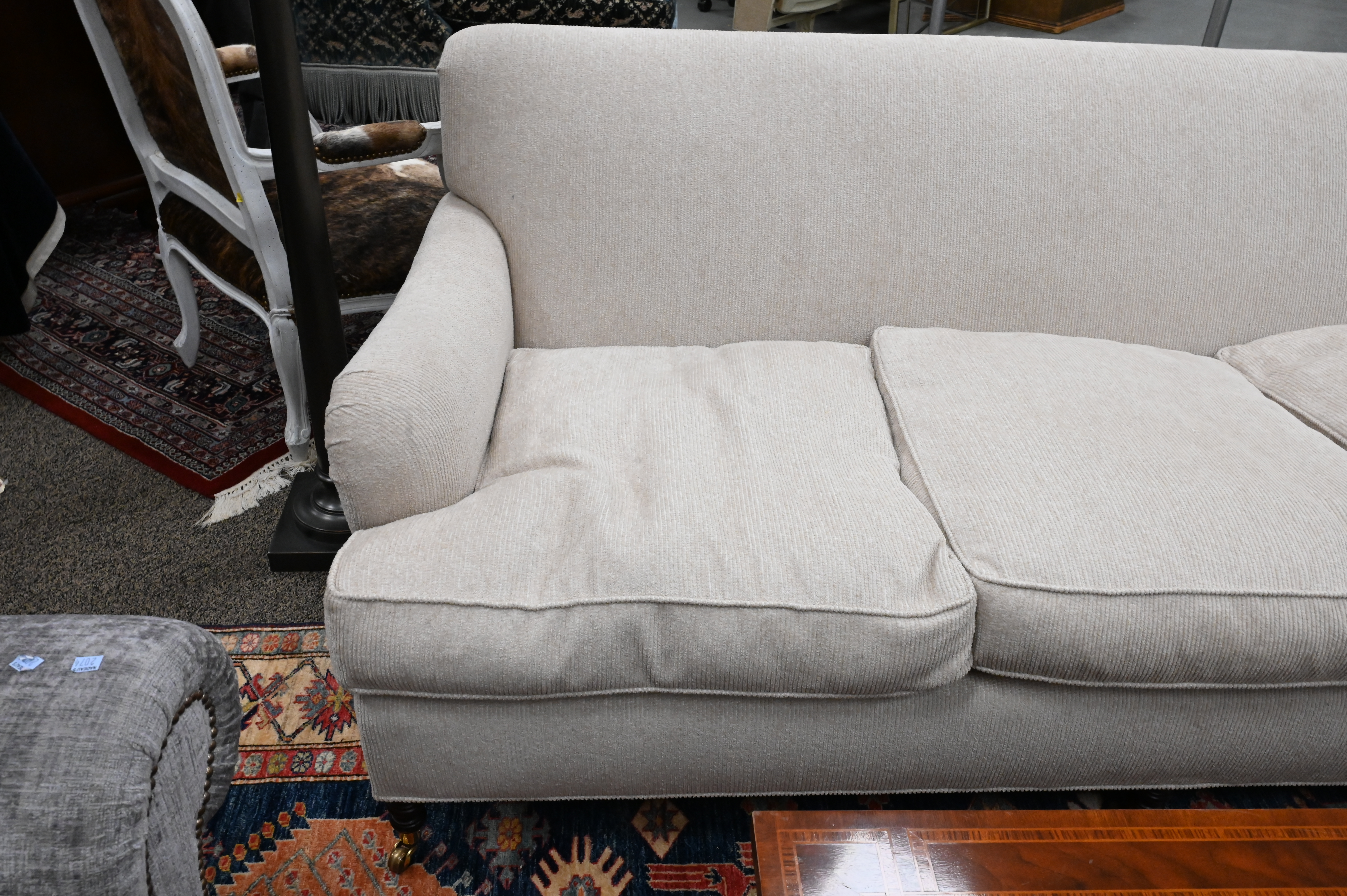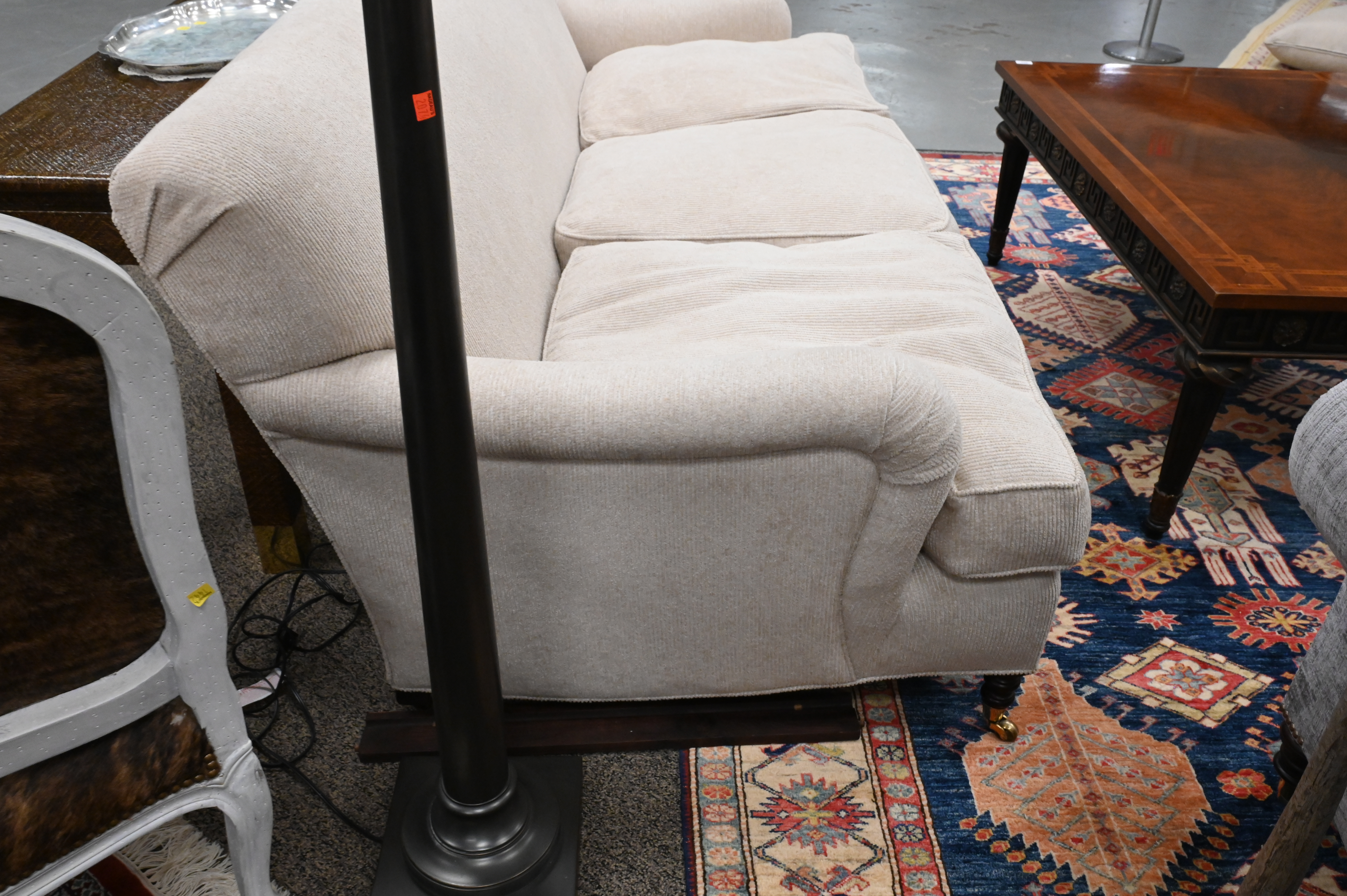 Attributed to George Smith Custom Upholstered Sofa, having a three cushion seat, set on tall brass casters, height 32 inches, length 83 inches, depth 41 inches.