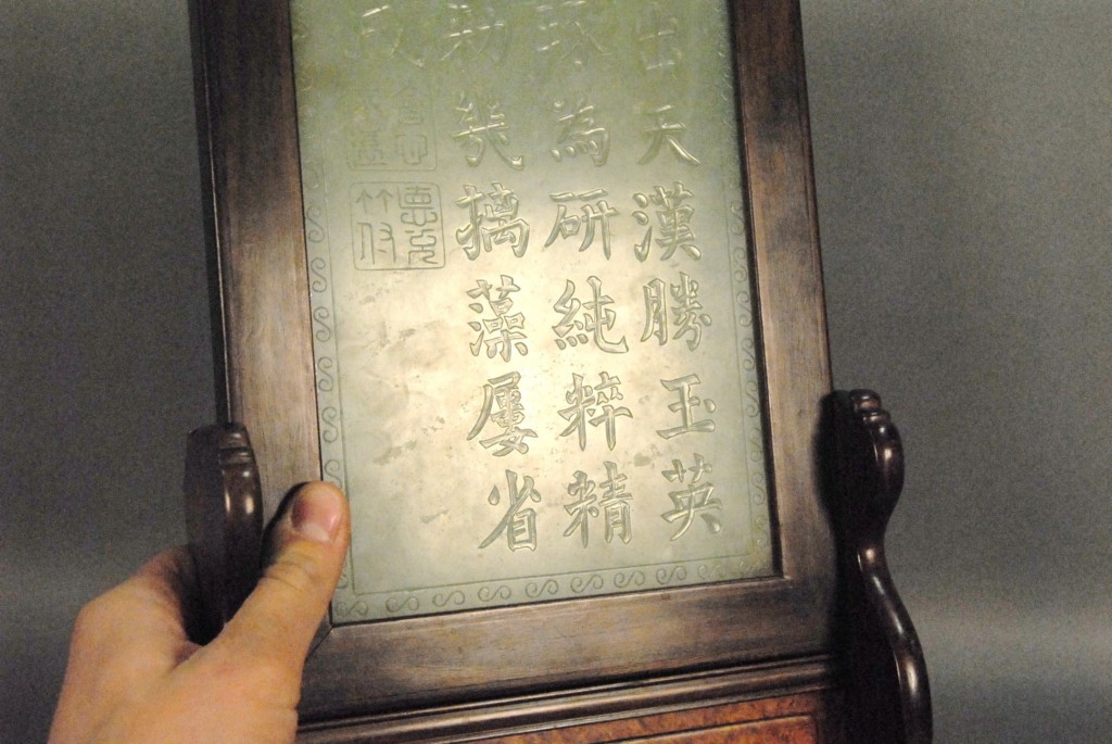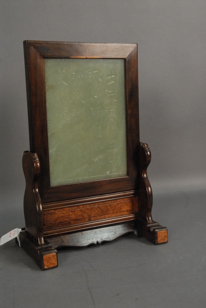 Celadon jade and hardwood table screen having front side carved with guanyin figure in a landscape and the back carved with characters and seal marks, framed with burl hardwood on standing base, total ht. 14 1/2, wd. 10.