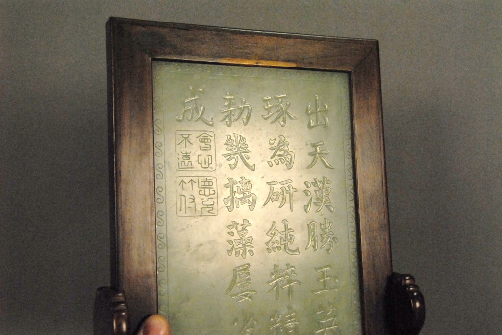 Lot 251: Celadon jade and hardwood table screen having front side carved with guanyin figure in a landscape and the back carved with characte…