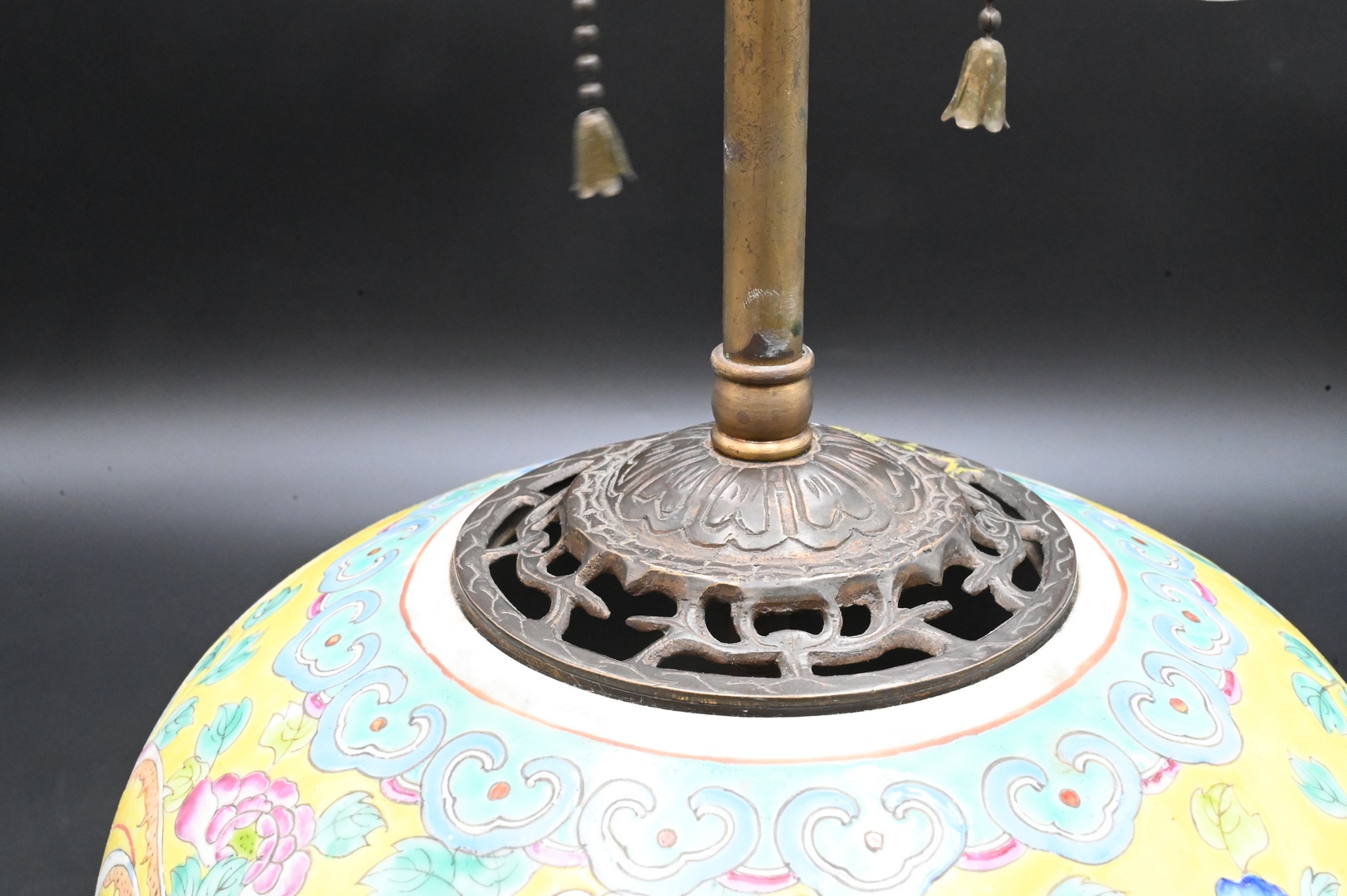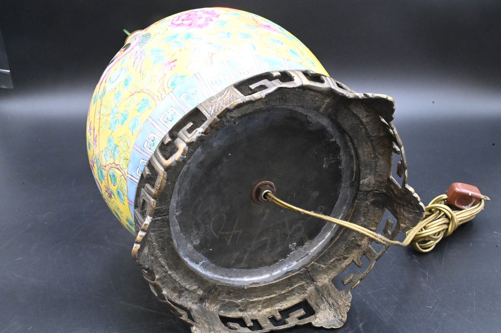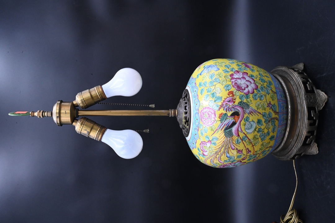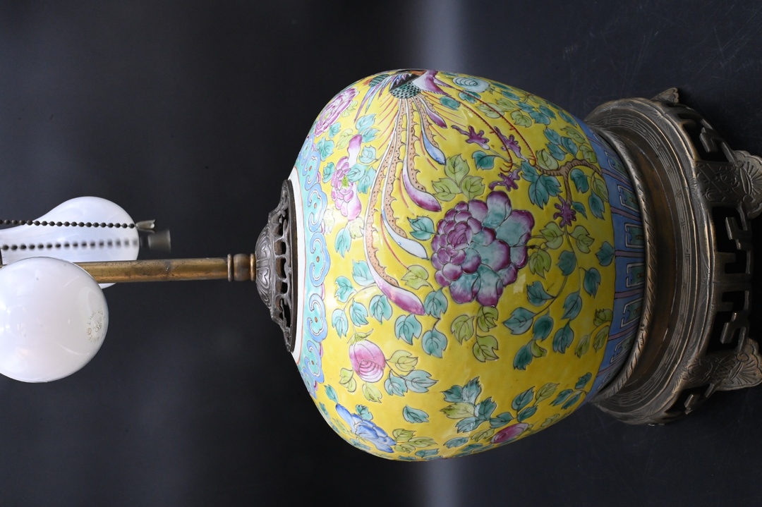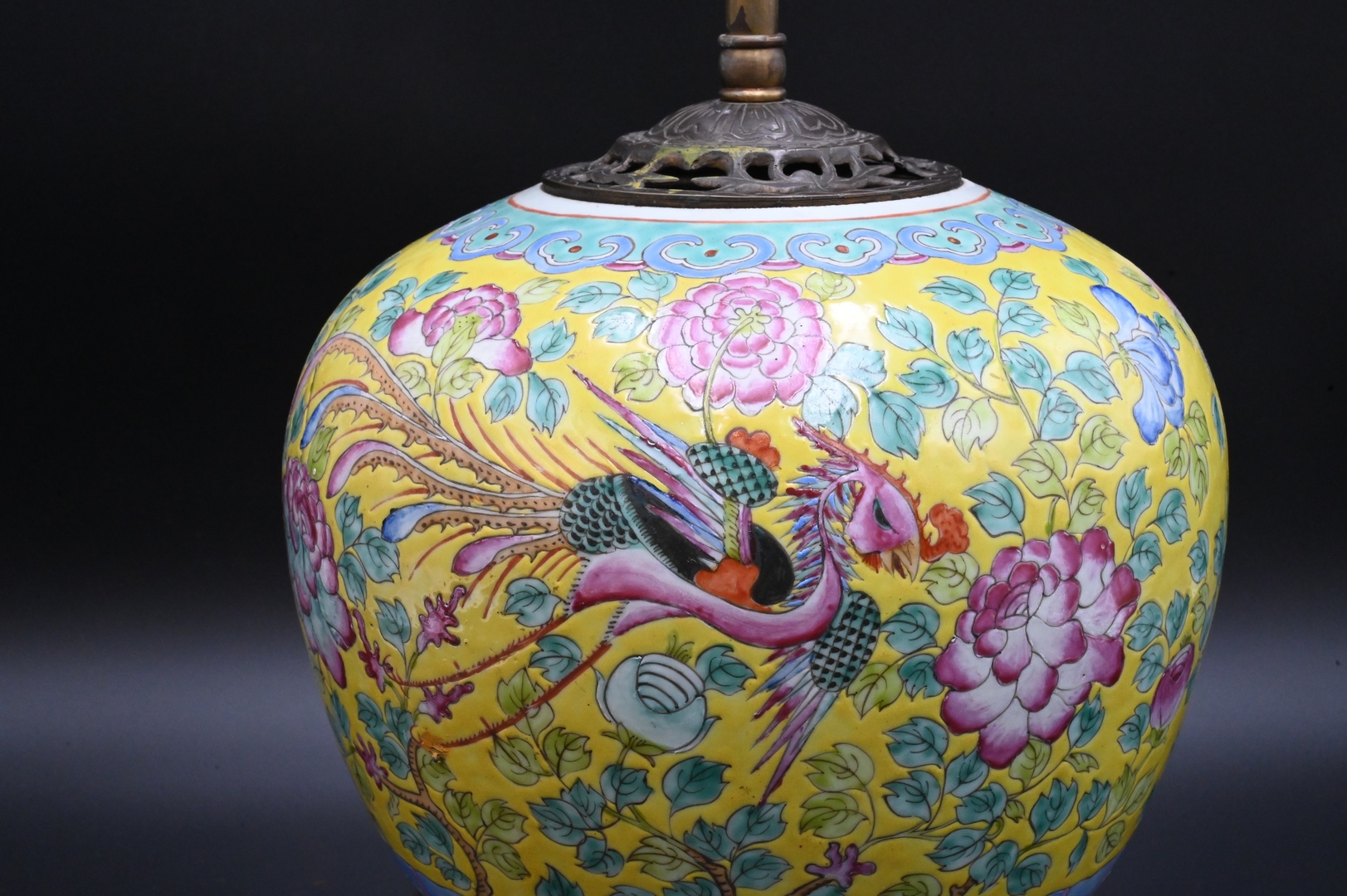 Chinese Famille Rose Covered Ginger Jar, made into a table lamp, having yellow ground with painted phoenix birds, blossoming flowers and leaves, vase height 8 inches.