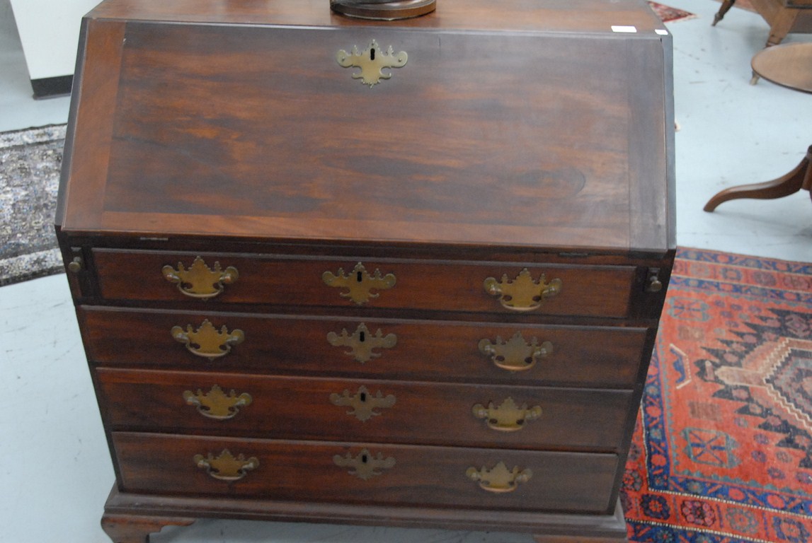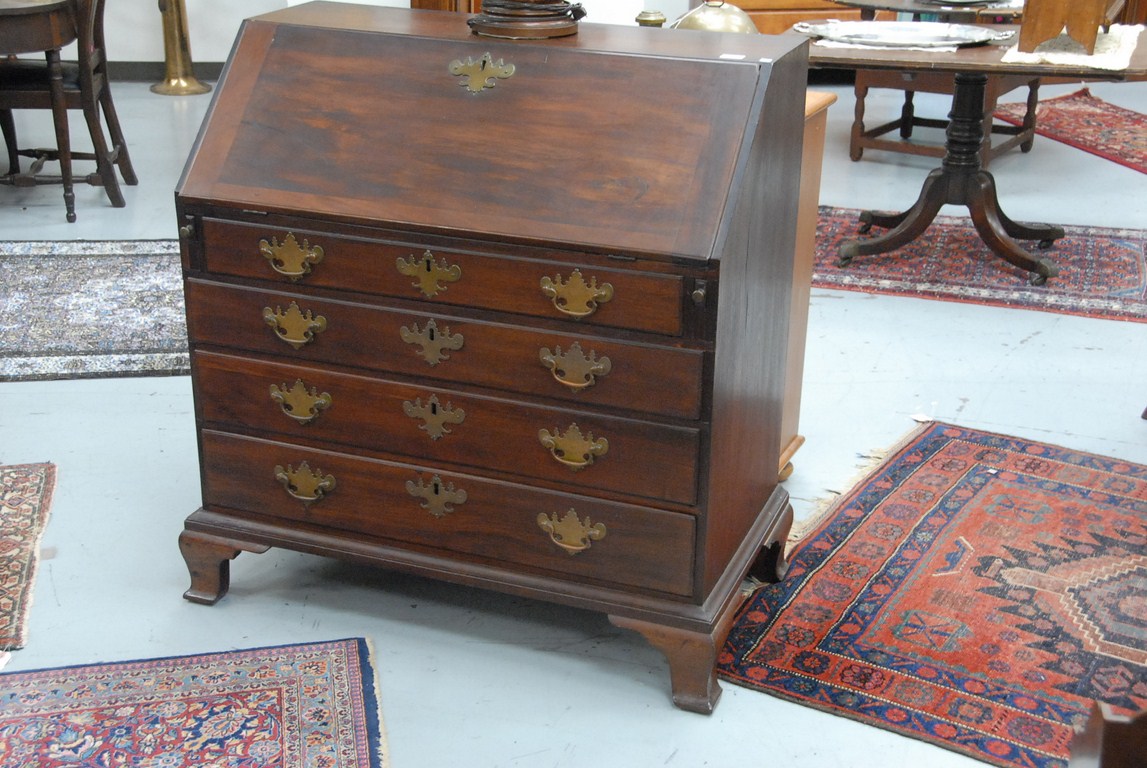 Lot 251: Chippendale desk with slant lid over four drawers on ogee bracket base and large original brasses. 42in. wd. 39in. dp. 21in. Being…