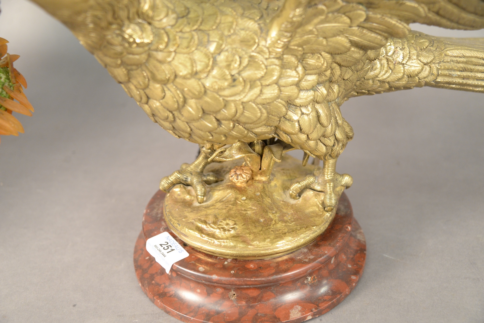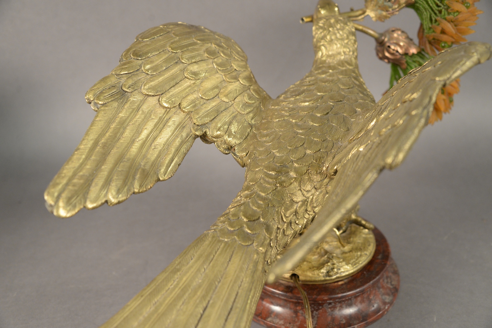 Lot 251: Gilt Bronze Eagle Form Lamp, having two lights with glass bead shades mounted on circular marble base, height 11 1/2 inches, width 12 inches, depth 19 inches.