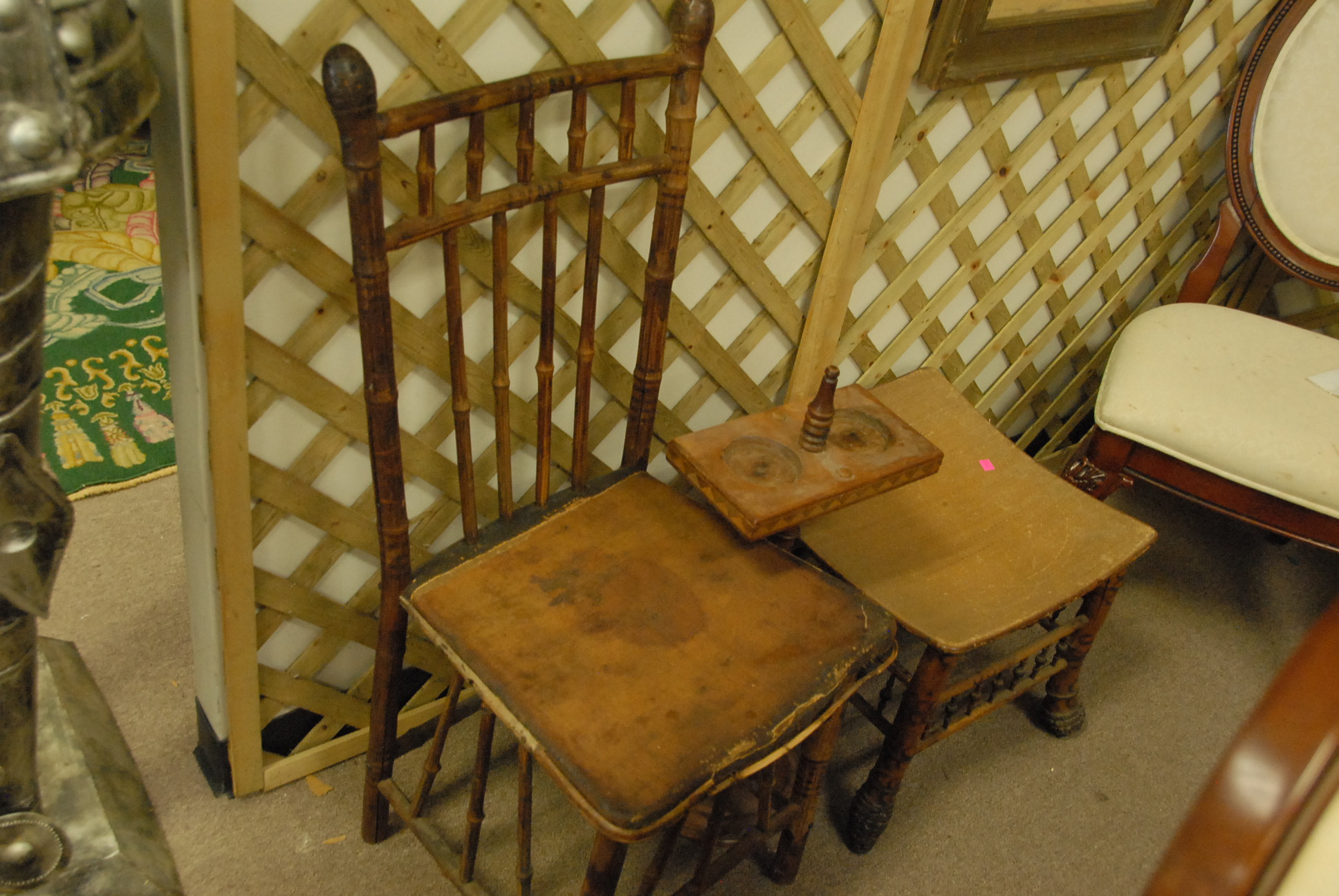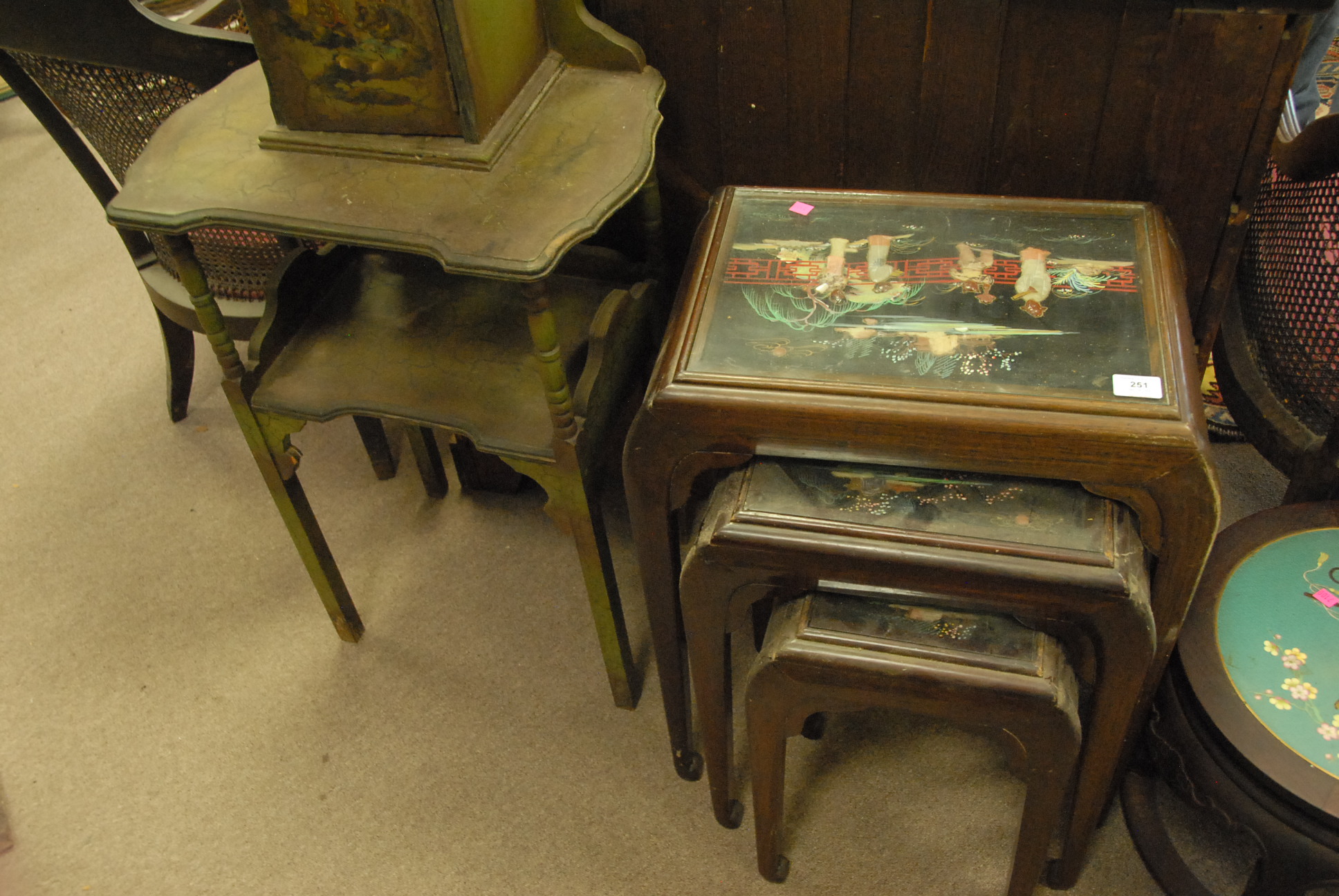 Lot 251: Group lot to include nest of three Chinese style tables with hard stone decorated tops, bamboo chair, footstool, and small stand.