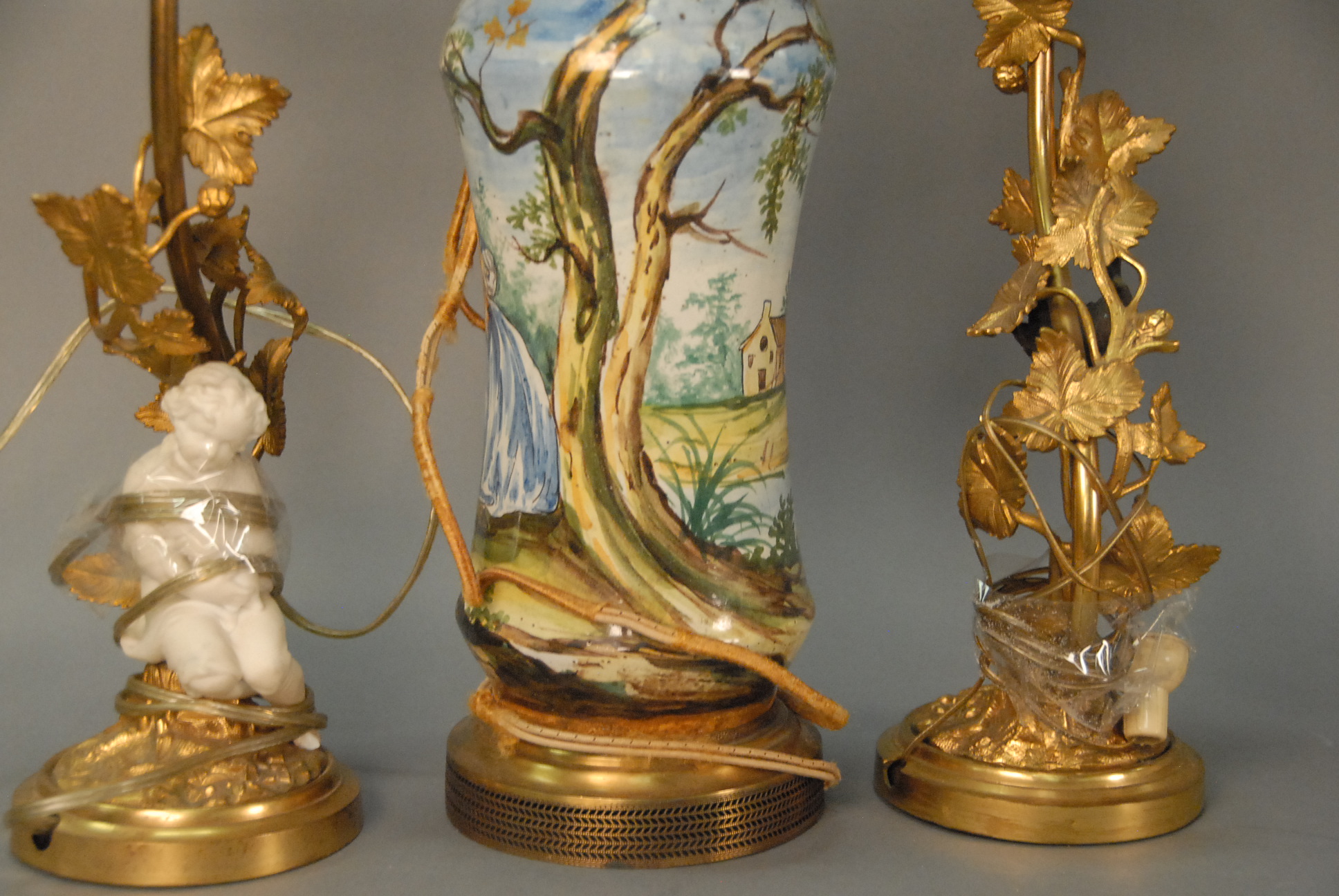 Lot 251: Group of three table lamps to include a pair of bronze leaf lamps ht. 27 and an Italian vase made into a lamp ht. of vase 12.