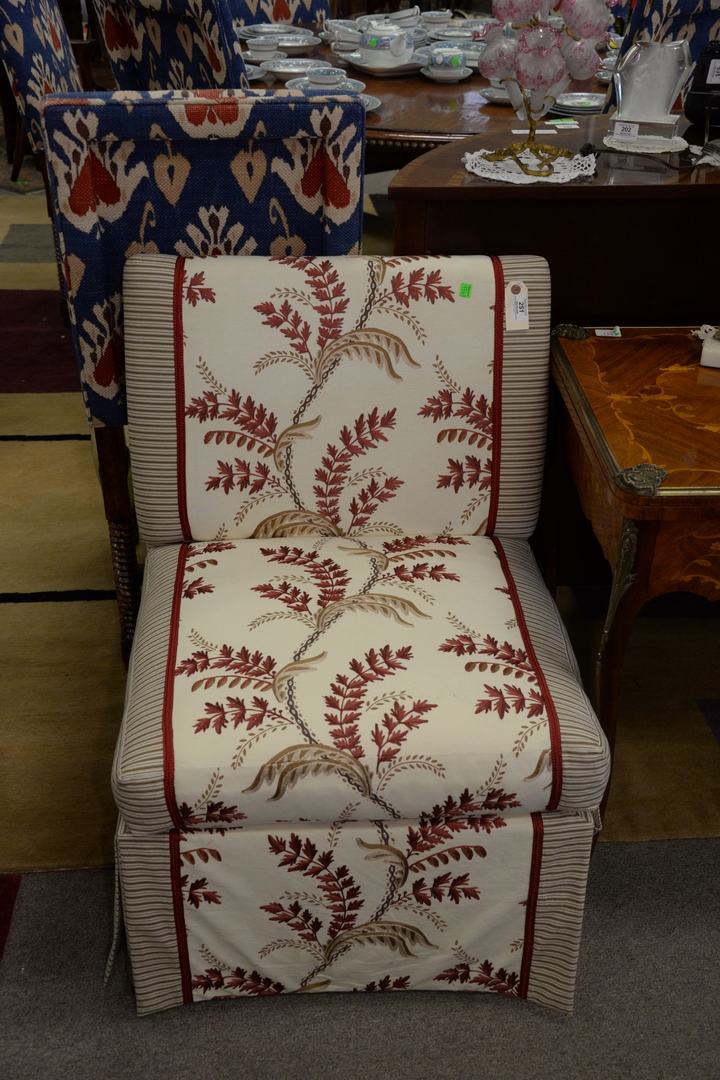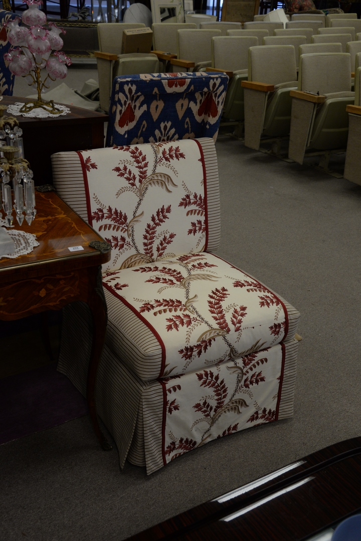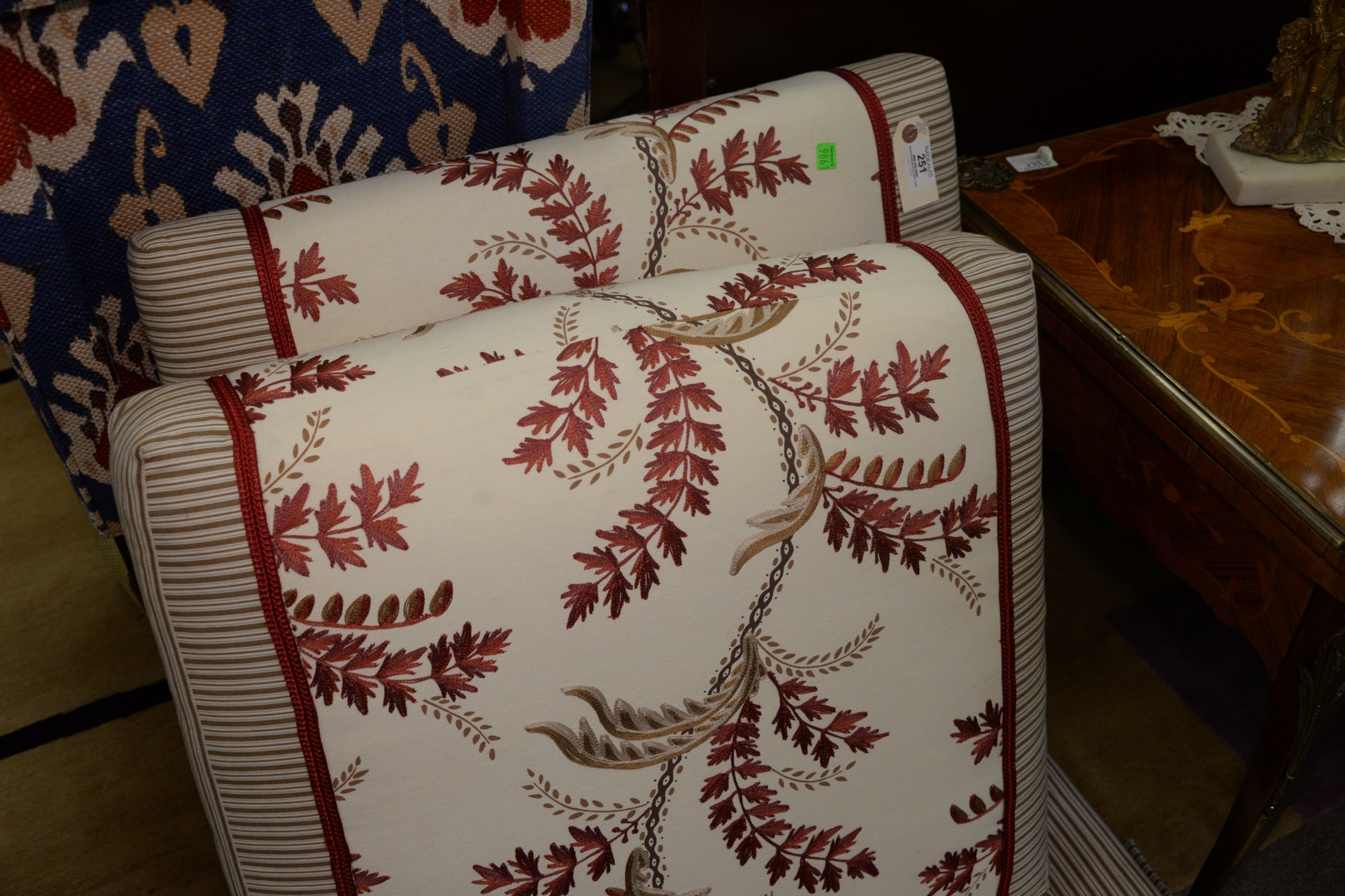 Lot 251: Pair of Custom Upholstered Armless Chairs, having embroidered center panels, height 33 inches, width 24 inches, (like new condition). Provenance: David and Cynthia Kim, 22 Stoney Wylde Lane, Greenwich, Connecticut. View home by visiting: https://www.zillow.com/homedetails/22-Stoney-Wylde-Ln-Greenwich-CT-06830/177238281_zpid/